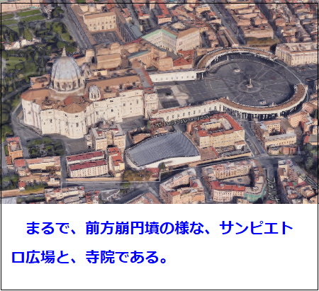 この「歴史の論客達」と言うカテゴリーは、私が、すごいと思った、世間にあまり知られていない、歴史研究家や、その説を紹介する為に設定したものである。 ここでは、私自身は、コメントや、感想を入れたりする事に徹する。 今日の「歴史の論客達」は「神武の子孫」と名乗る女性と、彼女に取材を試みる「竹取翁博物館」の館長である。 この二人が、今日のゲストであるが、特に、この女性の、知識のすごさは、並大抵ではない。 動画を観て、おそらく、多くの人は、そう感ずるだろう。(1) バチカンに、前方後円墳が在った。 バチカンに、前方後円墳らしき形のものが在った。 バチカンが現在、存在する場所は、3000年ほど前に、埋葬都市「ネクロポリス」であったが、ローマ時代にも、墓地として使用されていた。 ここが、カトリックの拠点になったのは、ローマ帝国の皇帝「コンスタンティヌス1世」が、326年に、教会を建てた事に始まる。 この地には、キリストの弟子である12使徒の一人、「ペトロ」の墓も存在している。 おそらく、それが、この地に、教会を建設しょうとした最大の理由であったと思われる。 現在の建物の全てが、何時ごろ建てられたかは、分からないが、サンピエトロ広場を、上空から見ると、前方後円墳の形と、そっくりである。 仮に、この広場が、創建当時にさかのぼるとしたら、326年に前方後円墳が作られたか、あるいは、それを象ったデザインがほどこされた事になる。■ 日本に在る、仁徳天皇の、前方後円墳。 これは、私の先祖の墓でもある。 この地は、元々、墓地であったので、古墳があってもおかしくは無い。 日本の古墳の起源は、現在の所、1~2世紀にさかのぼるので、日本の古墳の方が古いと言う事になる。 この、326年と言う時代は、日本では、仁徳天皇の時代位だろう。 日本から、前方後円墳が、イタリアに伝わったのか? 仮に、ギリシャ時代から、このデザインがあるとすると、最大、3000年位までさかのぼる事になる。 「モーゼ」と、日本の天皇の娘、「いろは姫」が結婚し、その息子が、これを作った、と言う説がある。 これは、自称「神武の子孫」と言う女性が、そう述べているのである。 ともあれ、その説が述べられた動画を掲載する。(2)動画の内容の紹介。■ 超古代文明 297A2「モーゼとイエス、いろは姫の子がローマ・ギリシャ・エジプトへ」竹取翁博物館(国際かぐや姫学会)2016.8.30 さて、動画の内容は、次の通りである。 これが、「竹内文書」など、他の古史古伝と、どう言う関係があるか、分からないが、何か、それに近い学説と思われる。・ 「モーゼ」や、「キリスト」は、日本に居た。・ 「モーゼ」の妻は、日本の「かんたらわけ天皇」の娘、「いろは姫」である。・ その二人の間に生まれた三人の子が、それぞれ、ローマ、ギリシャ、エジプト文明を作った。・ それらの文明の言語は、日本語が起源である。・ 日本には、2000種類の古代文字が有ったと言う。・ 彼女が言うには、奈良に遷都する前は、神奈川県に、日本の首都が在ったと言う。・ 万葉集などに出て来る、天の香具山は、富士山である。・「大化の改新」も、神奈川県で行われた。・ 考えてみれば、奈良は、建設中の都で、いきなりは、住めなかったと考えられる。・ モーゼは、いろは姫と日本に戻り、孫を連れて帰った。・ 第二次世界大戦後、マッカーサーが、モーゼの骨を発掘。 モーゼは、180センチ程の身長だったらしい。・ それが、アメリカの新聞に掲載された。(3)この動画の特徴。 答える女性の知識がすごい。■ 超古代文明246A「八雲(ヤコブ)大神、イエスの先祖が来ていた、古代ロケットの浜降行事で神輿が40来揃う、神奈川県茅ヶ崎市 」竹取翁博物館(国際かぐや姫学会)2016.7.22 この動画は、「竹取翁博物館」の館長が、「神武の子孫」に取材する、と言う形式で進行する。 館長が、矢継ぎ早に質問を連発し、まるで、あらさがしをしているかの様にも思えるが、「神武の子孫」は、ためらう事無く、即座に、知識の洪水の様な、答えを返してくる。 それが、何度も繰り返され、まるで、難攻不落の城塞である。 一方、館長は、その知識の洪水に流されそうになるが、めげずに、質問を繰り返すのが面白い。 それは、まるで、卓球の様なイメージを受ける。 「ああ言えば、こう言う」と言う様な感じではあるが、実に驚くべき研究家である。 この動画以外にも、シリーズとして、まだ、他にもあるが、全て、こんな感じである。 取材に応じている「神武の子孫」は、言語研究家らしいが、その素性は、よく分からない。 一見、パートの、おばちゃんの様な、印象を受けるが、実に、すごい知識である。 その知識は、何処から仕入れたのか? また、彼女は、一体、何所の大学を出ているのか、知りたい所である。(4)「竹取翁博物館」の館長について。■ 竹取物語③ 五人の貴公子「燕の子安貝」(竹取翁博物館) 上の動画は、「竹取翁博物館」の様子である。 来客に説明