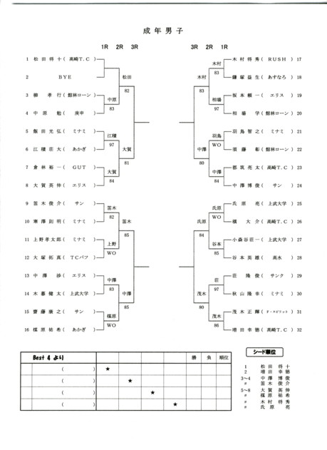 今日は天気の悪い中、どうにかテニスができました。バックハンドのストロークがフェデラー張りに完成しつつあるぞぉ~。これに磨きをかけてスライスもちゃんと打てる様になりたいな。そんで国体成年予選ベストeightが決まったので載せてみたいと思います。このレベルの試合は普通見られないでの来週はみに行きたいなぁ~。
