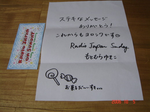 わーぃ。日曜の朝のFMRADIOの番組でRADIO JAPANという番組がありました。先週で最終回だったのですが、本村由紀子さんがパーソナリティーで選曲もよかったしなにより本村さんのキャラが愉快でした。最後の最後でステッカーをもらえました。嬉しぃ~。本村さんのブログです。本村由紀子