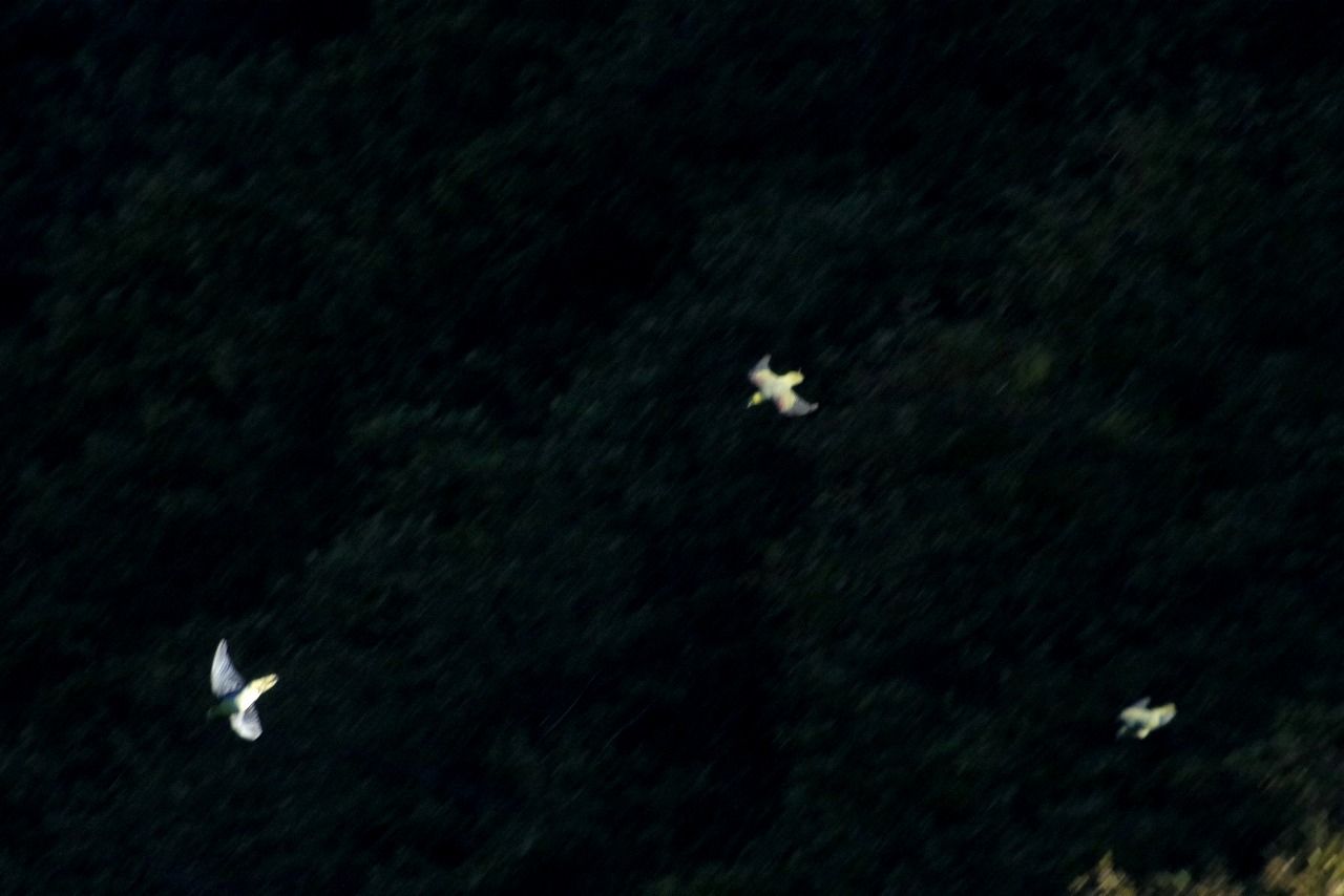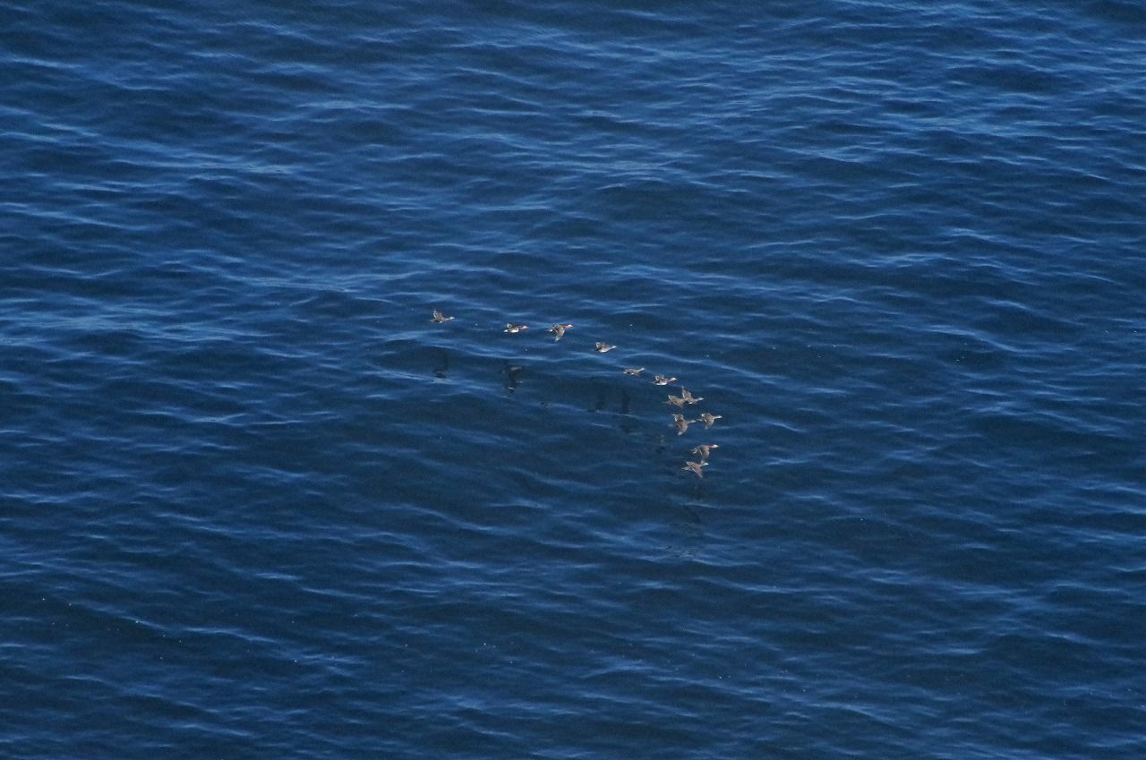 海面近くを飛ぶカモ類の群れ。拡大すると、何とオシドリだった。これも珍しい。