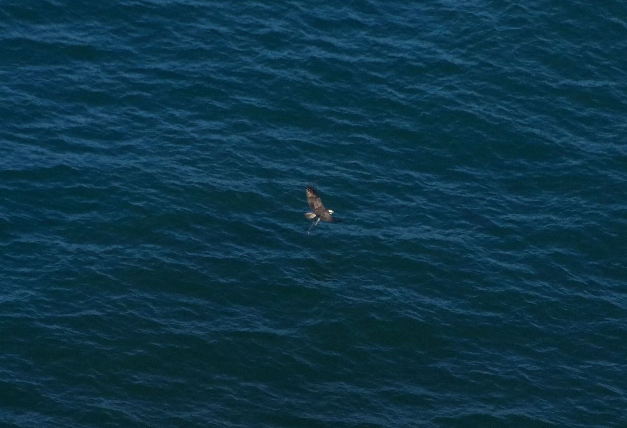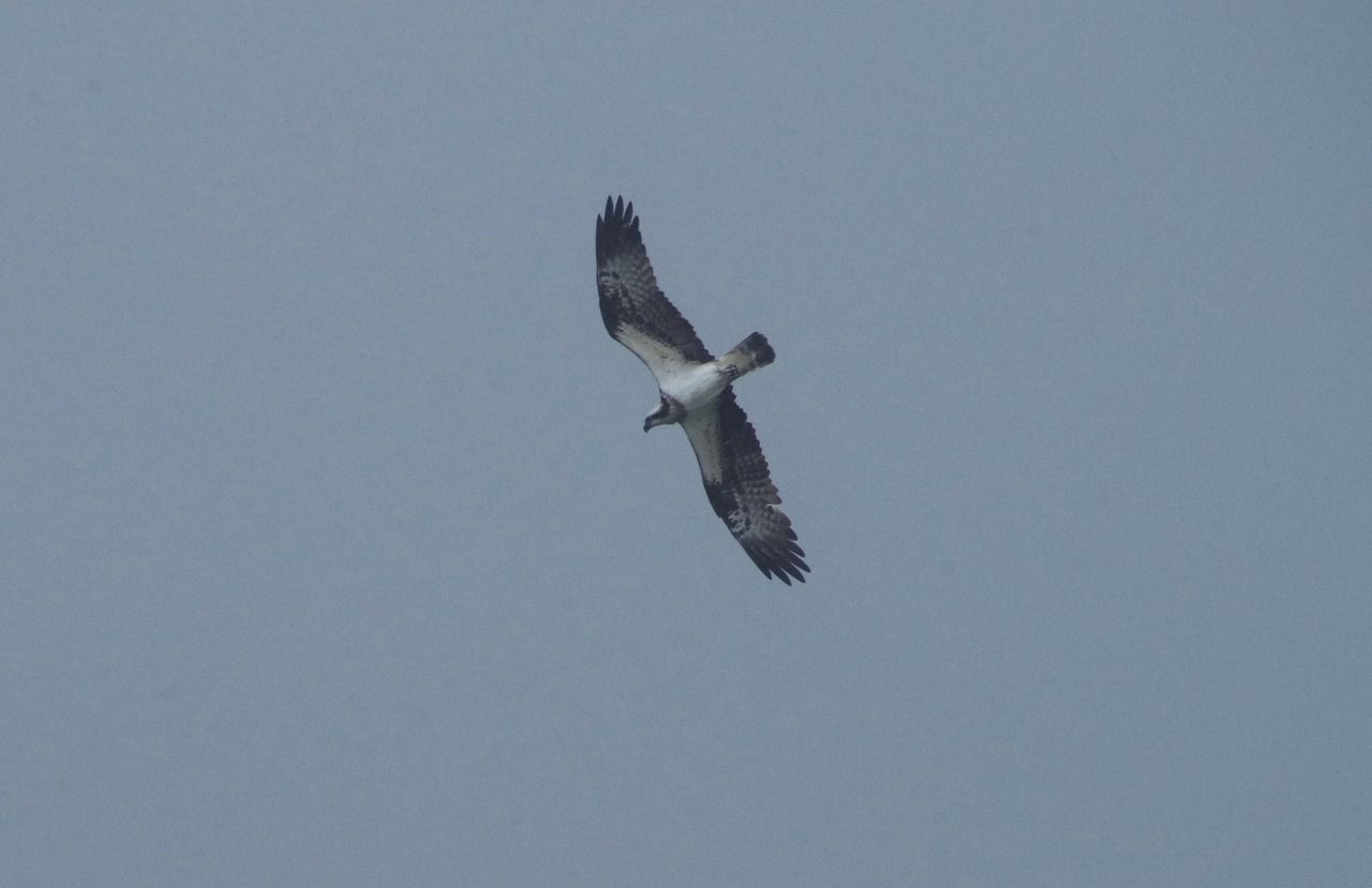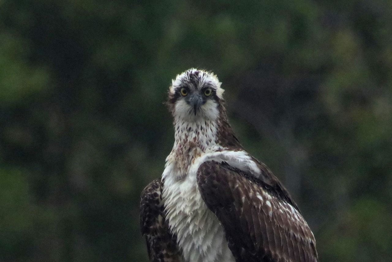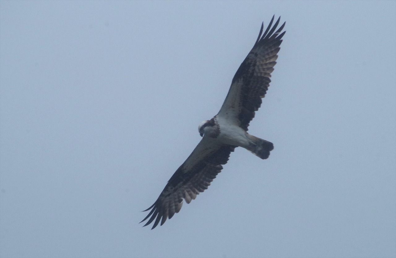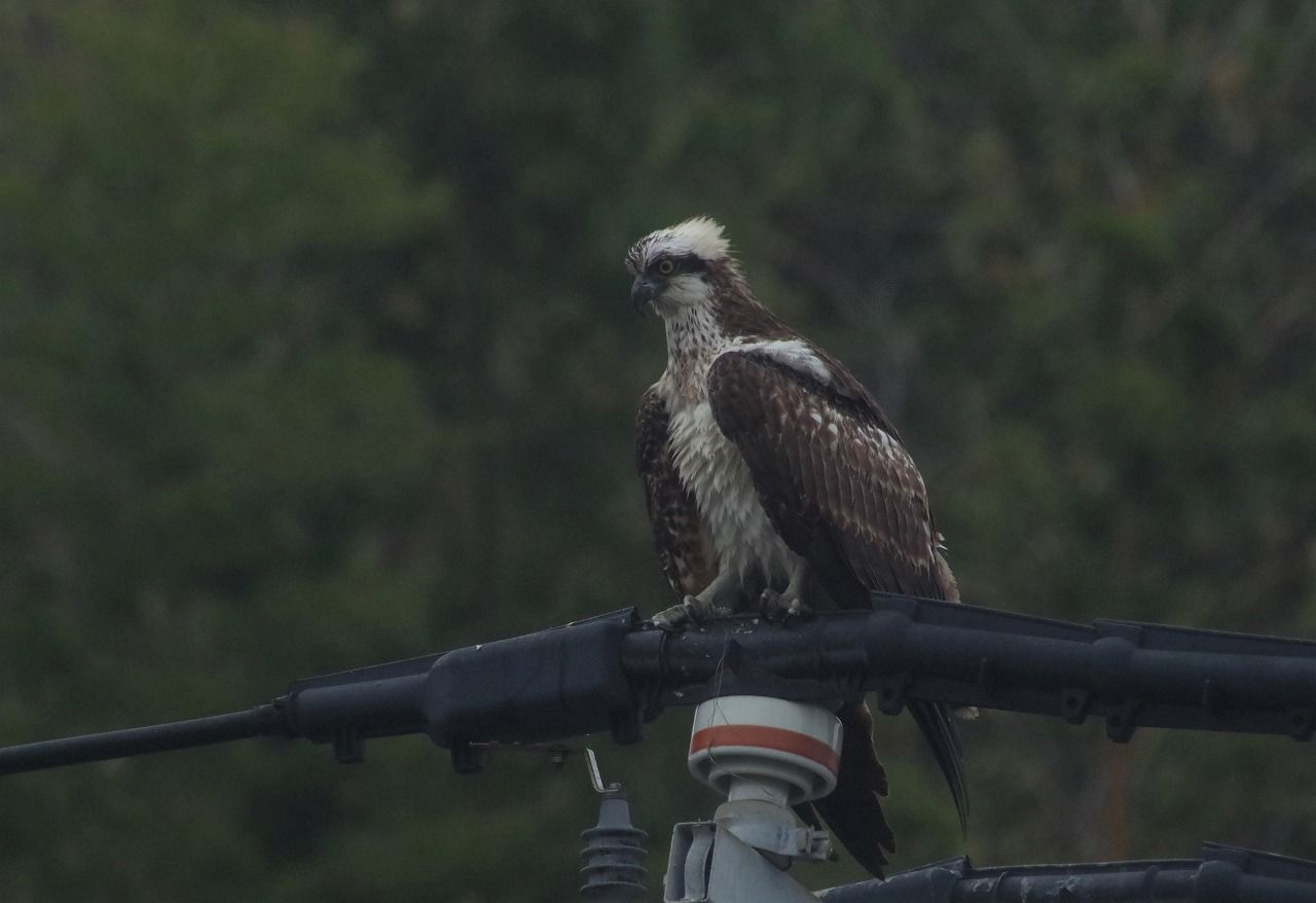 電柱に止まるミサゴ。胸の羽毛は黒くなく、翼に白い羽毛が見えて、この春生まれの幼鳥と思われる。