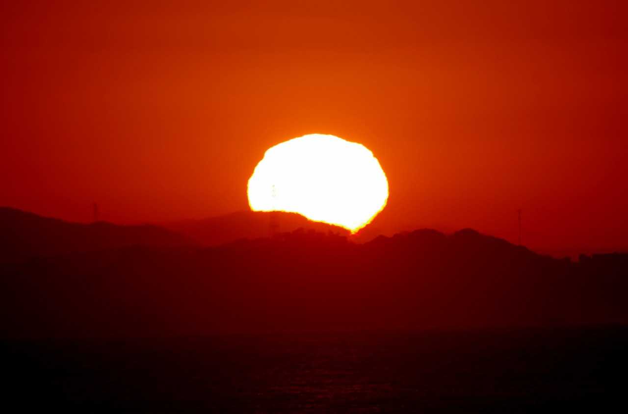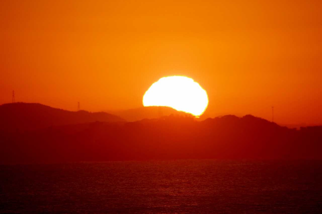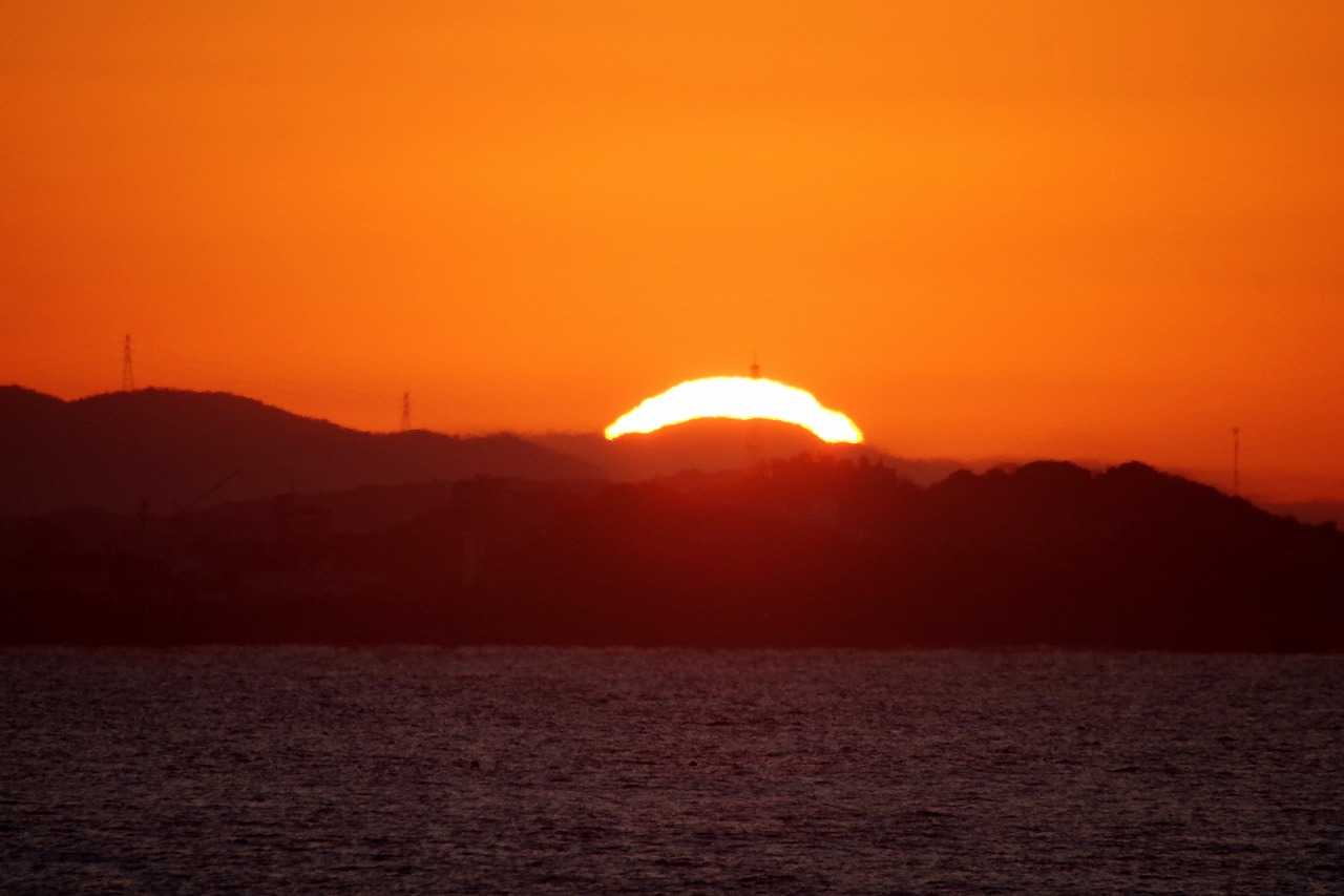 冷えた大気が揺らめいて太陽は楕円になり周縁がいびつになっている。