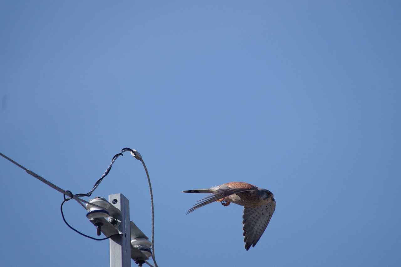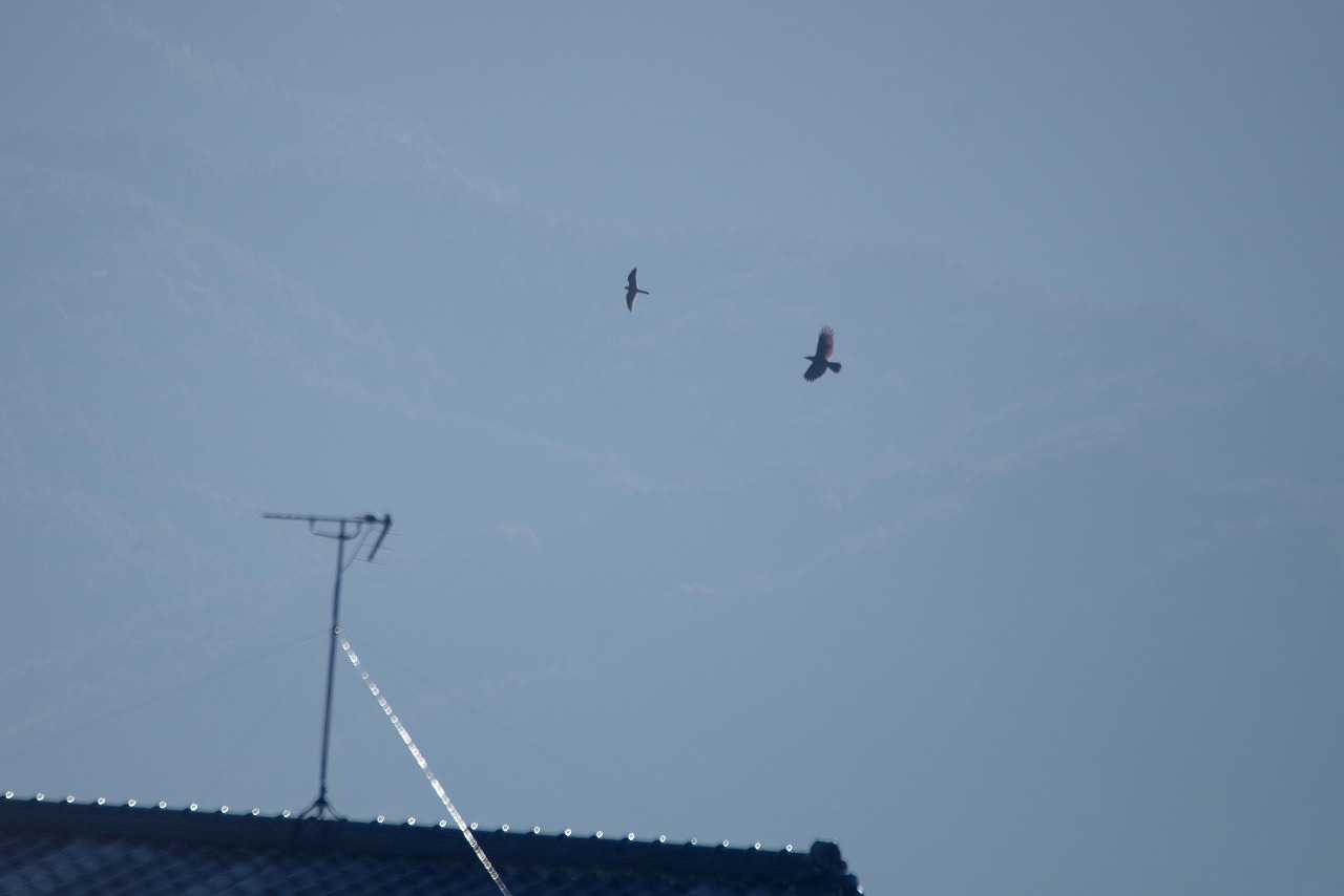しぶとく食い下がるカラスに逃げる一方のチョウゲンボウ。