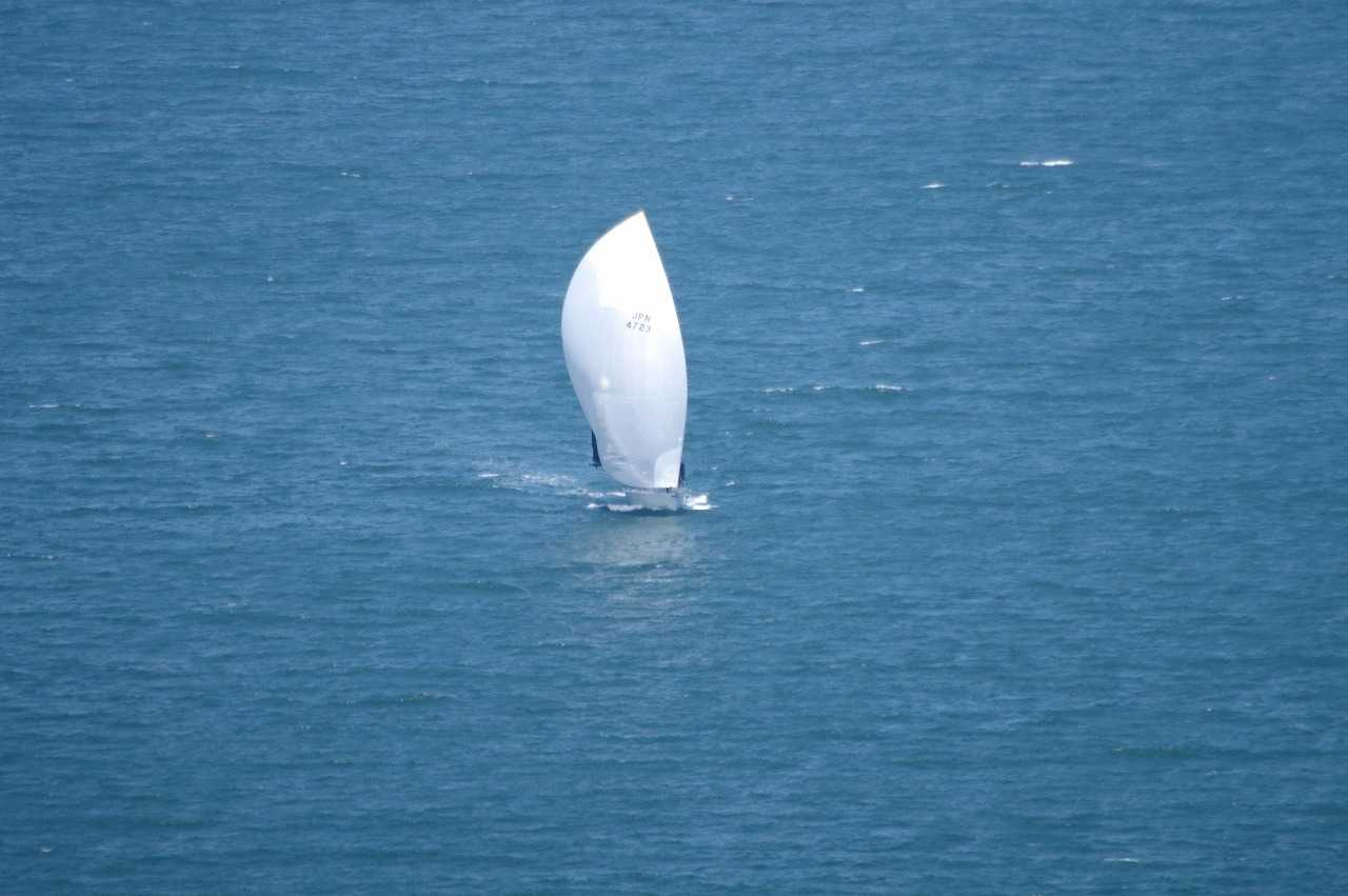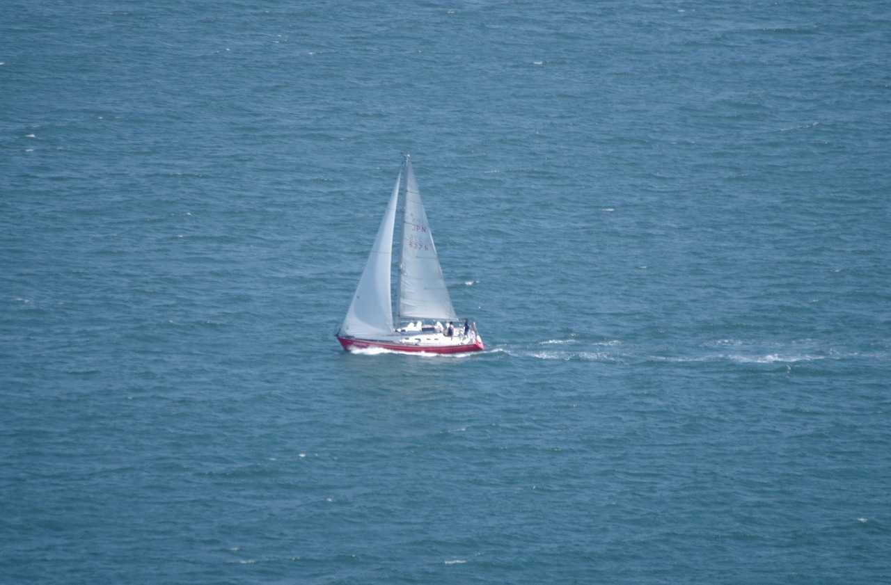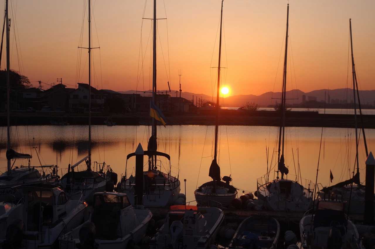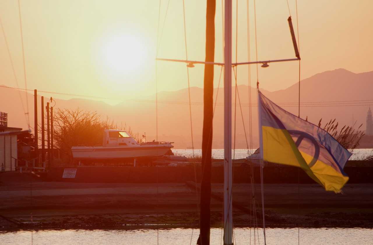 橋を渡ってすぐ右手にある浜崎港に係留されているヨットの1隻にウクライナ国旗とピースマークを合体させた旗が翻っていた。