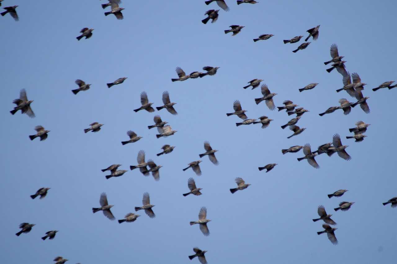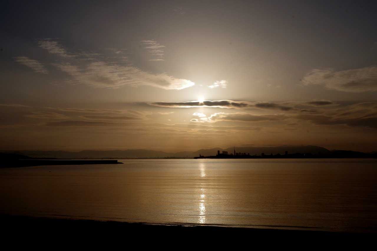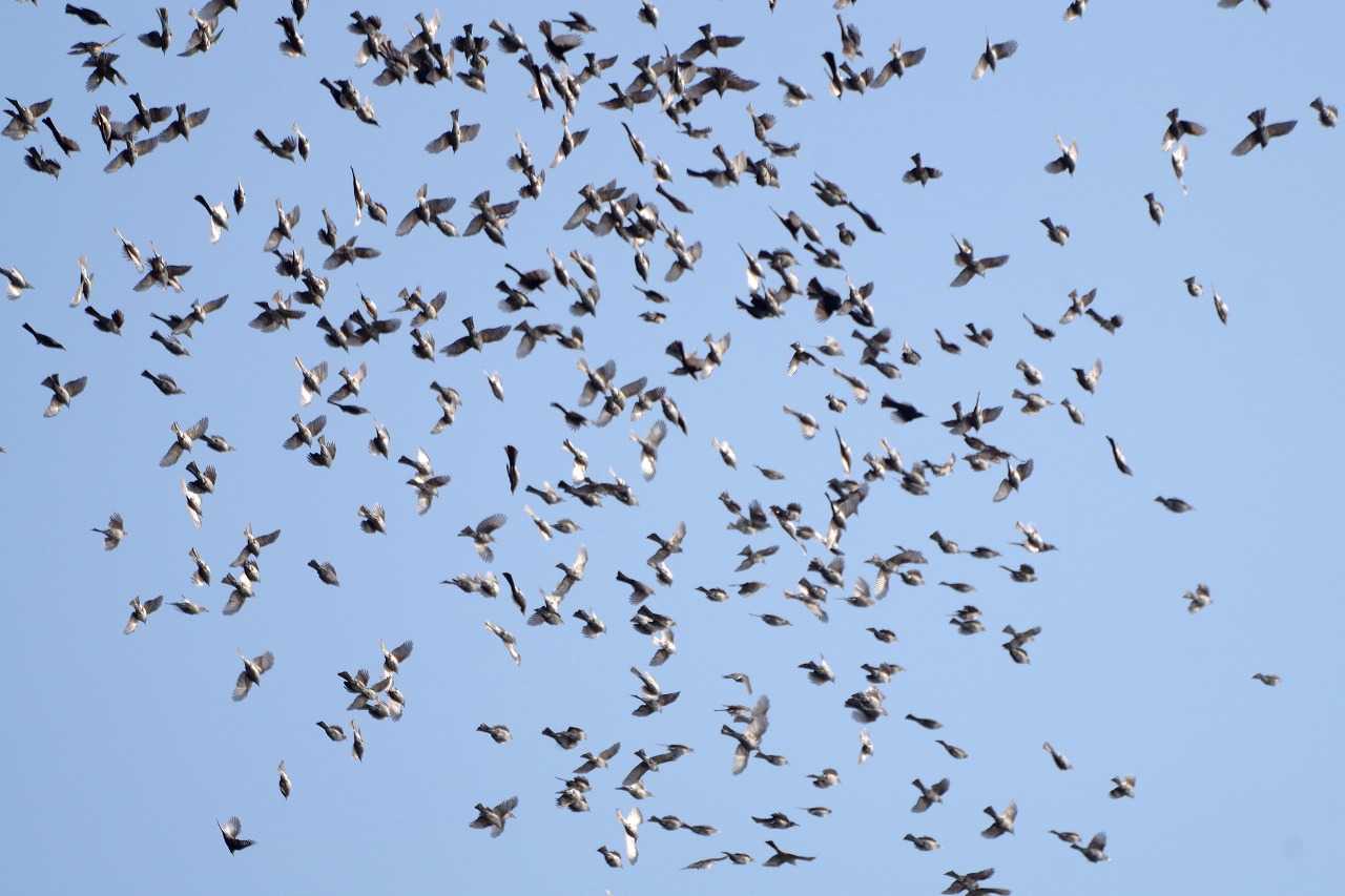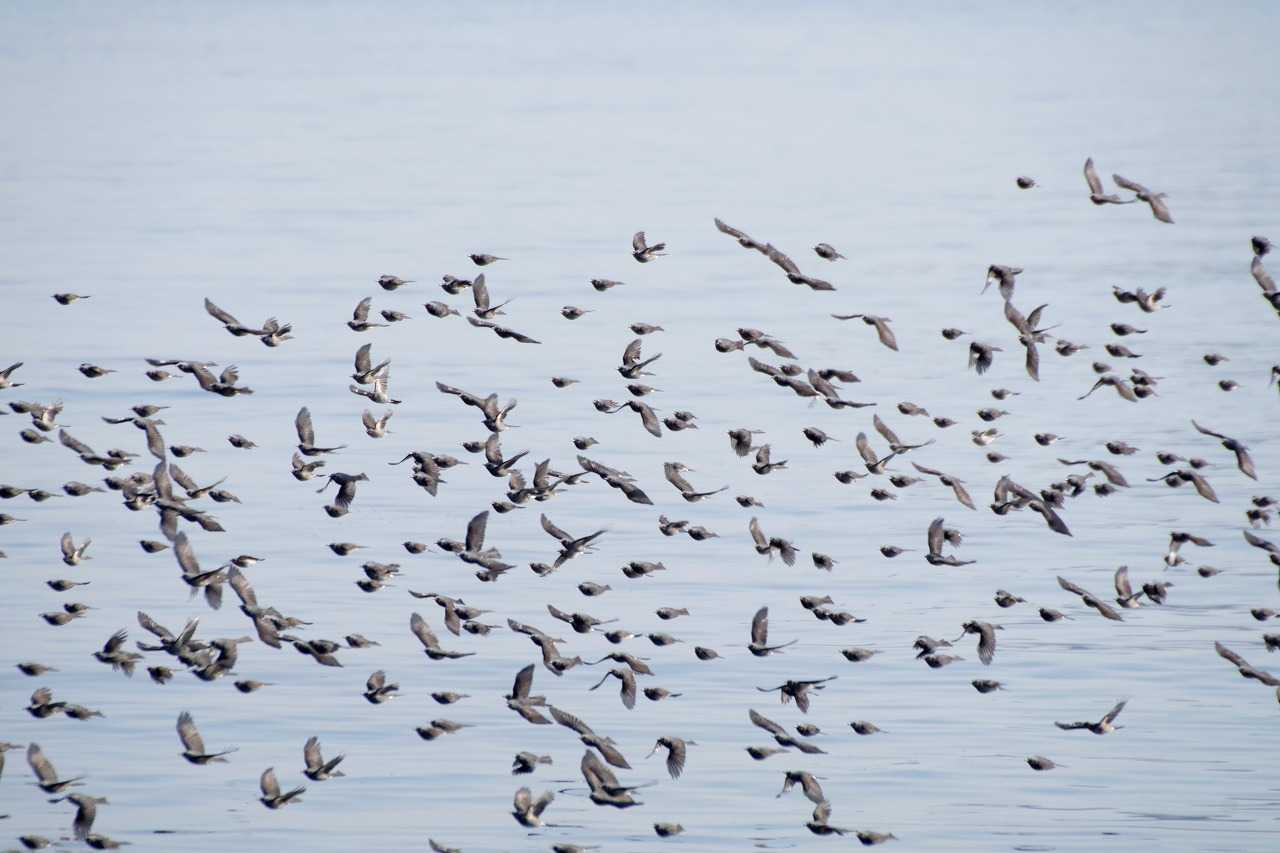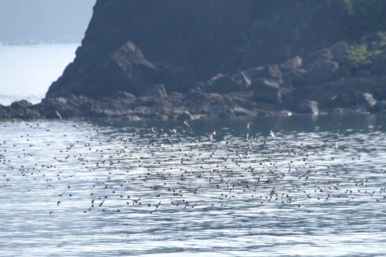 海を渡るヒヨドリの群れ。ハヤブサに襲われず能古島へ渡った。そこから志賀島へ渡る。