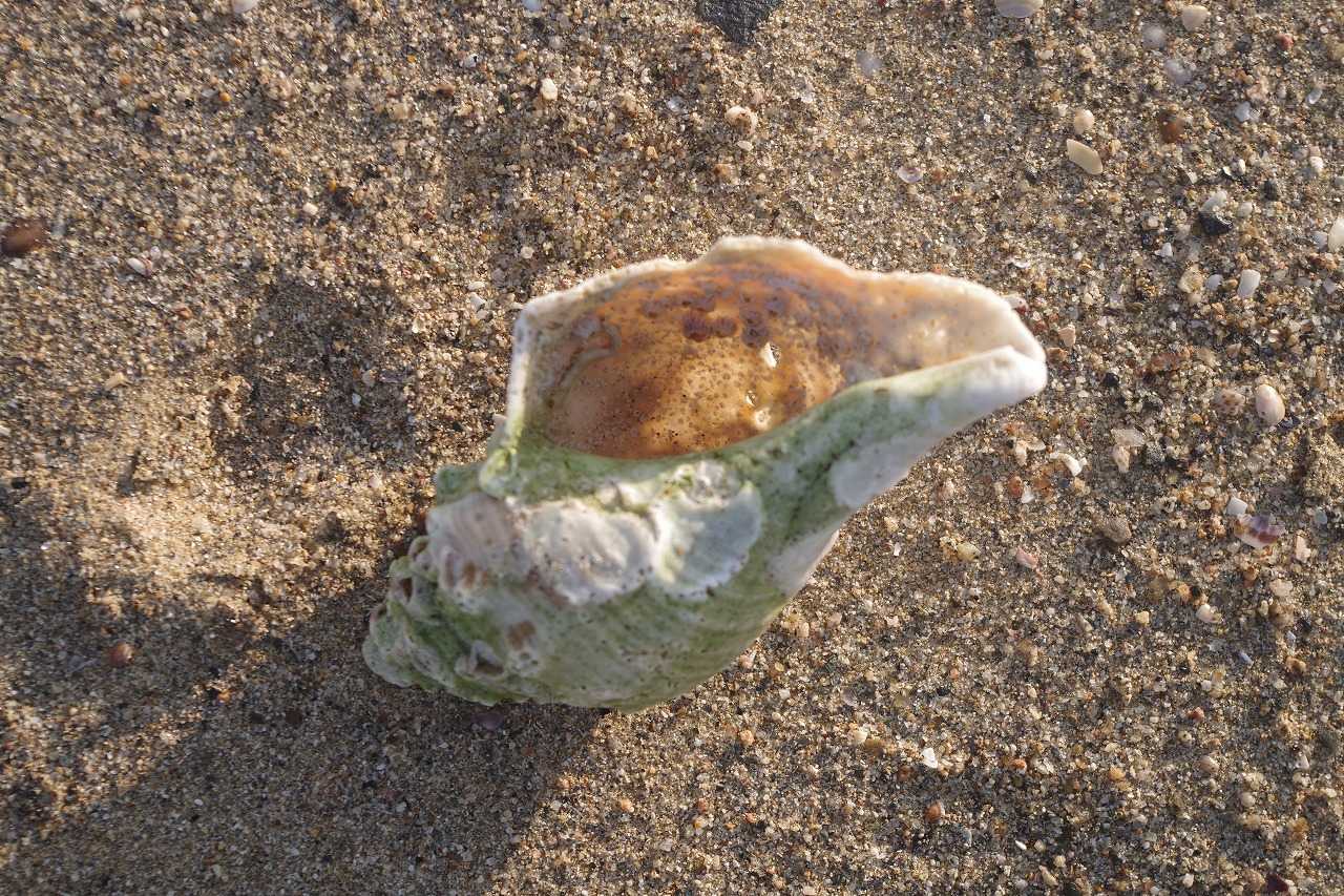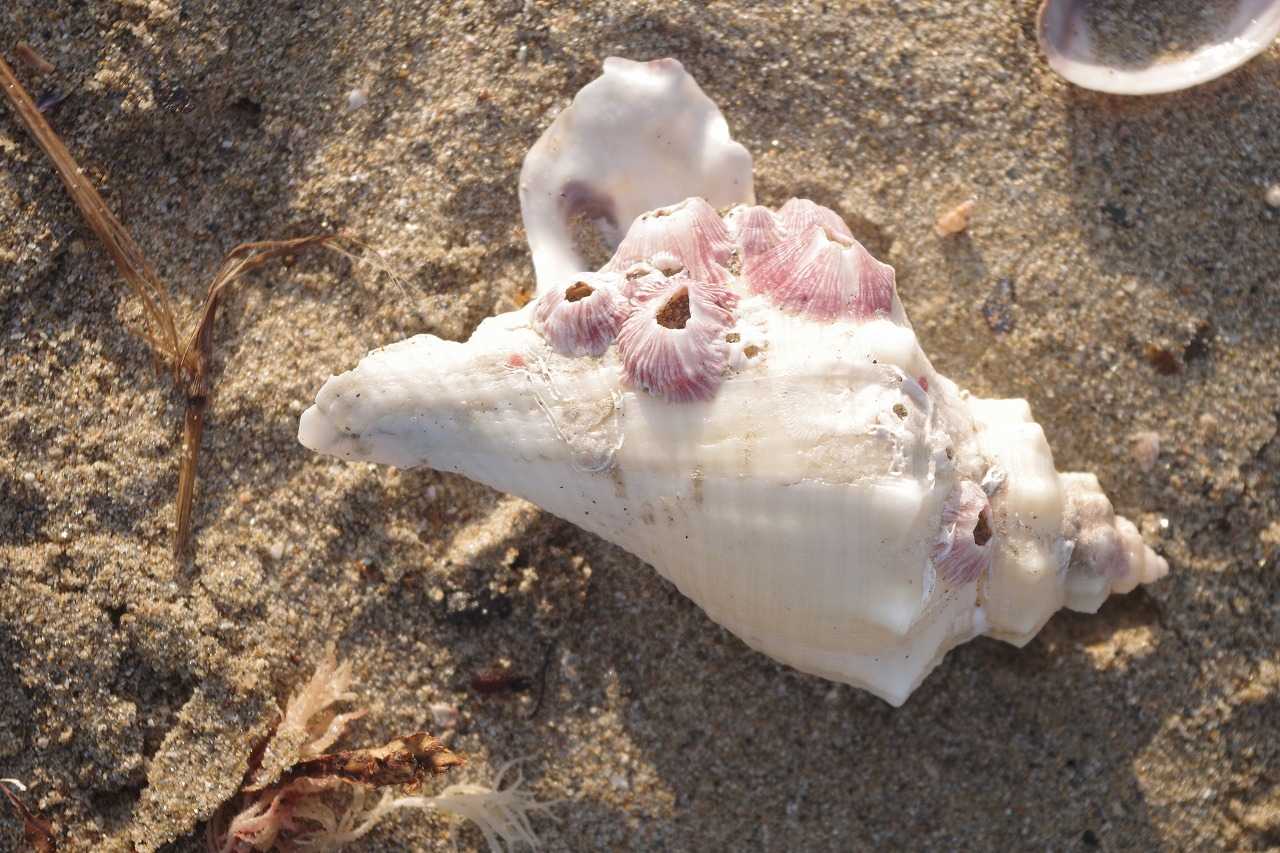 フジツボが付着したテングニシの古い貝殻。