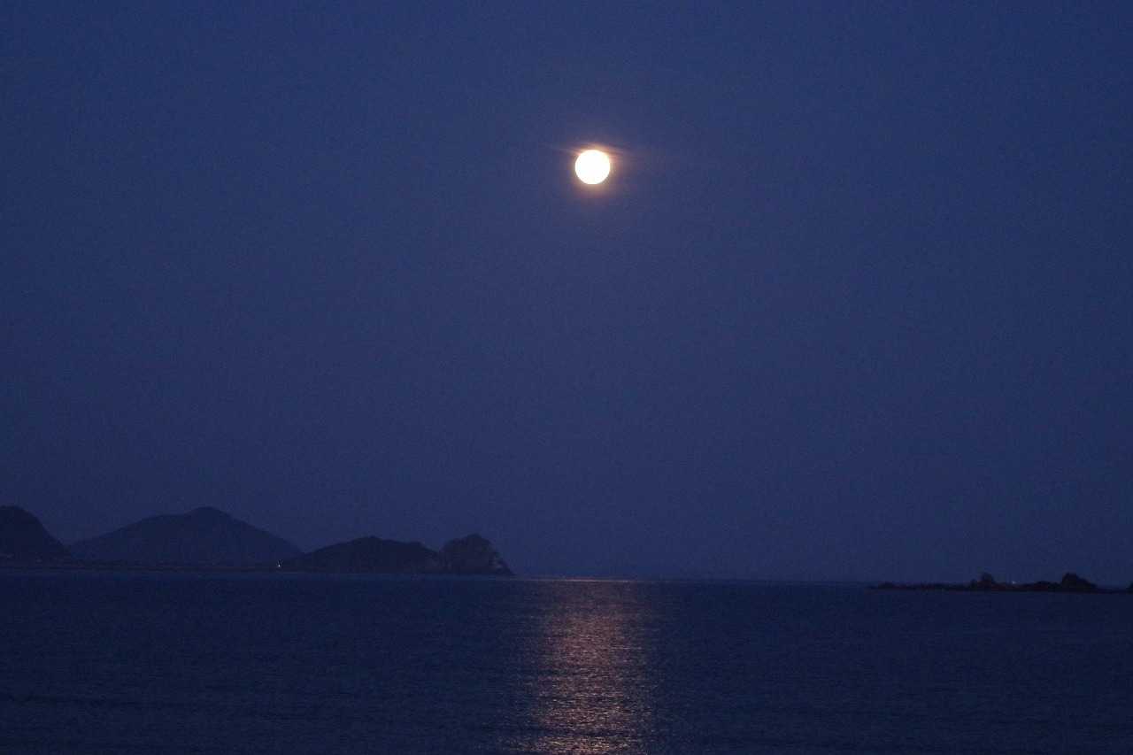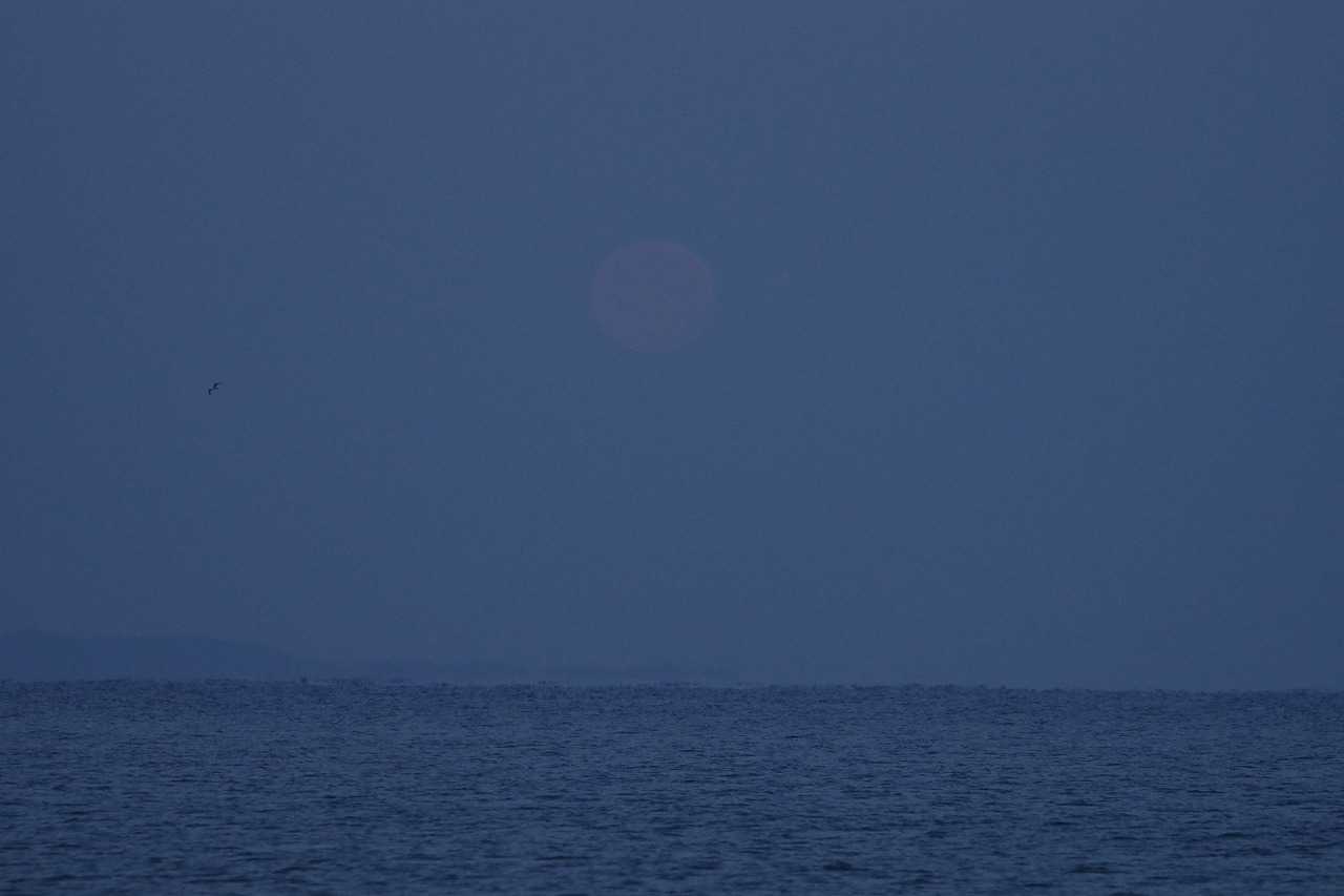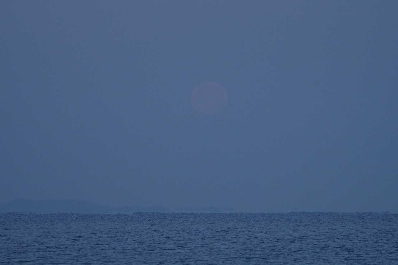 水平線よりまだ高い位置で満月は次第に影が薄くなり、海に没する前に見えなくなった。