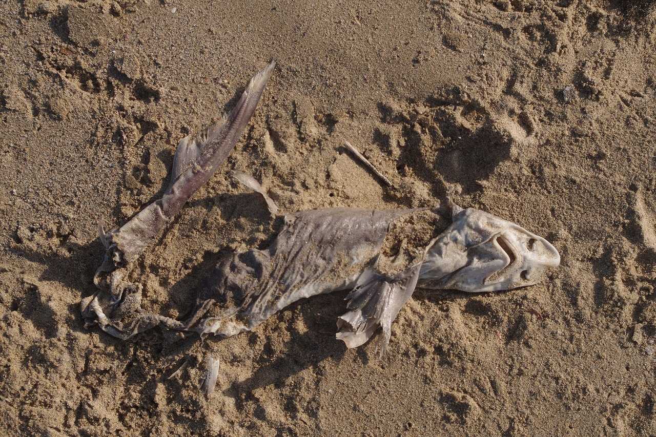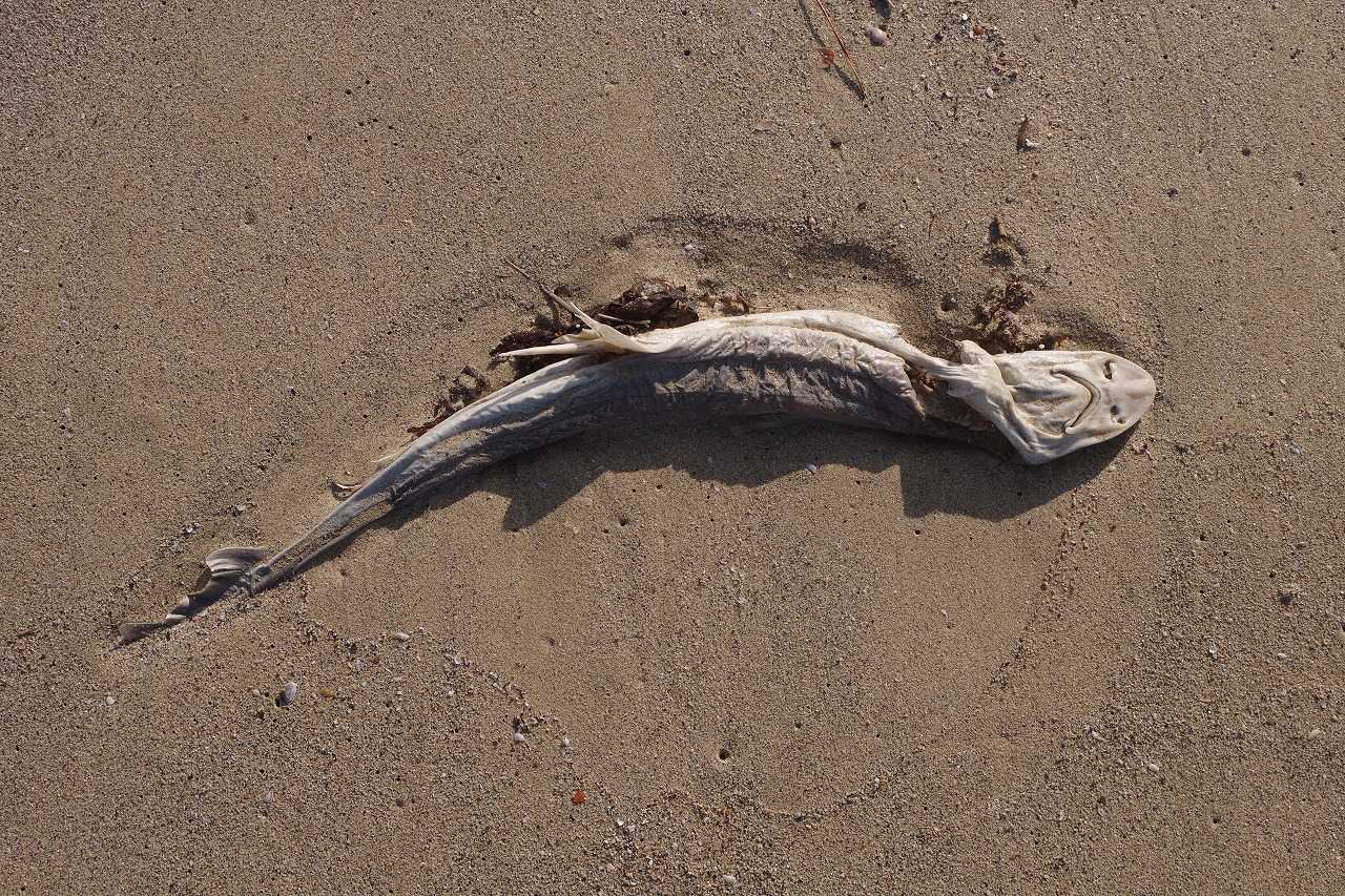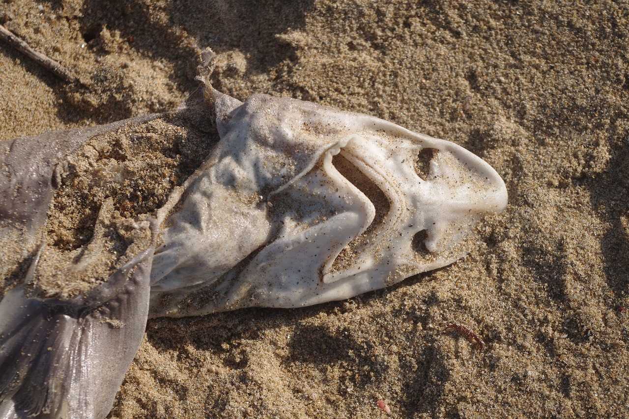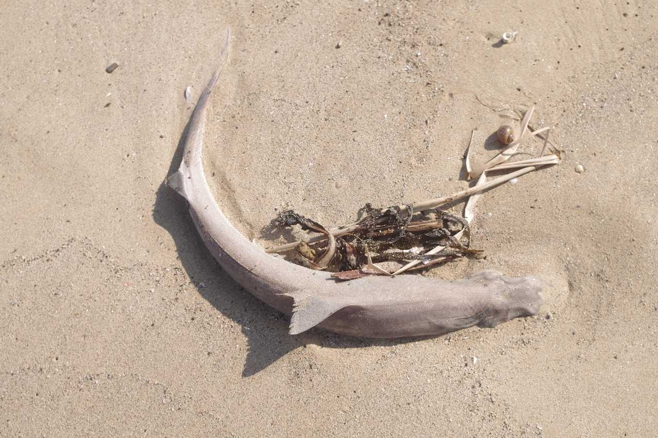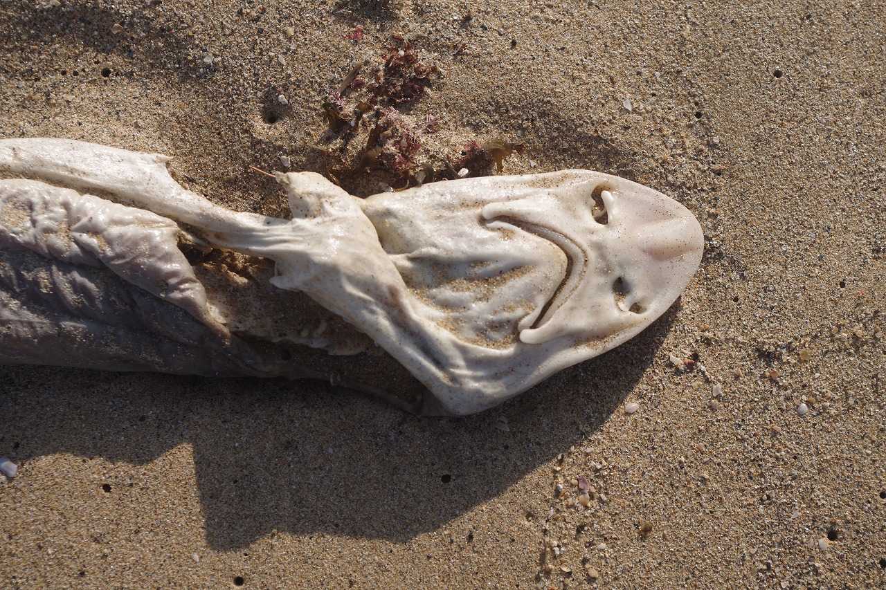 ドチザメ科のサメが打ち上げられてカラスの餌食になっている。