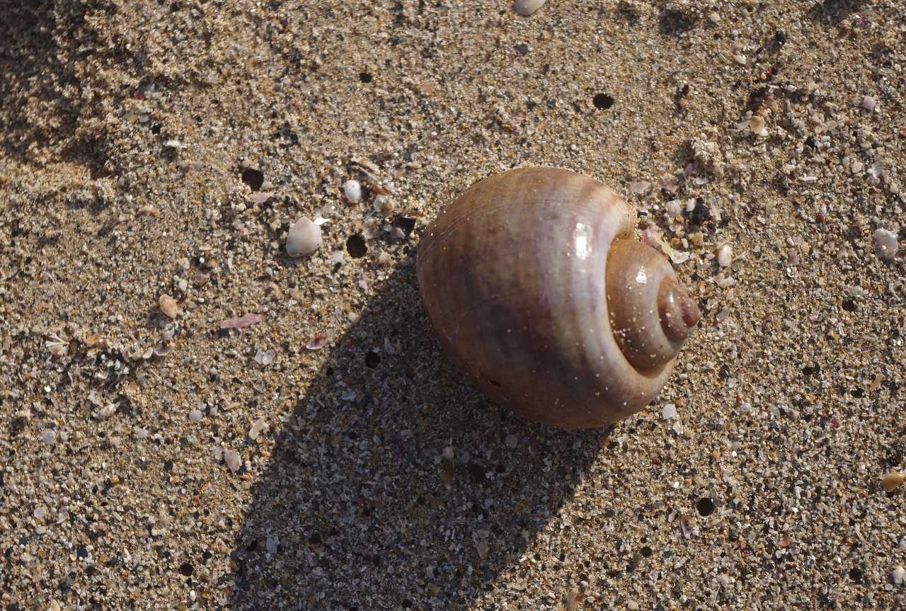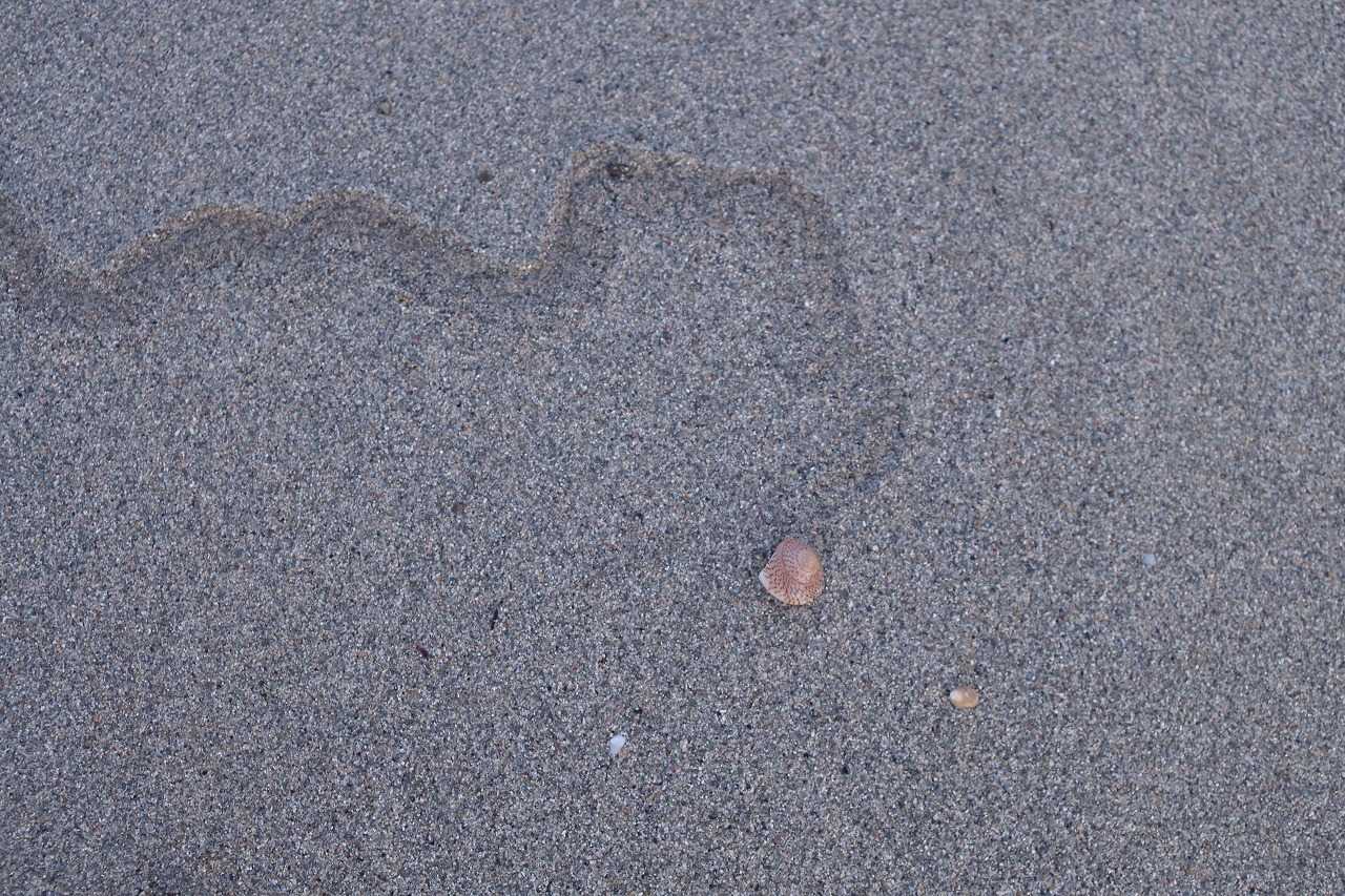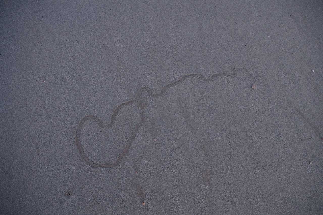 正体は打ち上げられた生きたキサゴ。海に帰れなくて砂上を這った跡だった。キサゴは海に返した。
