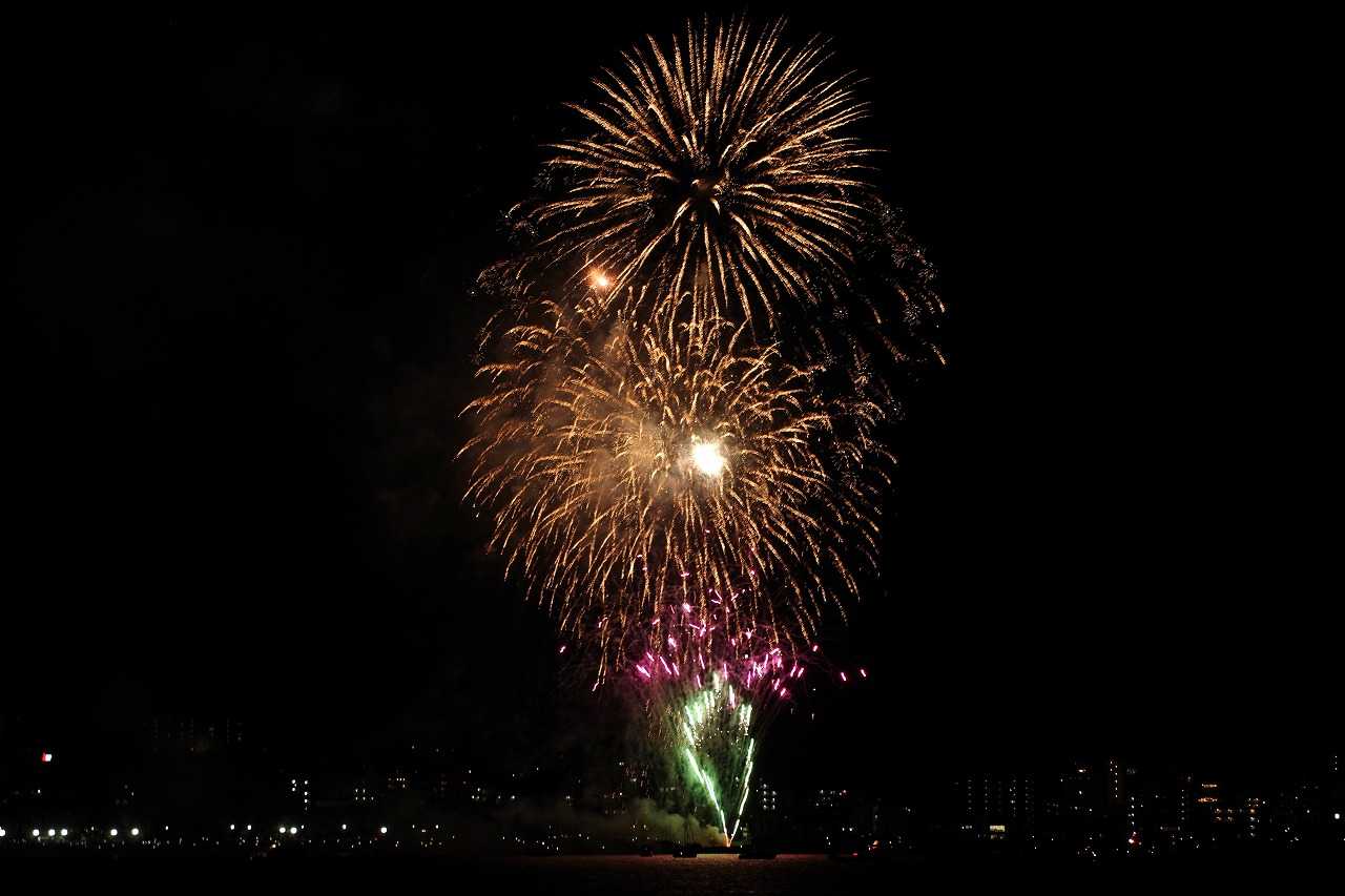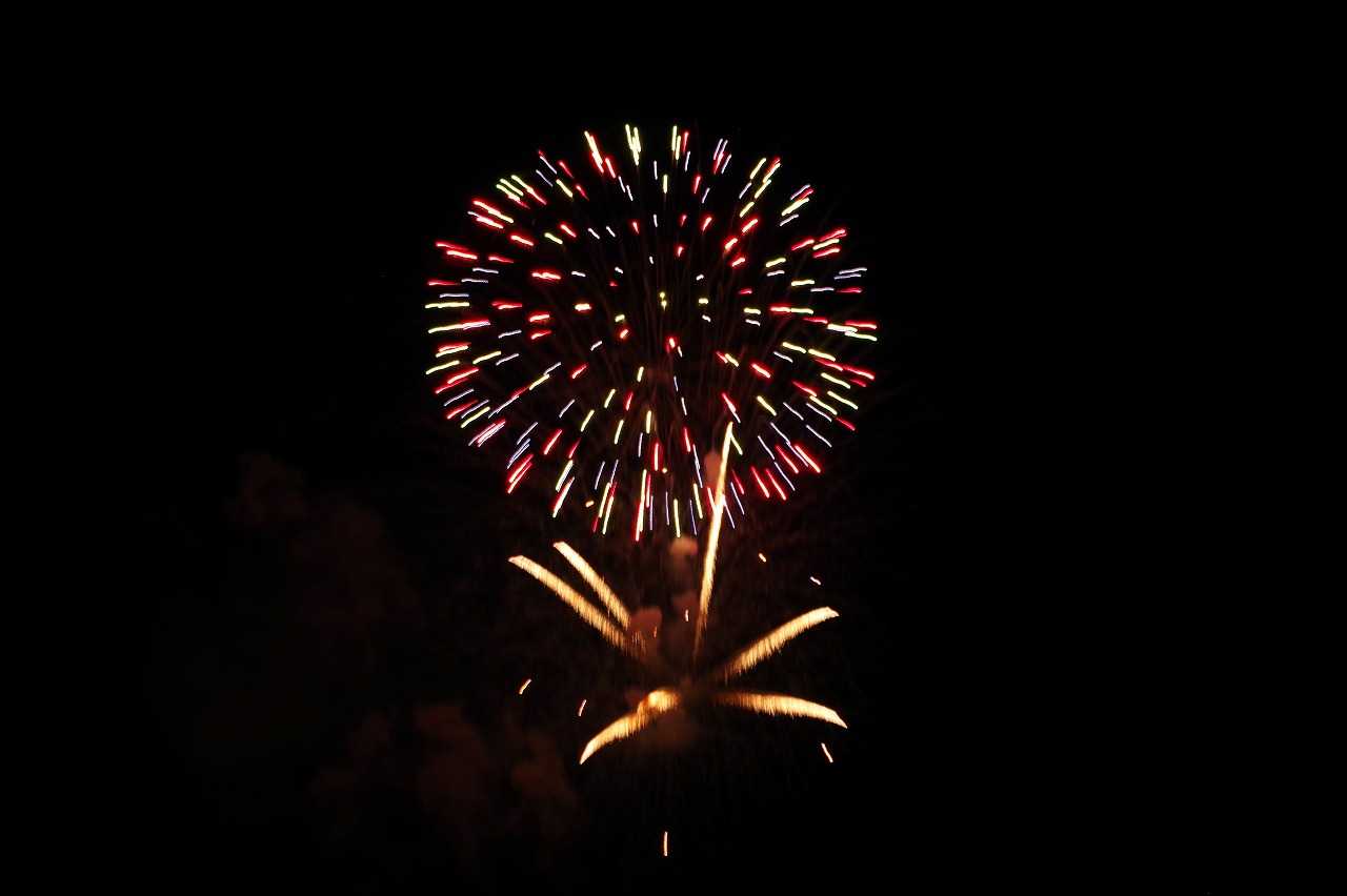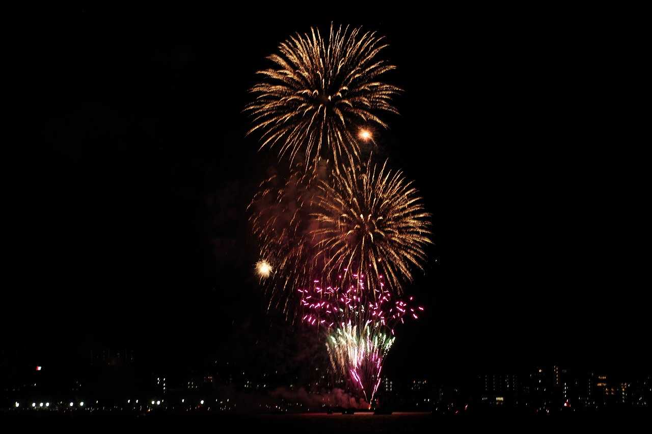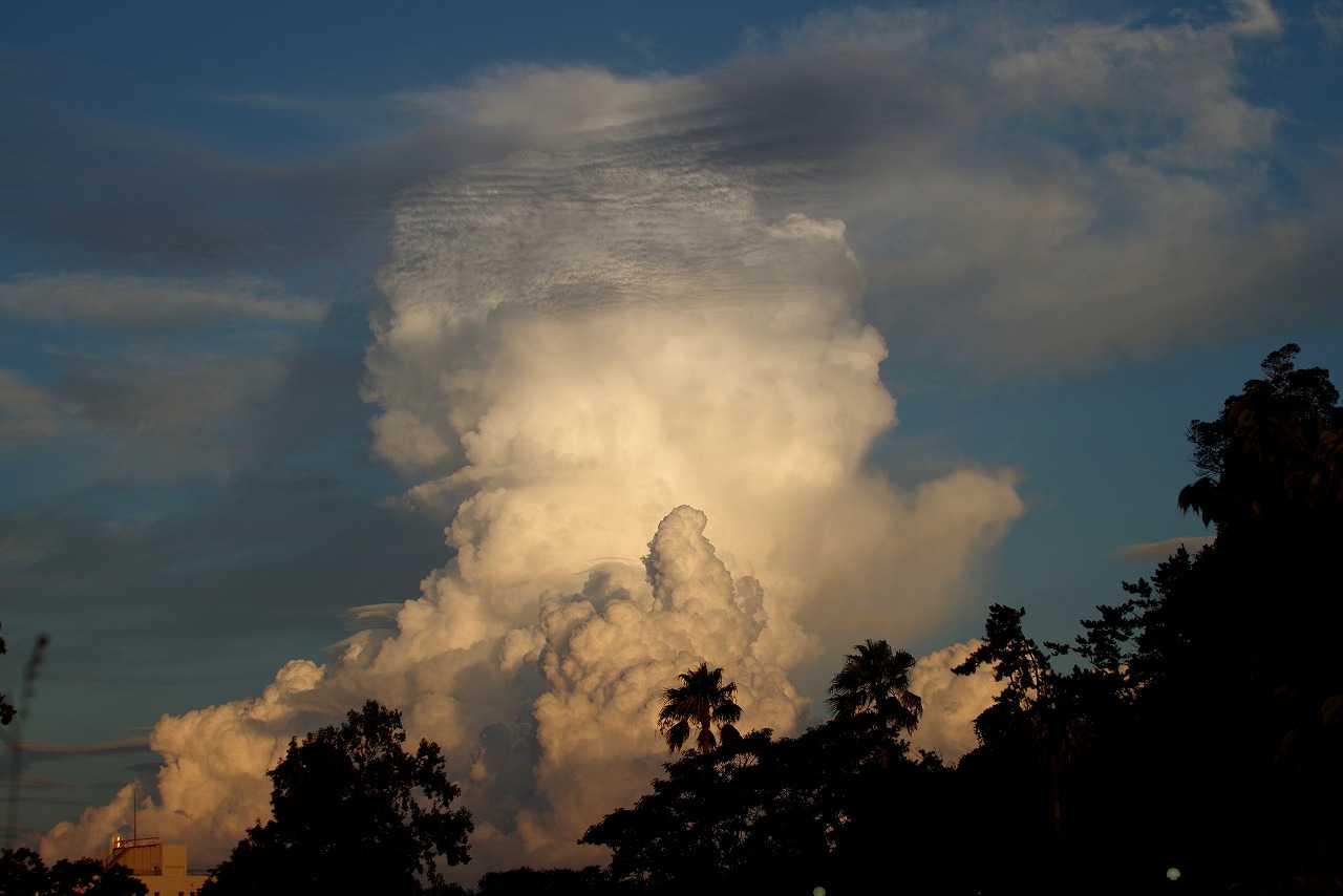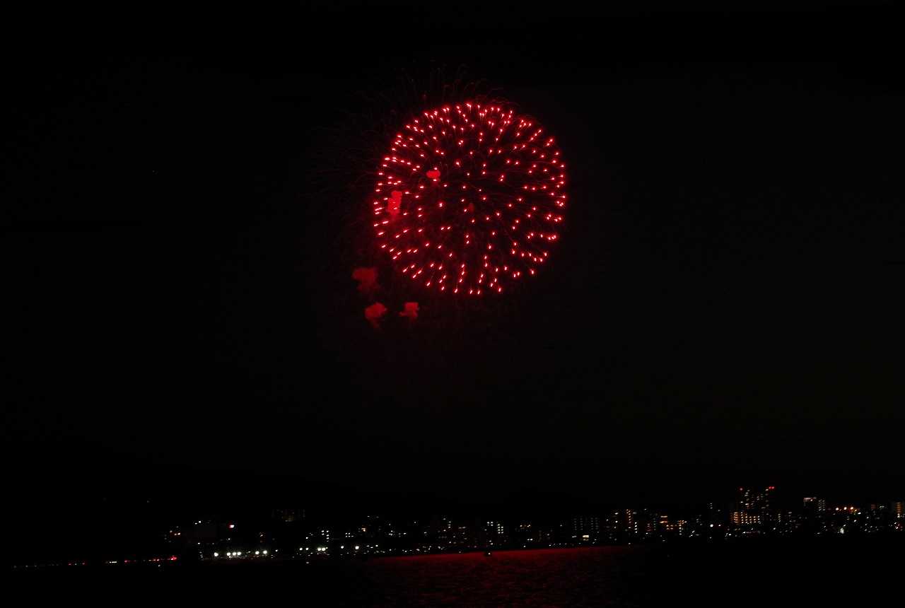 夕方小戸公園へ夕方の空を見に行った。夏は夕焼雲が一番きれいになる。おまけに長垂れ海岸で打ち上げ花火があった。花火撮影に必携の三脚が無かったので、長時間露光が出来ず花火らしくない写真になった。