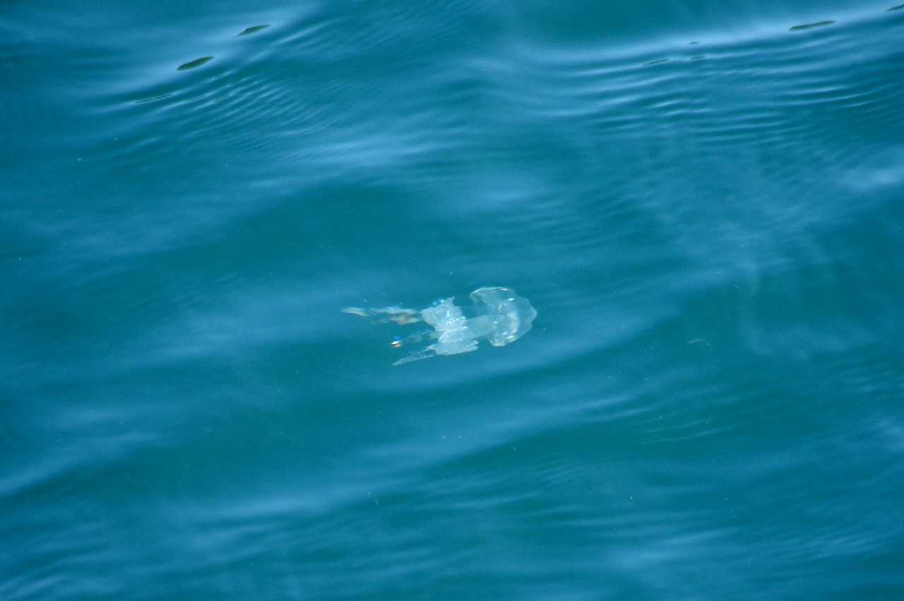 この夏はクラゲが多い。これはタコクラゲの様だが、色が通常の褐色ではない。