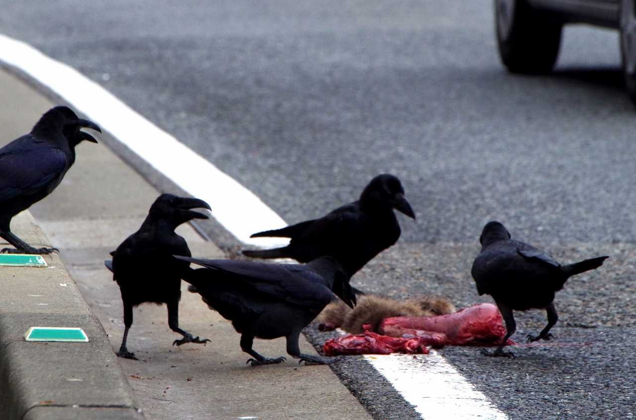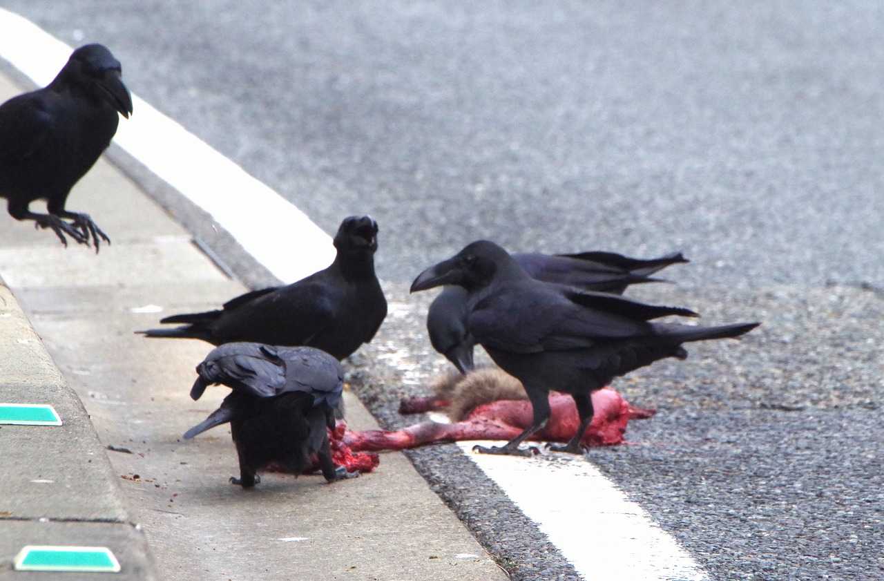 長垂れの道路上で、カラスが轢死して内臓や肉が露出した多分アナグマに殺到していた。車もこれを踏みたくないので避けている。ハシブトガラス電線や電柱にも多く止まっていて、食い意地がひときわ強い個体だけが数羽危険を冒して肉や内臓に食らいつく。カラスもいろいろな性格がある。