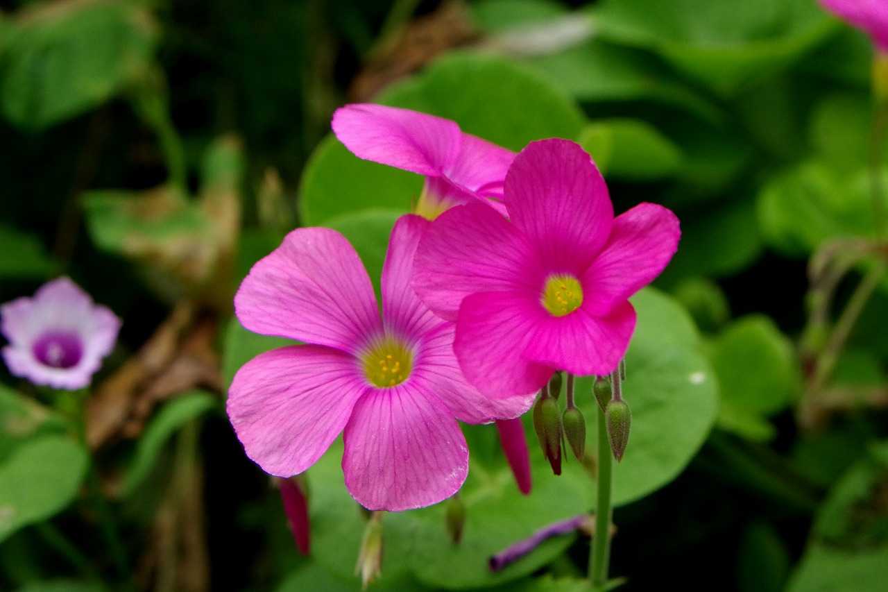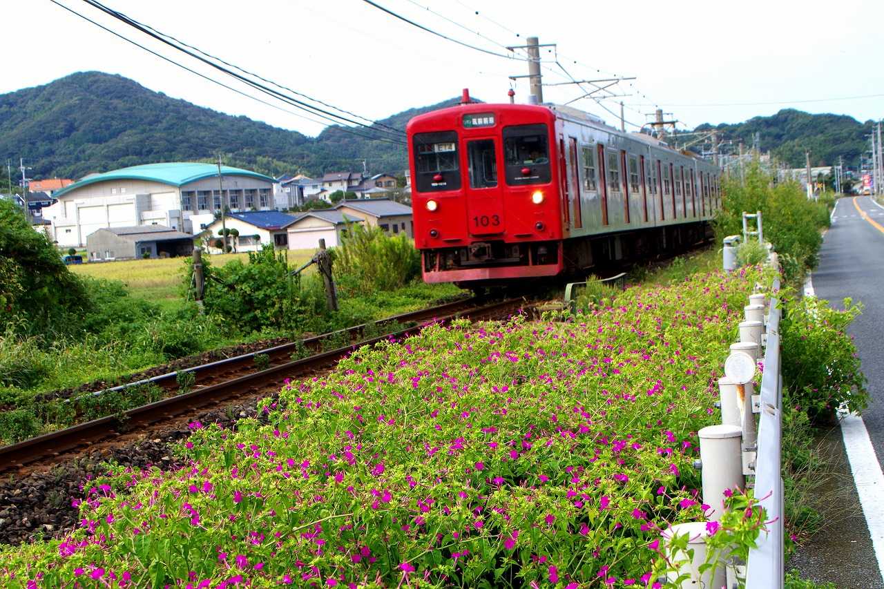 筑肥線の電車。線路脇にはオシロイバナが咲き誇っていた。