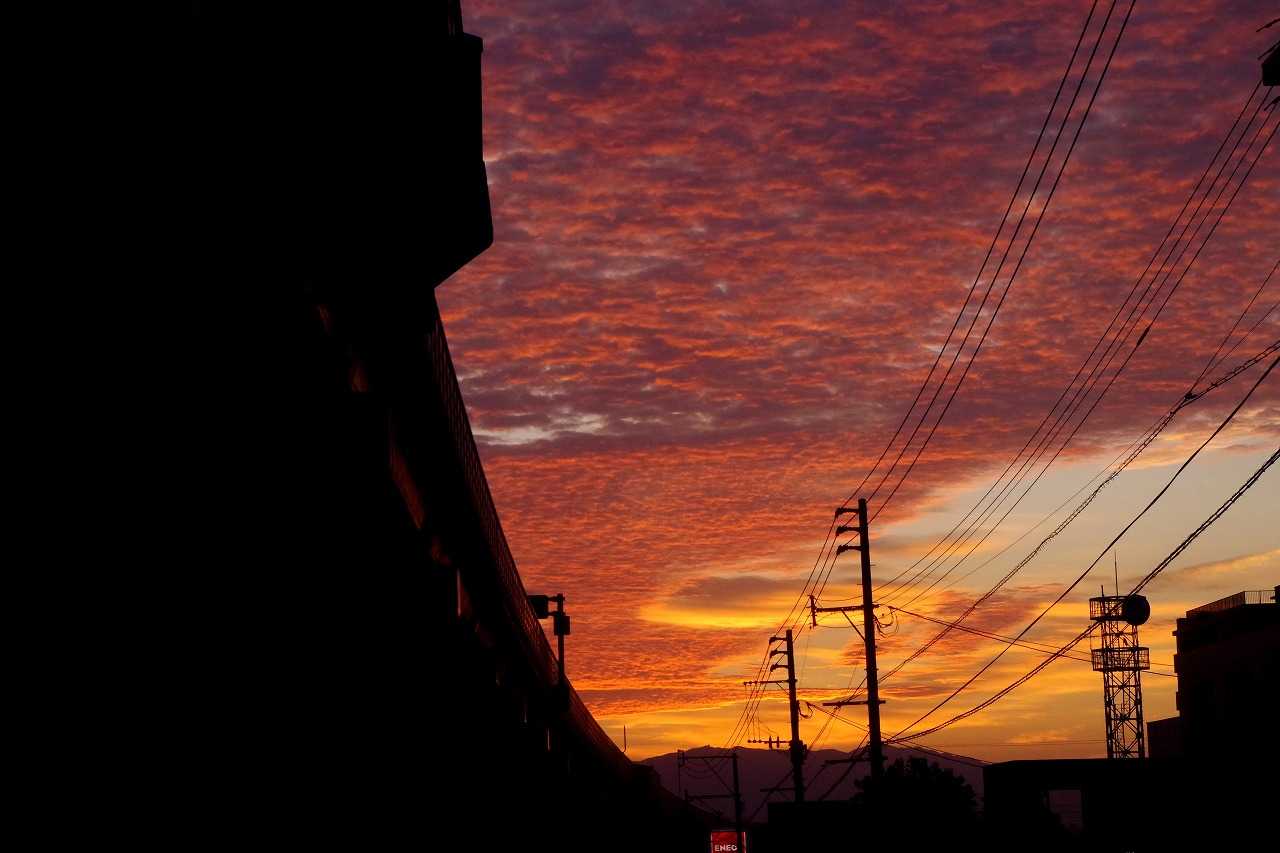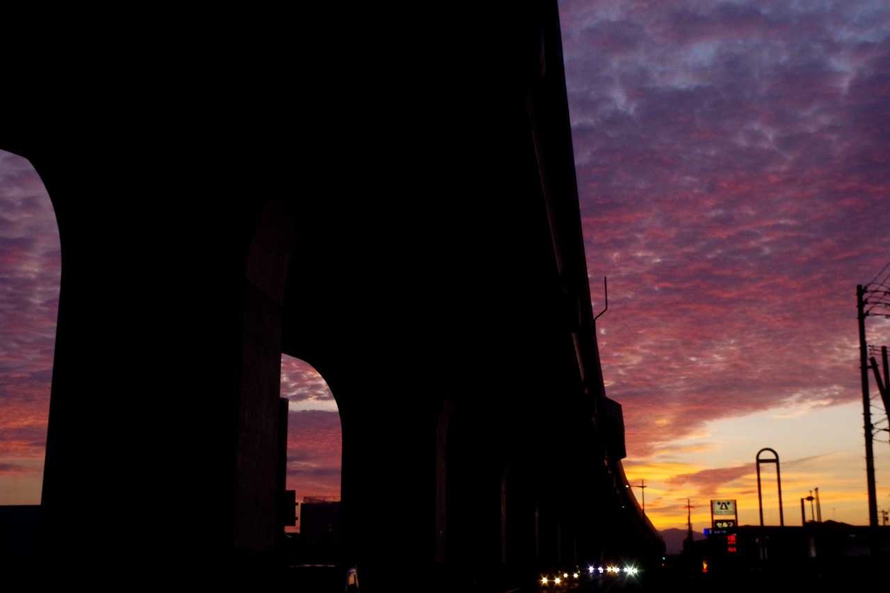 朝6時に出た。道中バックミラーには、高架の隙間の東の空が朝焼けになっているのが見えて、バイクを止めて写真を撮った。