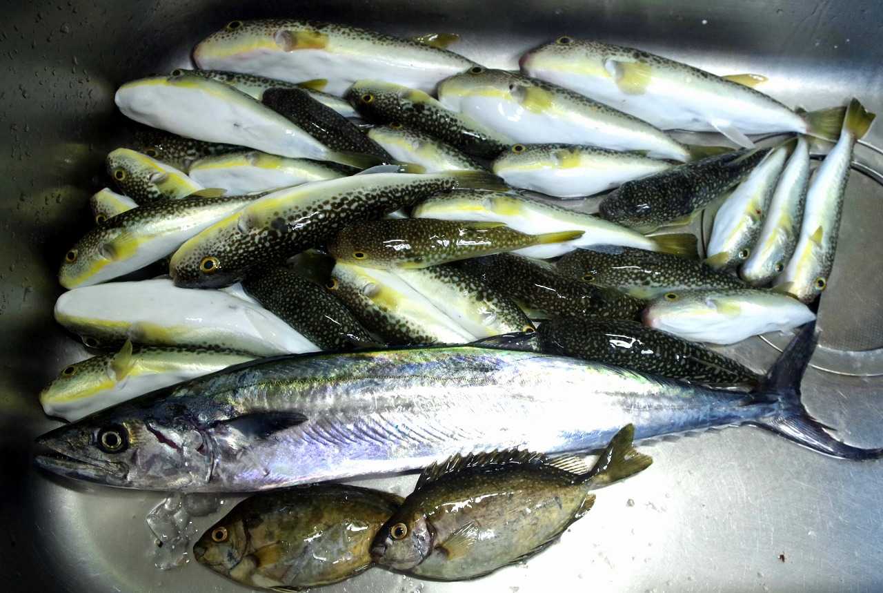 時化の後だから魚は少なかった。カマスも少なく、大小25匹購入して福吉港へ引き返した。後半戦もフグばかりで、食いは低調になっていた。11時まで釣って、終わりに近い時点でサゴシが跳ねたのでジグを投げてサゴシがヒットした。30cm位のが多かった中で、幸運にも釣れたのは46cmあった。