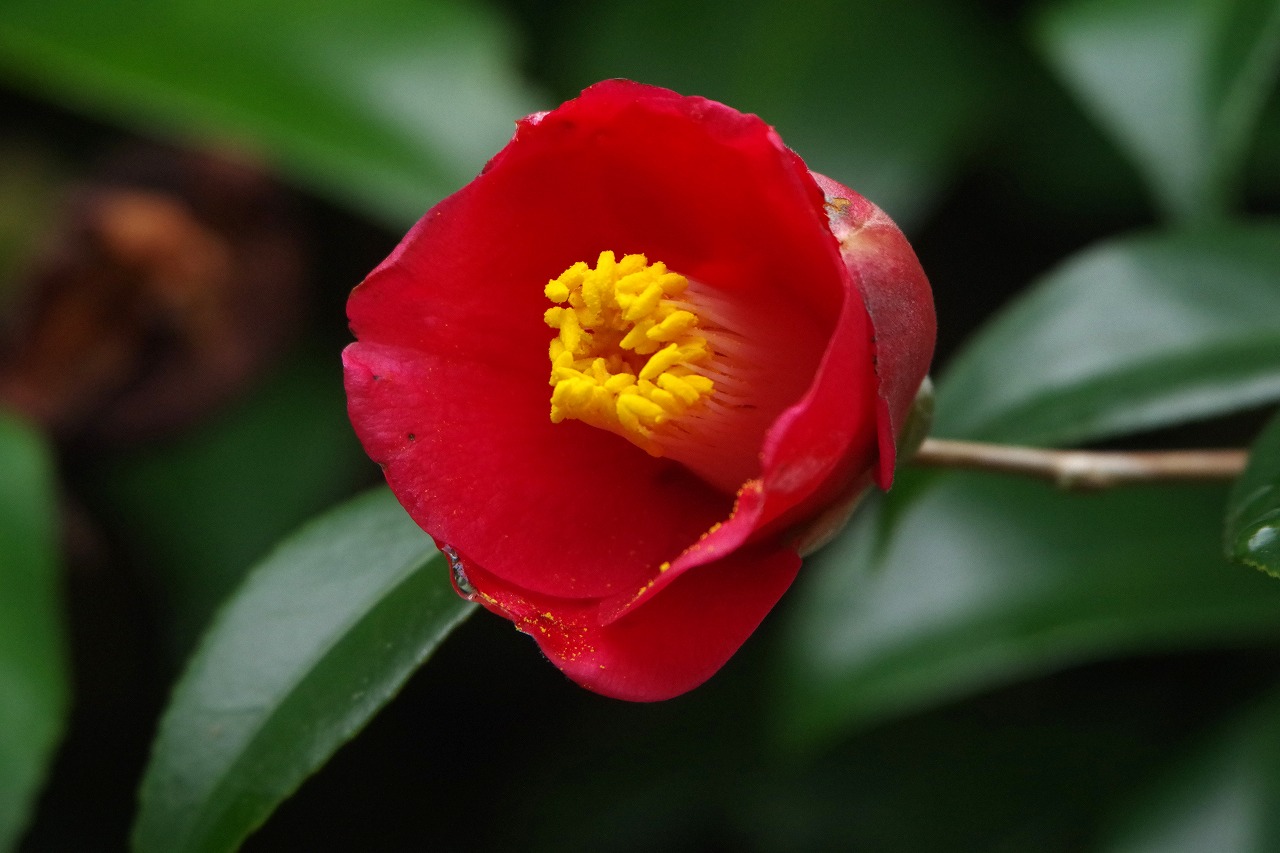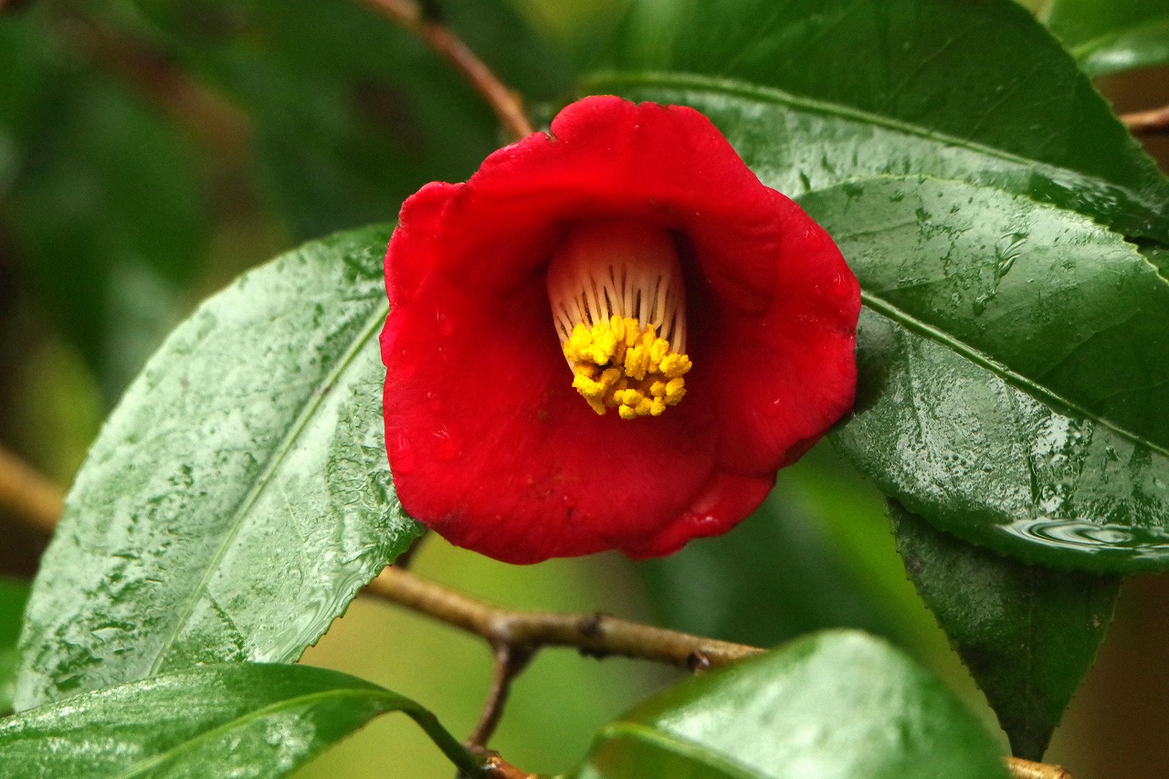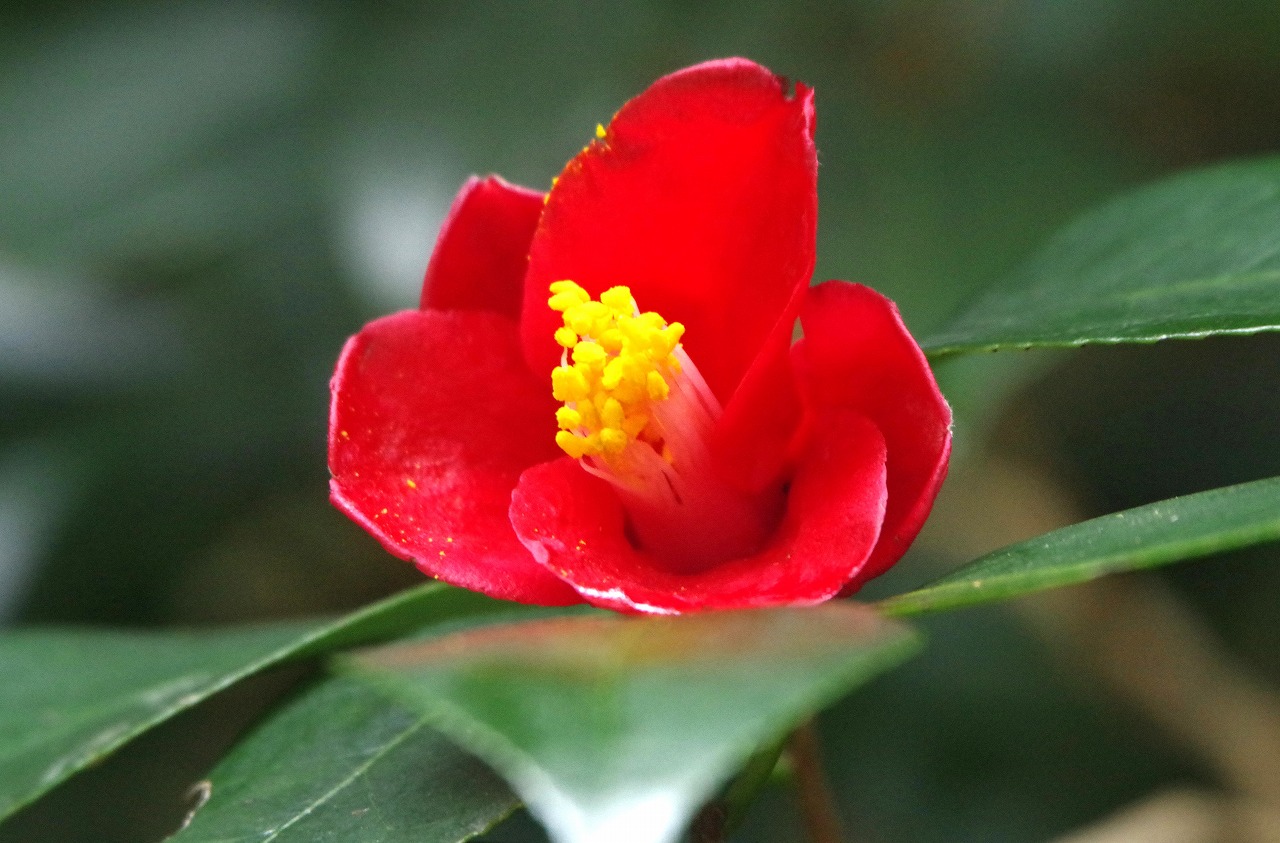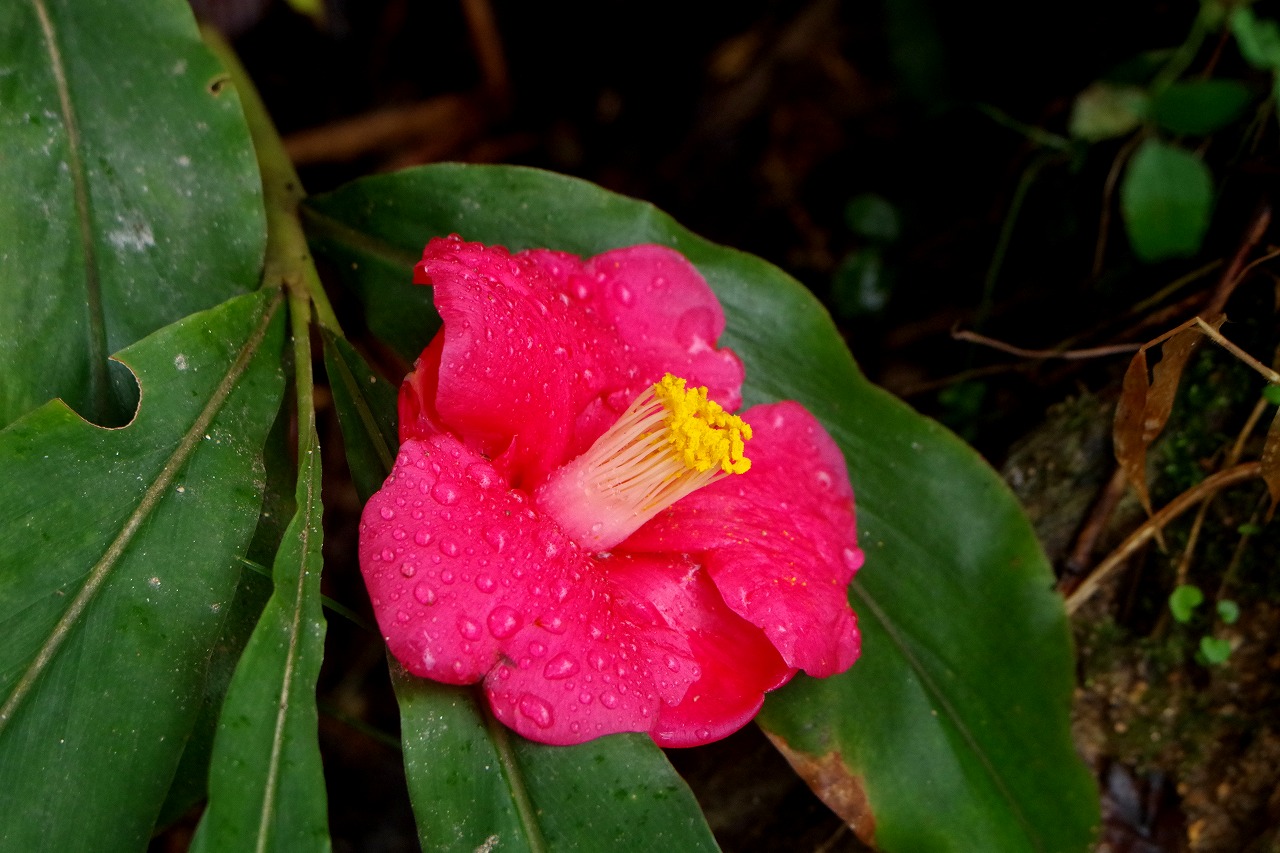 ヤブミョウガの上に落ちたツバキは尚色鮮やか。