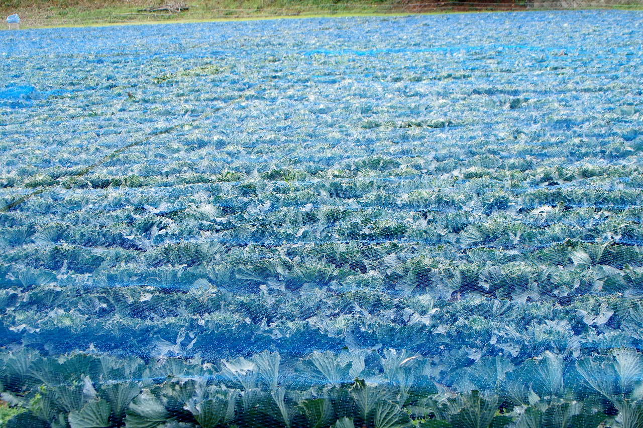 ネットをキャベツ畑一面に掛けてあるのはヒヨドリの食害防止の為。