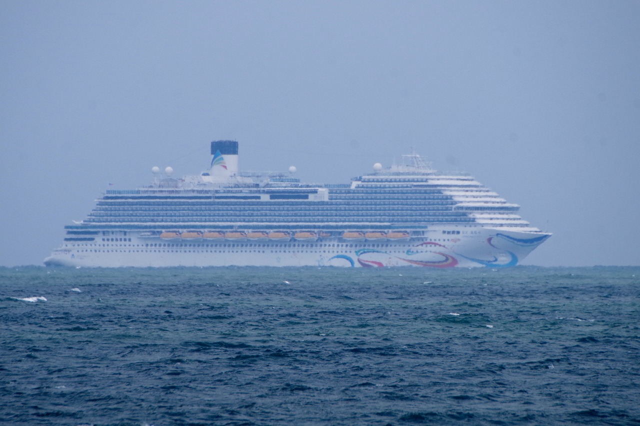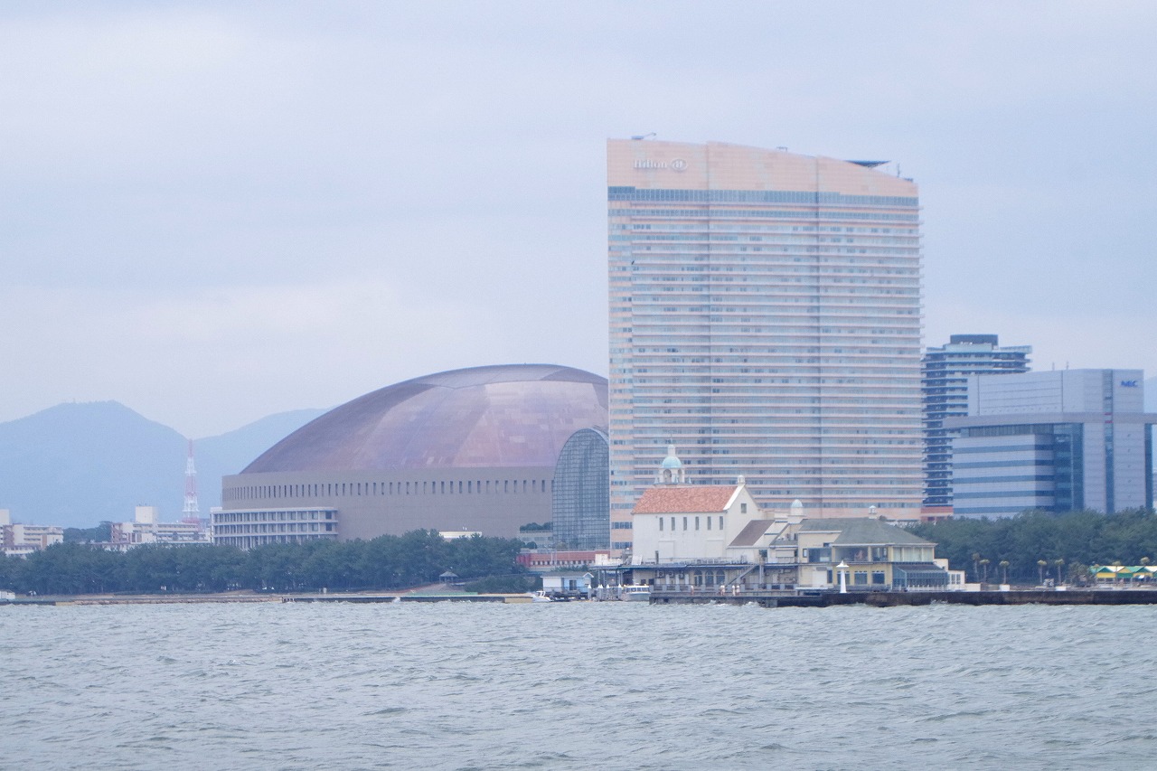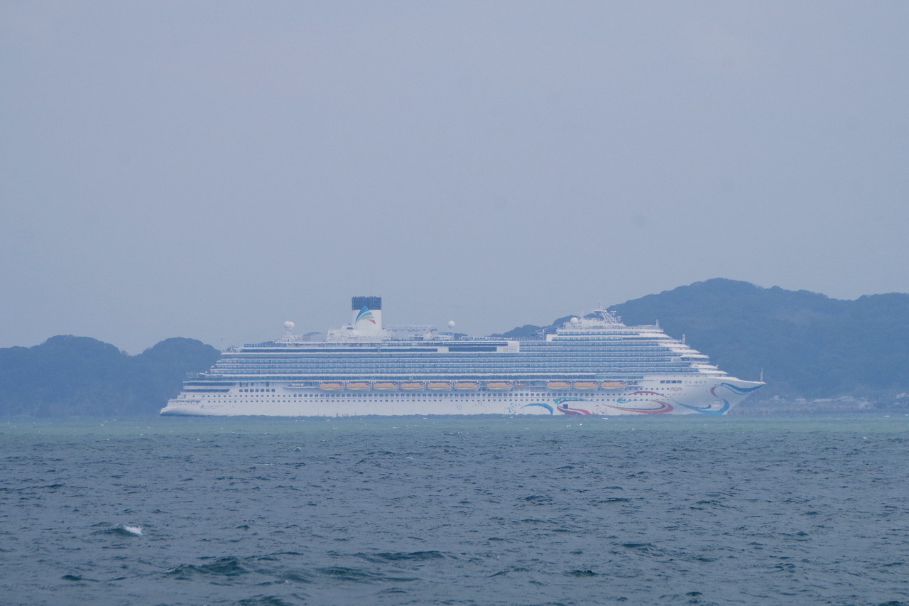 今津海岸で博多へ向かう中国からの客船を見た。よく見る船体だった。