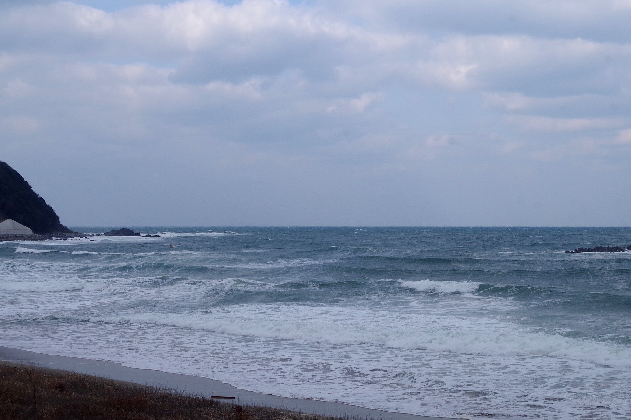 野北へ原付バイクで向かいながら、防寒着でもかなり寒い思いをした。40分ほど走って野北の海岸に着いた。北東の強風で時化ていたが、波高は3mといったところで、当然ながらぐちゃぐちゃの風波だった。