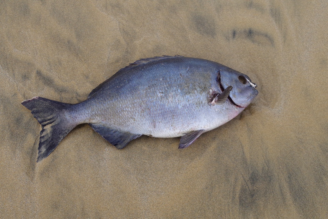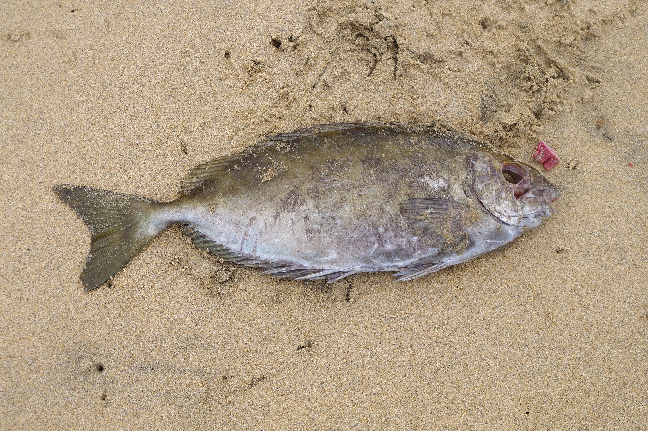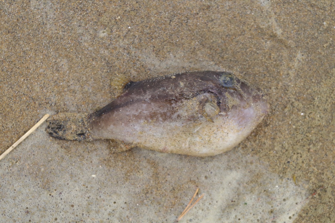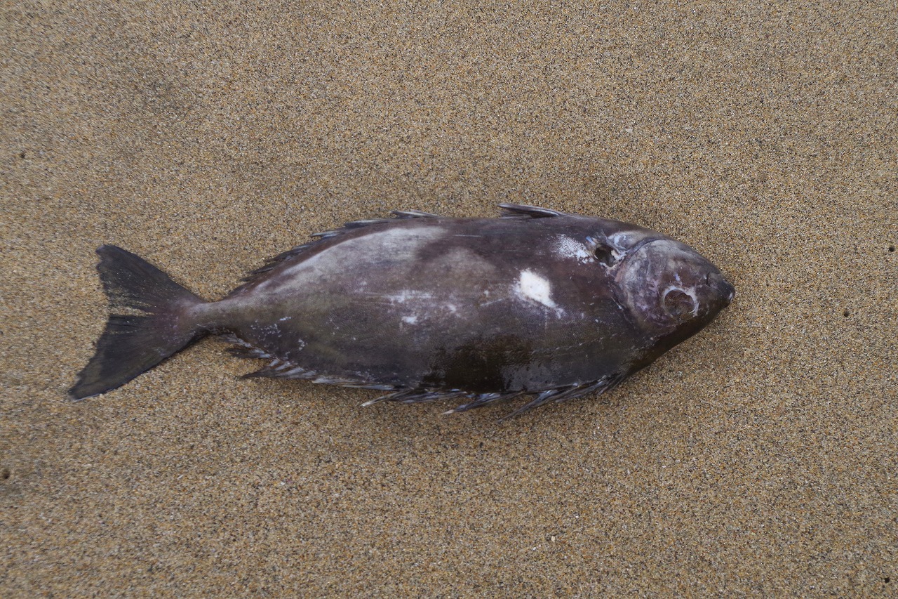 ここではアイゴが3匹とイスズミ1匹、北枕1匹が砂浜に横たわっていた。アイゴは両眼とも、イスズミは1個目は無かったが、キタマクラは無傷だった。