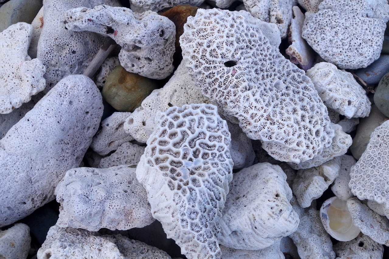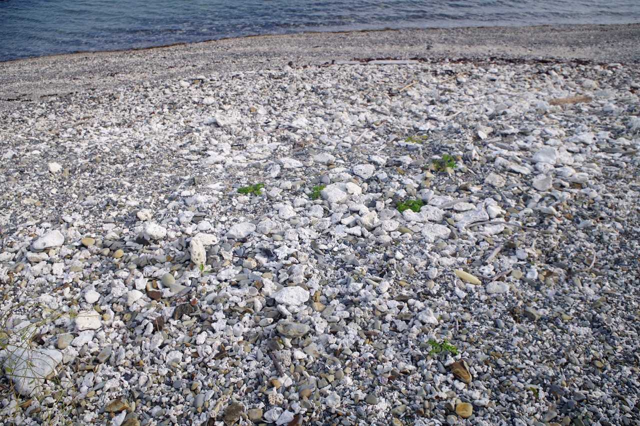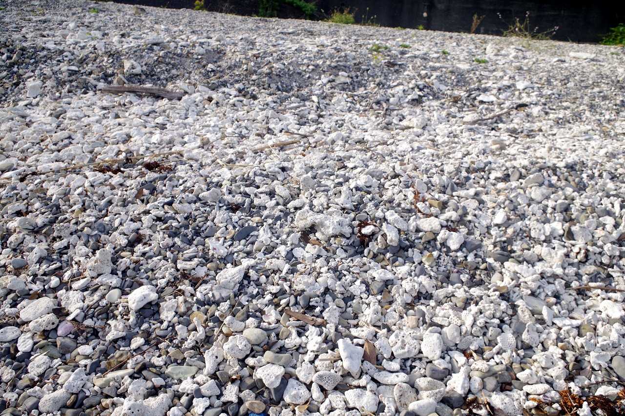 串本近くの浜が白いので行って見ると、造礁サンゴの骨格が多数打ち上っていた。奄美レベルの多さ。