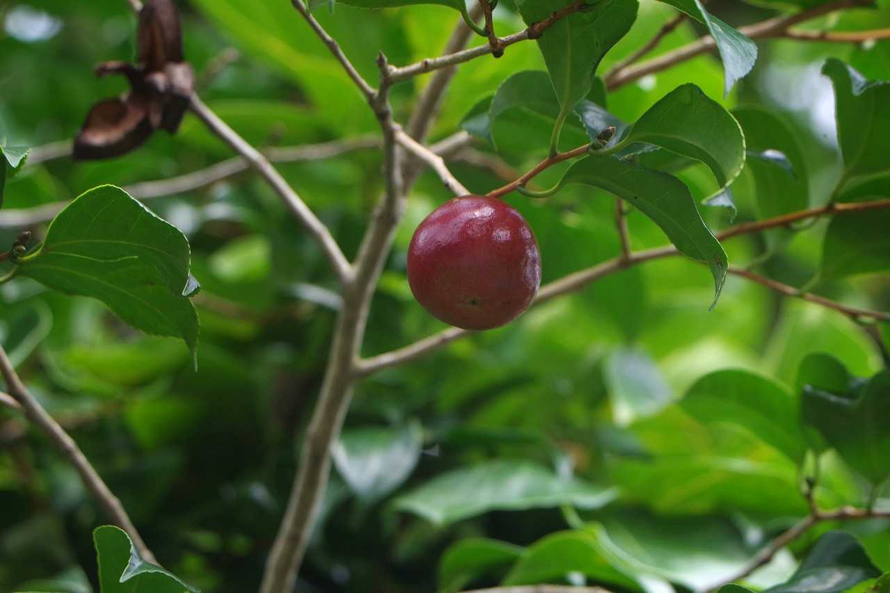 ツバキが実を付けていた。中に3個ぐらい黒い種が入っていて、それを潰して絞れば椿油が取れる。