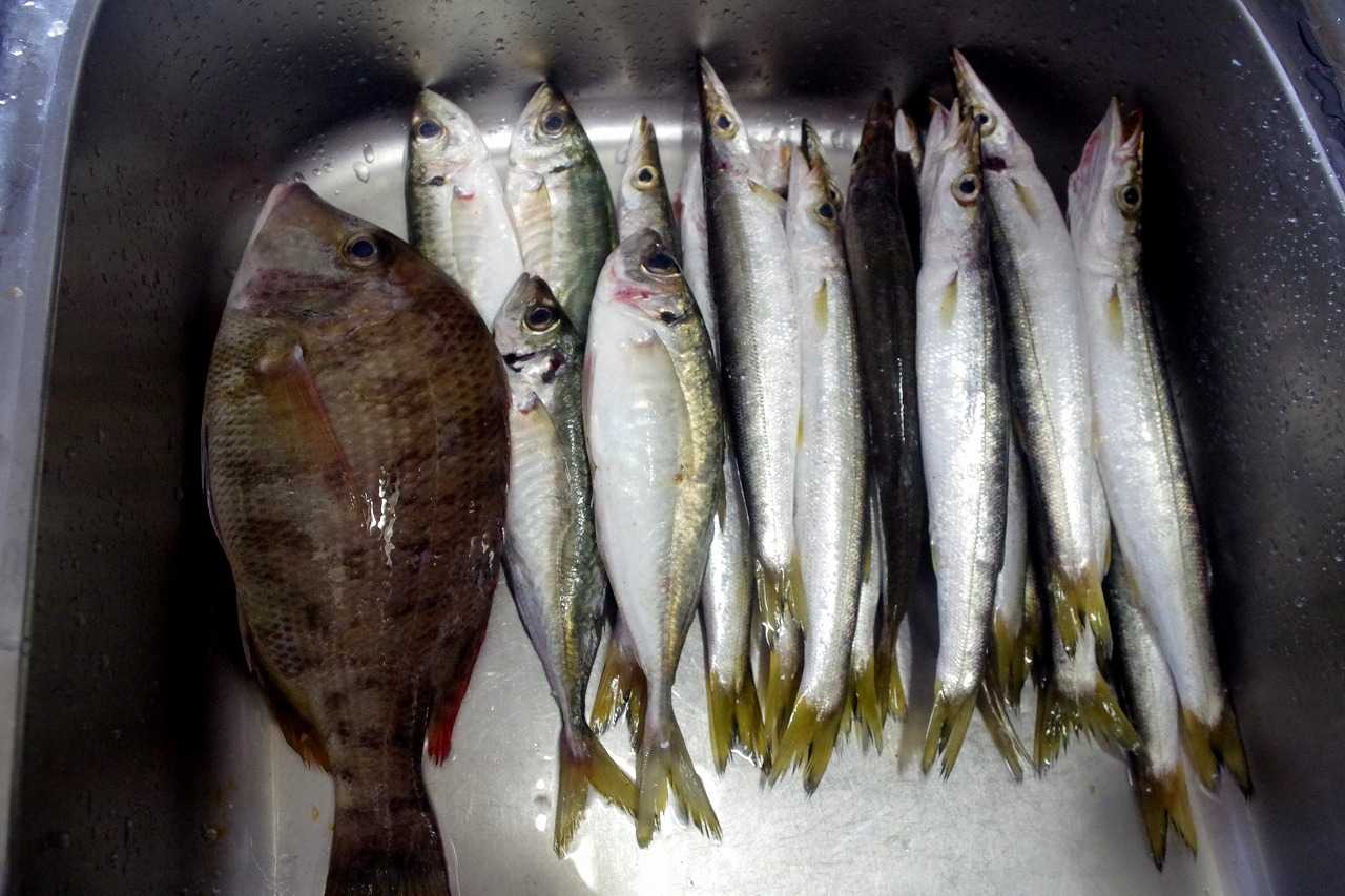 店には30cm程のアカカマスが大量に並んでいて、他の魚を圧倒していた。買い物客が多い祭日の開店10分後でも多く残っているのは需要が多くないせいだろう。まだ産卵中で脂が少なく、秋のカマスの旨さは無いがそれなりに味が有るし、1尾70円程の安さで16尾買った。