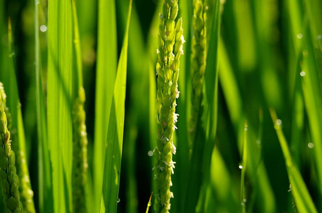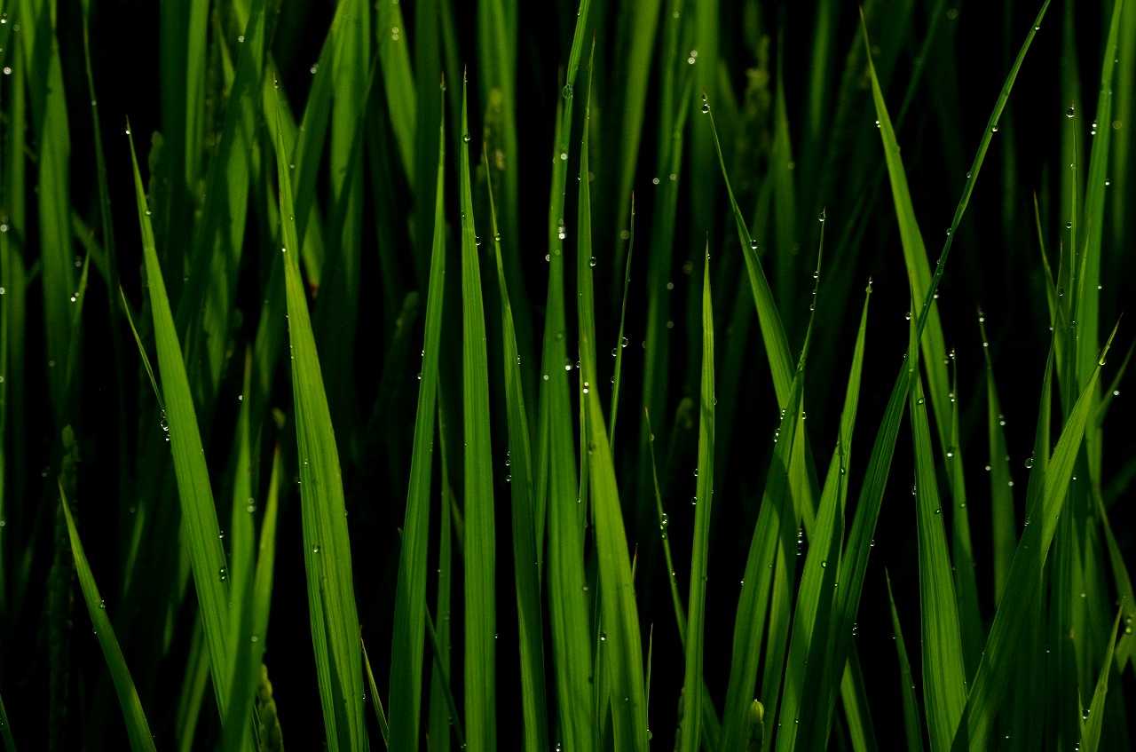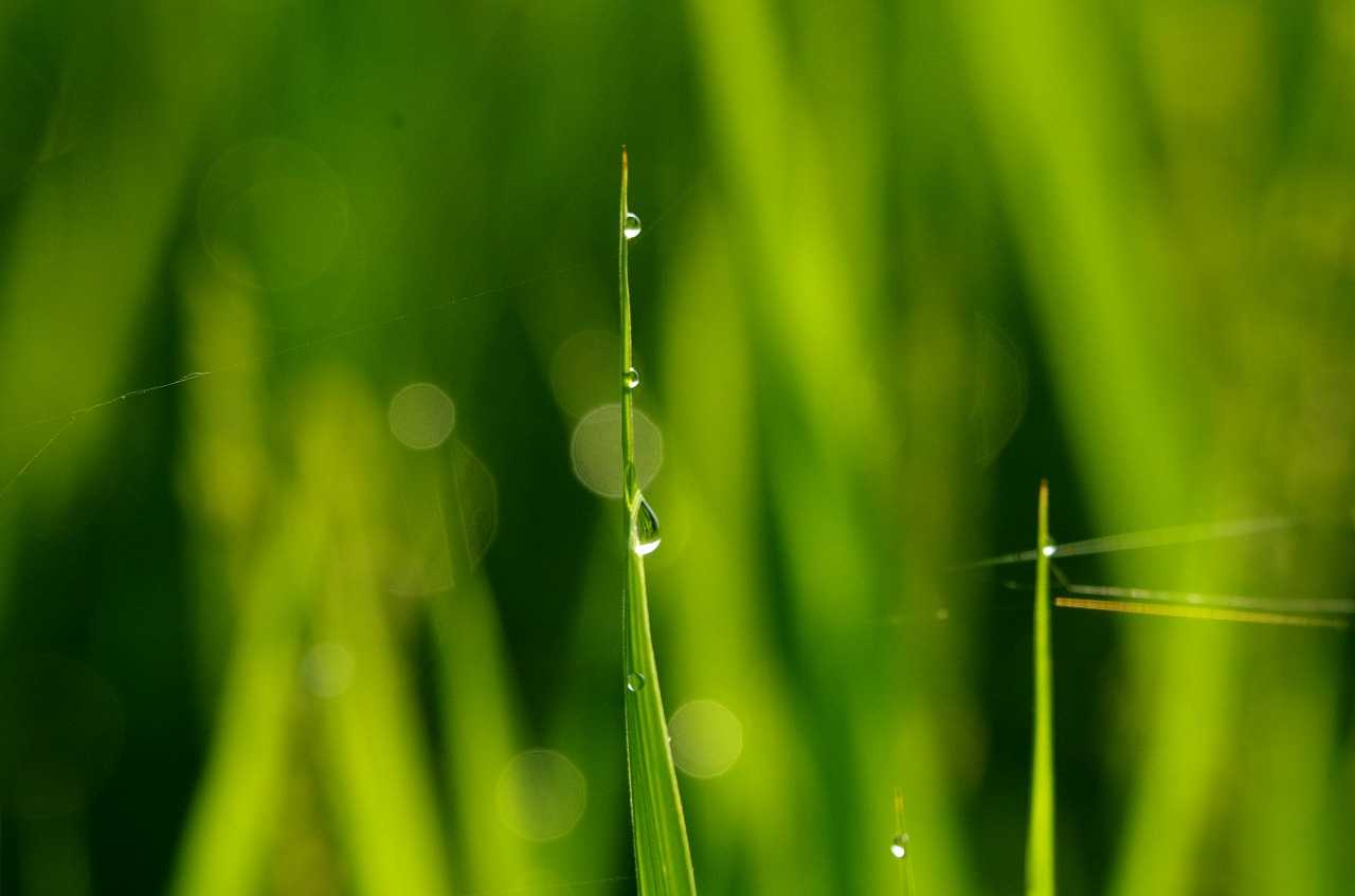 僅かに日が射して、稲の葉の水滴を照らした。朝の稲は水滴を葉先に付ける。