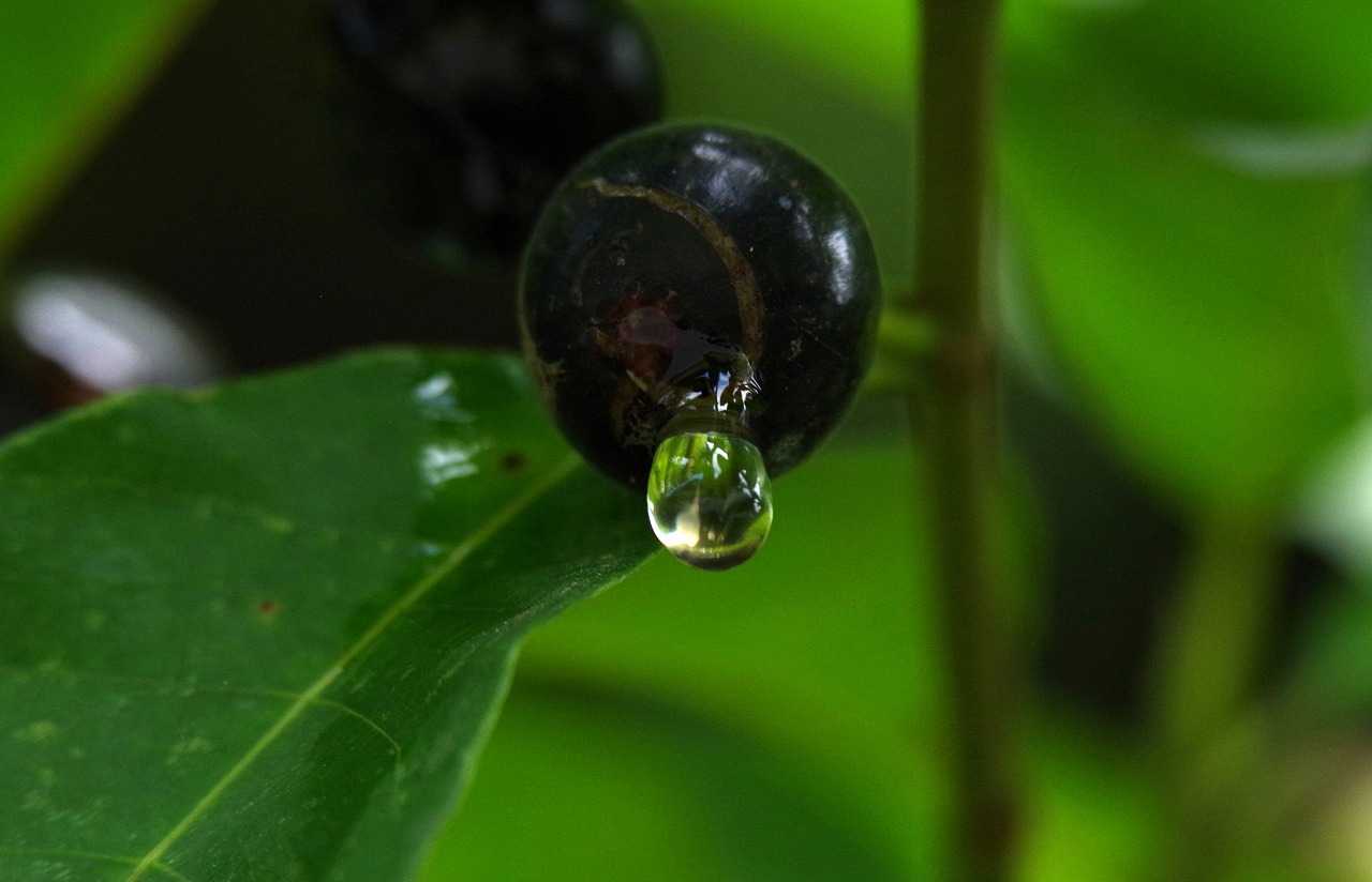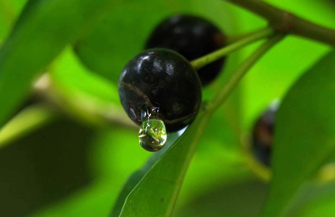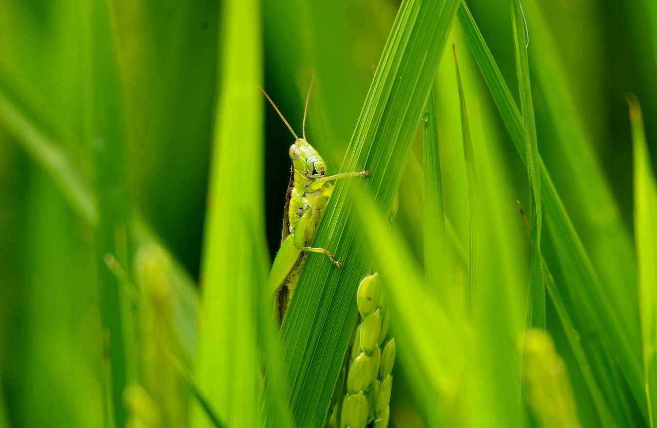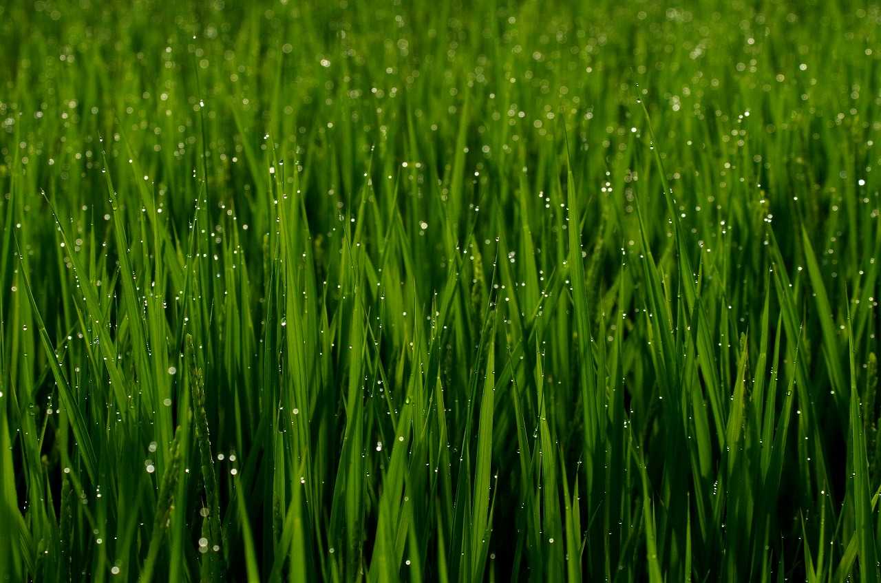 僅かに日が射して、稲の葉の水滴を照らした。朝の稲は水滴を葉先に付ける。