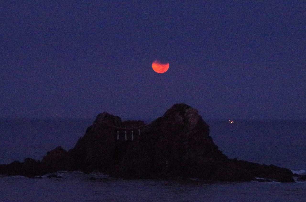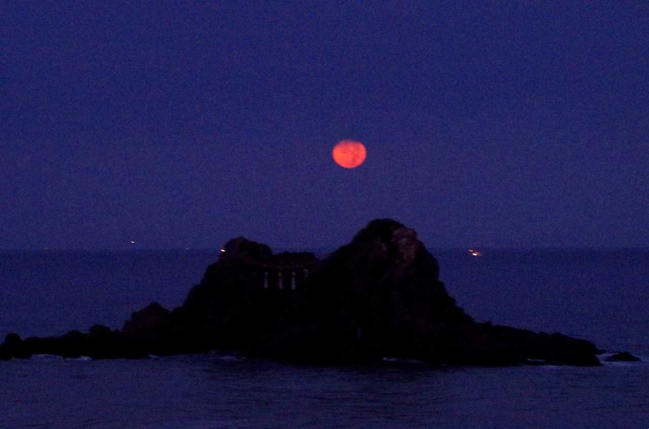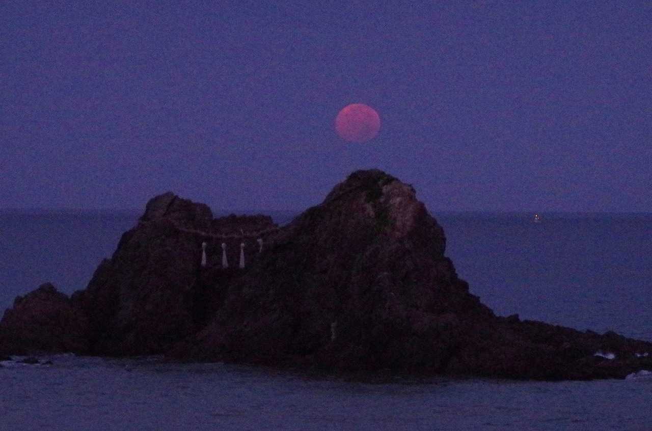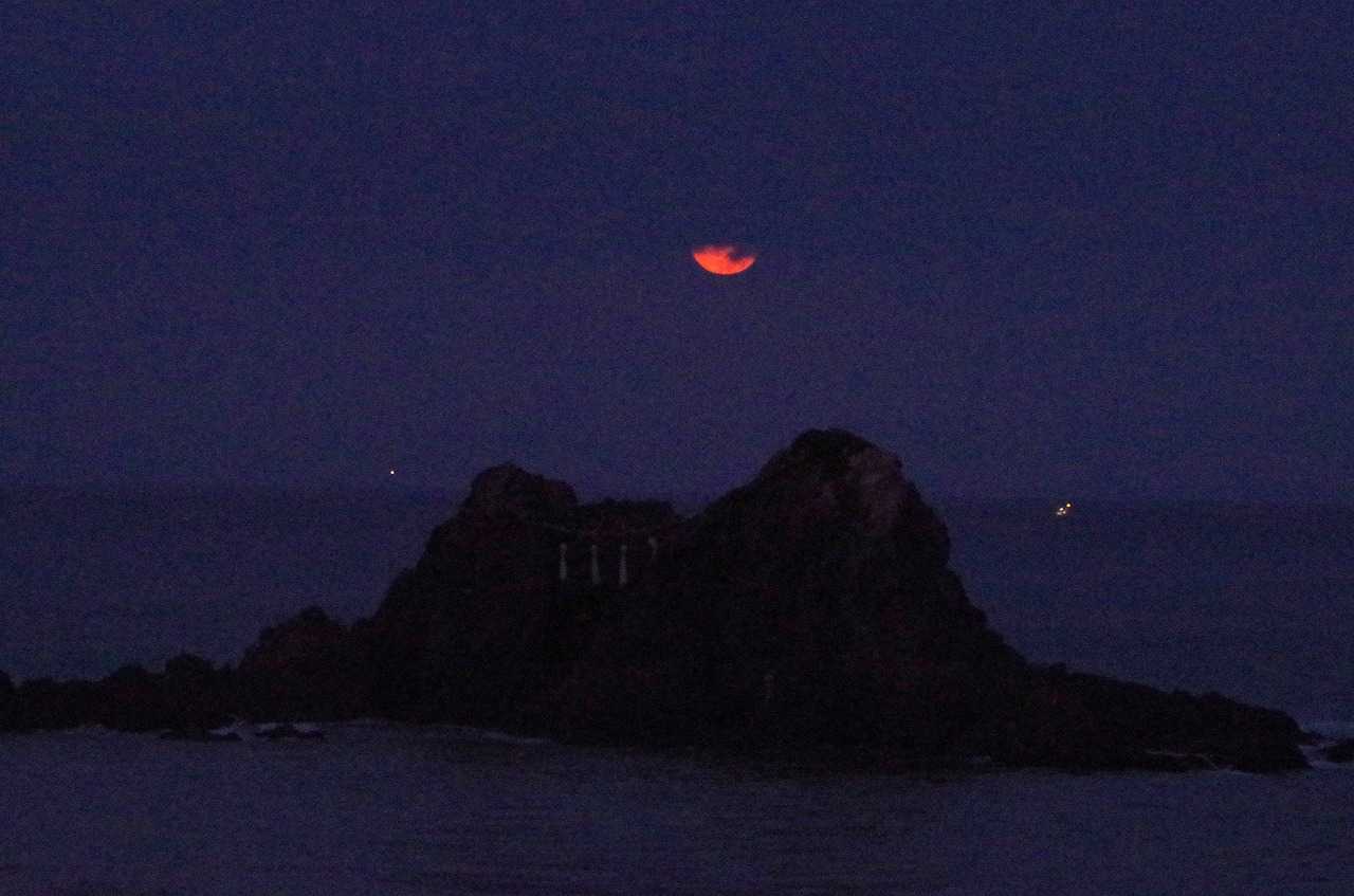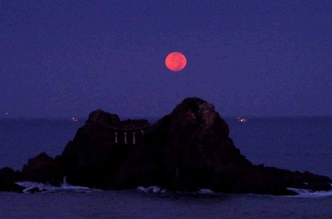 着いてすぐには、月は濃い黄色に変化して全身が見えていたのに、瞬く間に雲が隠してしまった。そんな時にでも水平線に近づくと雲が切れて見られることも有るので、夫婦岩と重なる所で時を待った。
