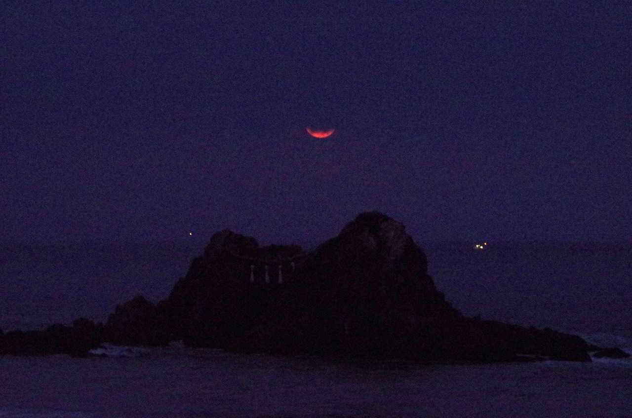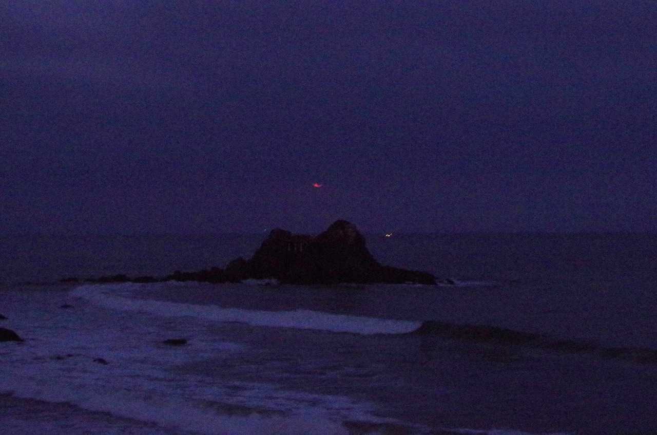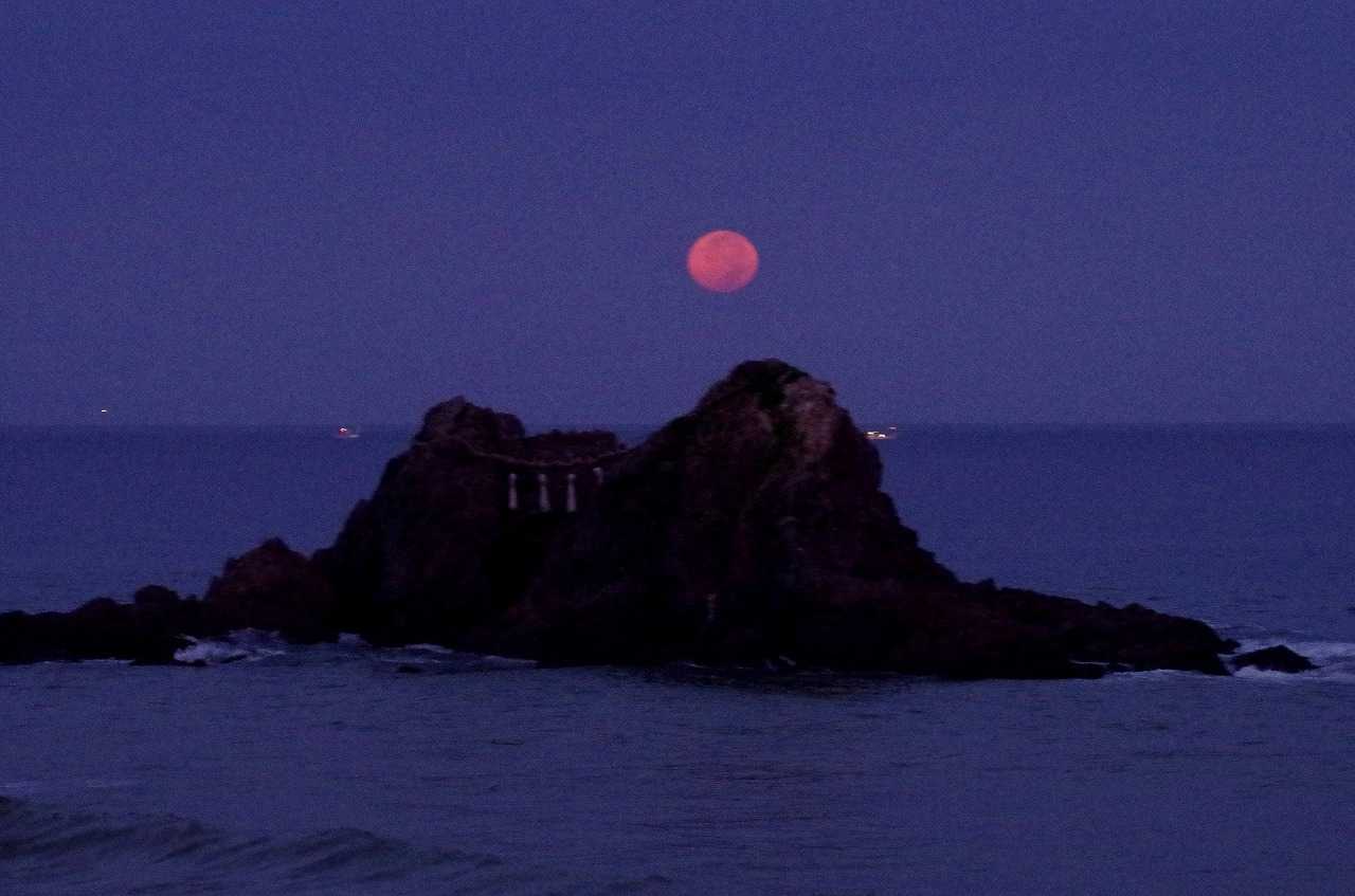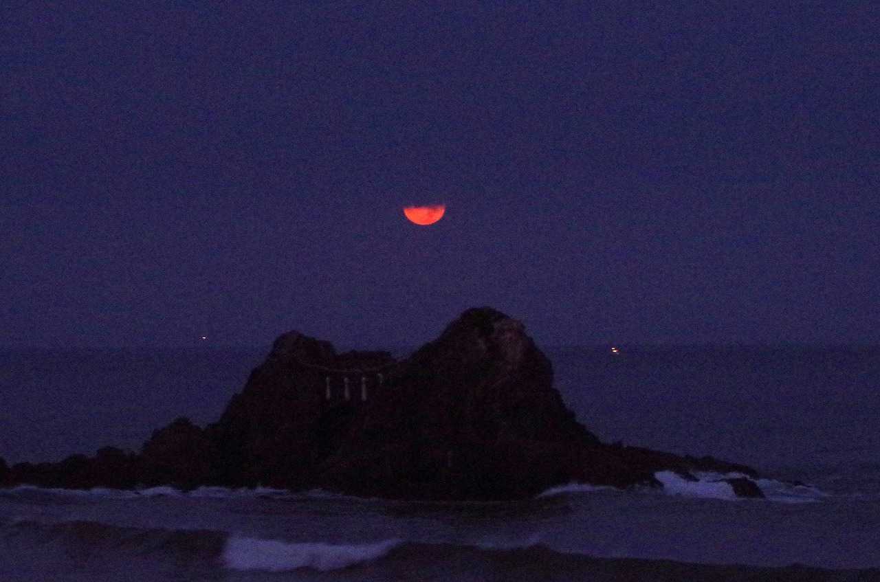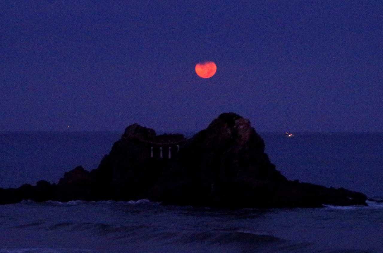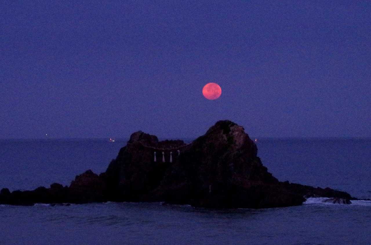着いてすぐには、月は濃い黄色に変化して全身が見えていたのに、瞬く間に雲が隠してしまった。そんな時にでも水平線に近づくと雲が切れて見られることも有るので、夫婦岩と重なる所で時を待った。
