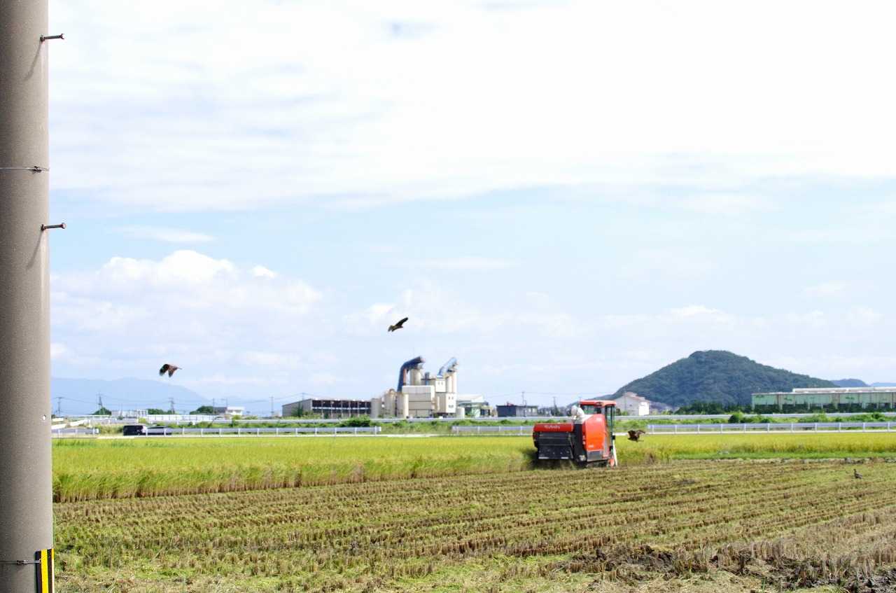稲刈りが盛んになっている。雨が多いので田んぼはぬかるんでいても、機械でやるので昔のような苦労は無い。例年ならサギがバッタやカエルを狙って付きまとうのに、今年はトビしかいない。海での漁の方が魅力があるのだろう。