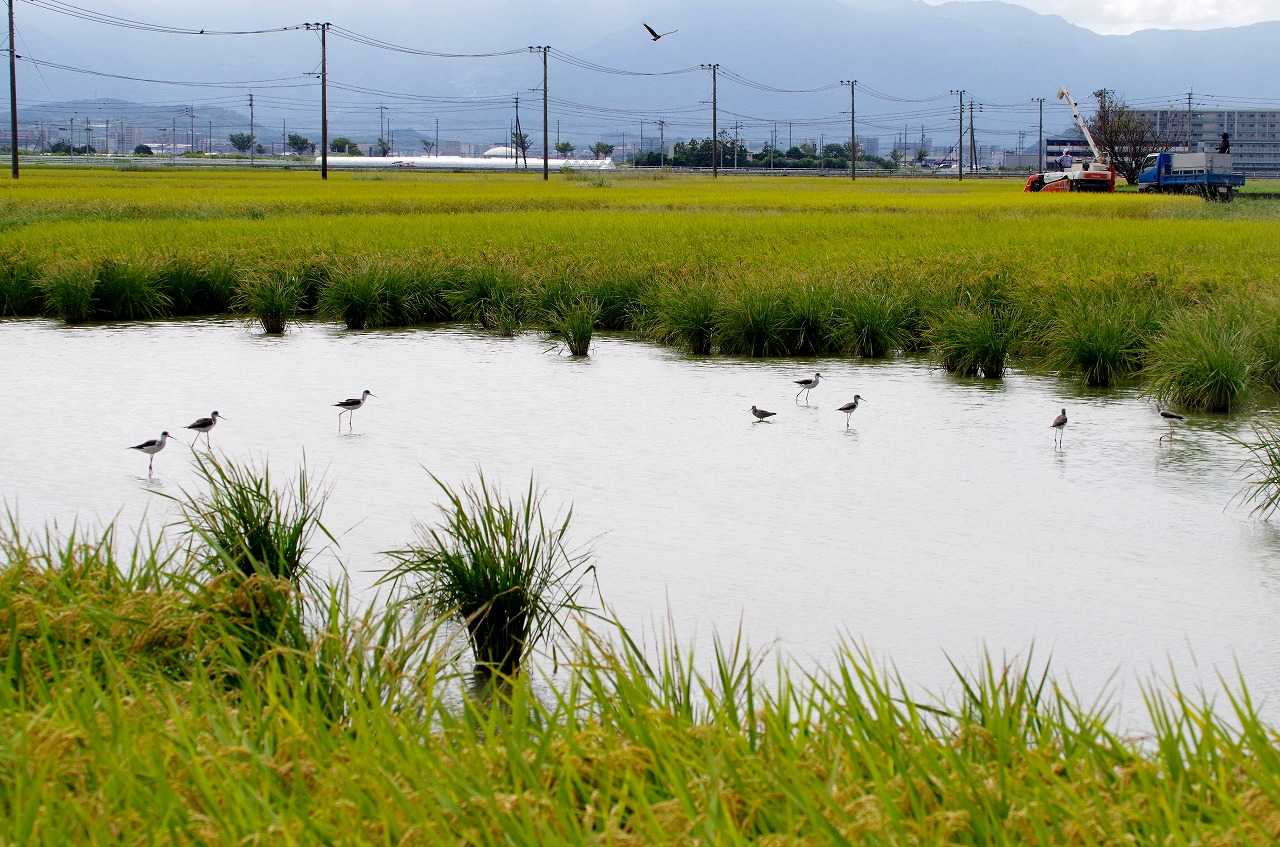 帰りは何時ものようにセイタカシギを見る。あちこちで稲刈りが始まっているのでこの場所も水を抜かれてセイタカシギの居場所も無くなるだろう。この日は4羽いた。