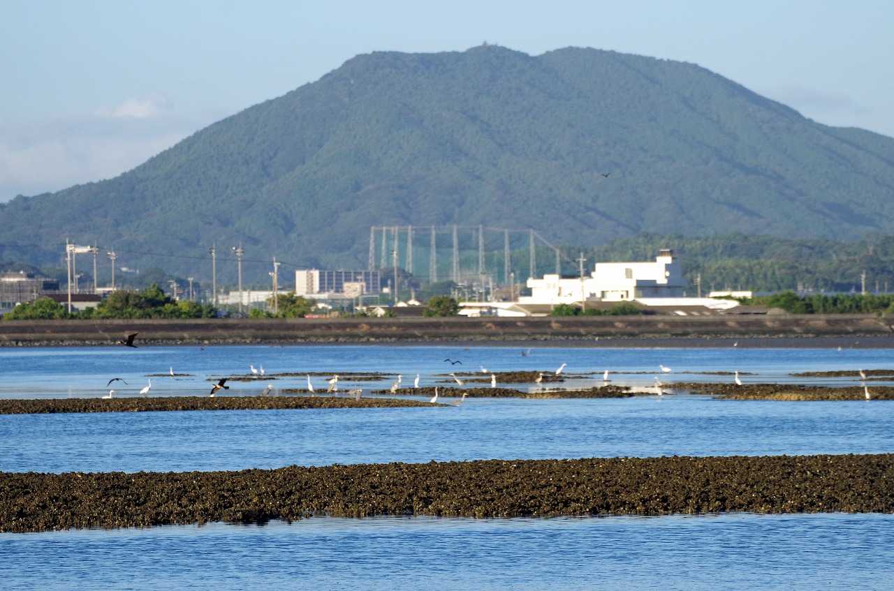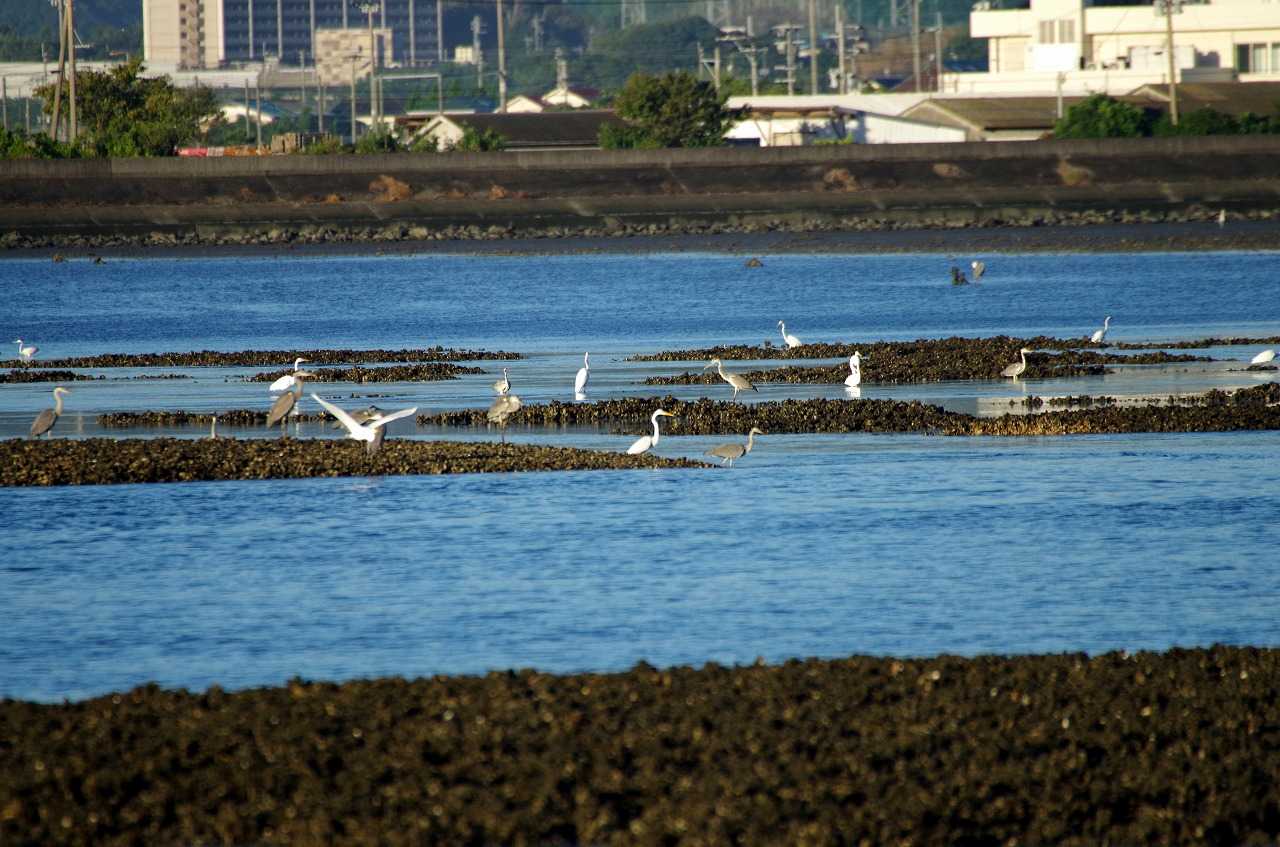 潮が引いている今津湾。サギ類がカキ礁で上げ潮を待っている。