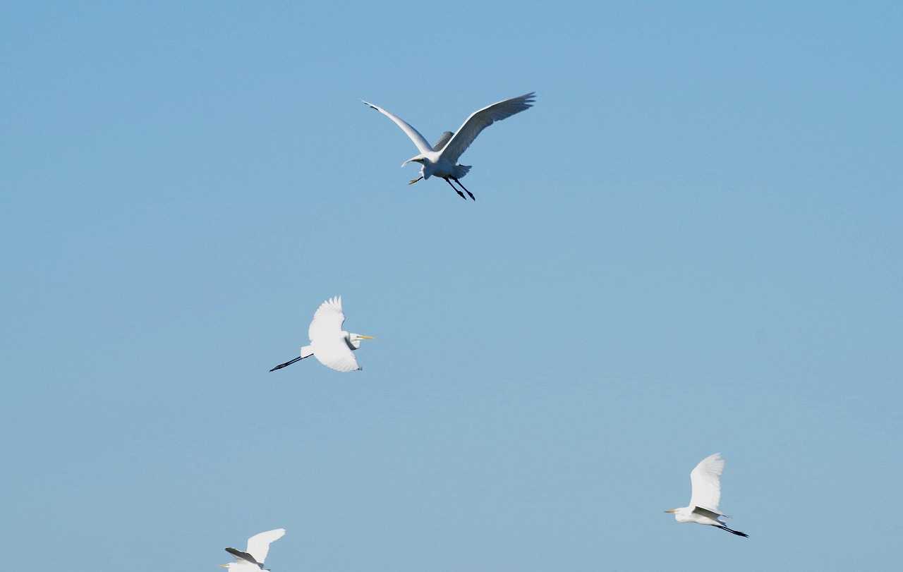糸島市の雷山川に集まっていたサギ類を写そうと、バイクを止めたら驚いたのか一斉に飛び立った。