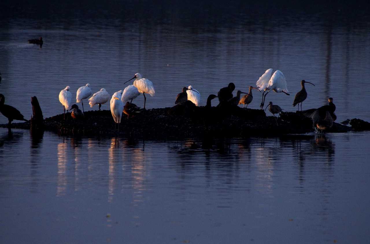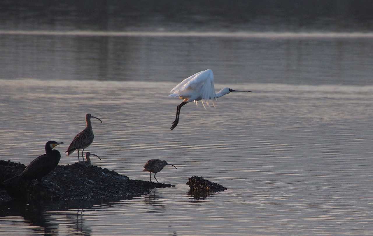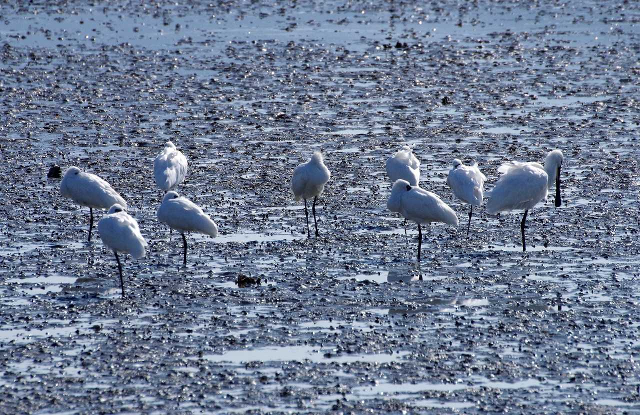 干潟のクロツラヘラサギとヘラサギ。