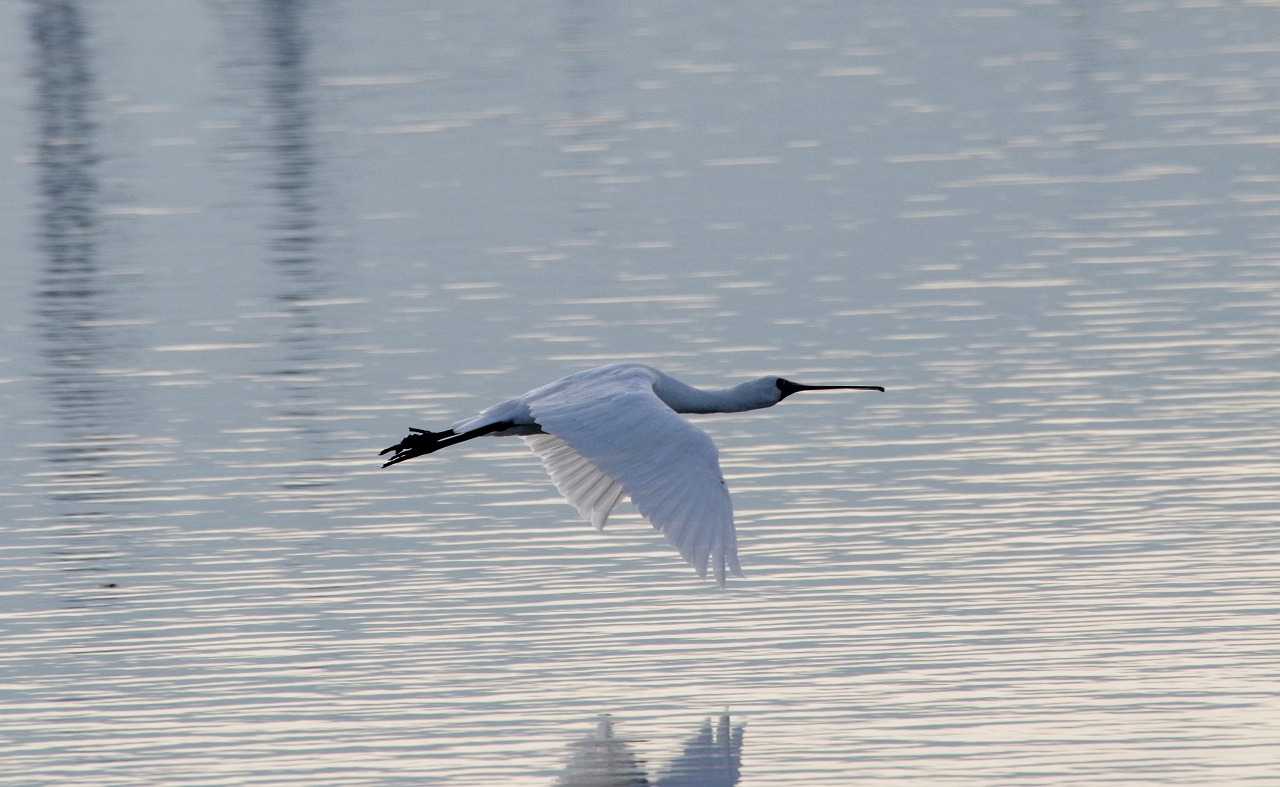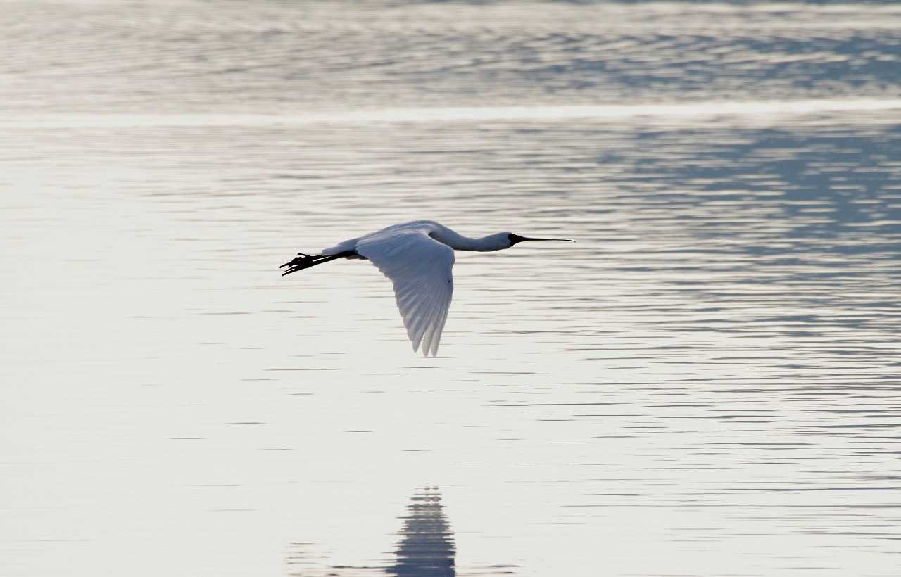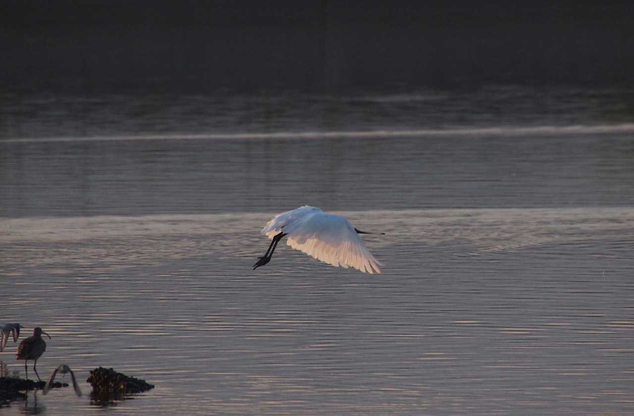 干潟のクロツラヘラサギとヘラサギ。