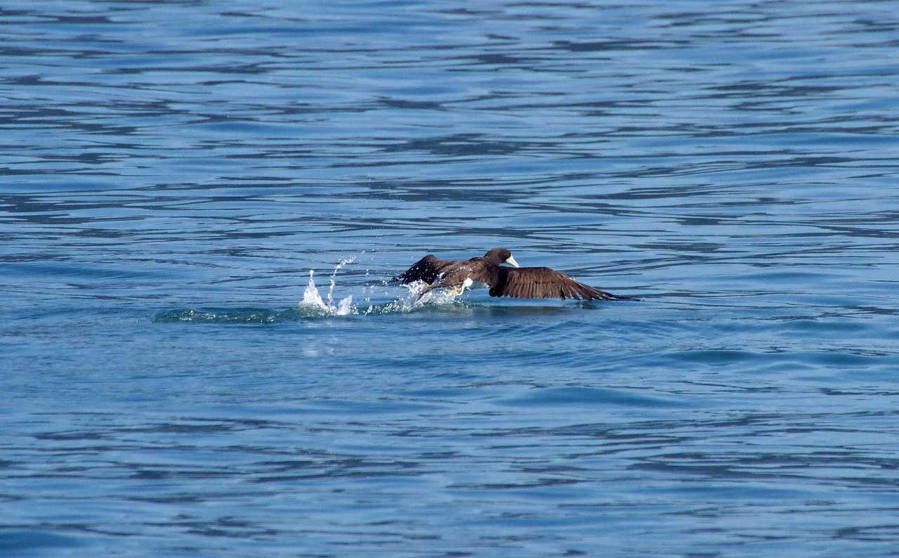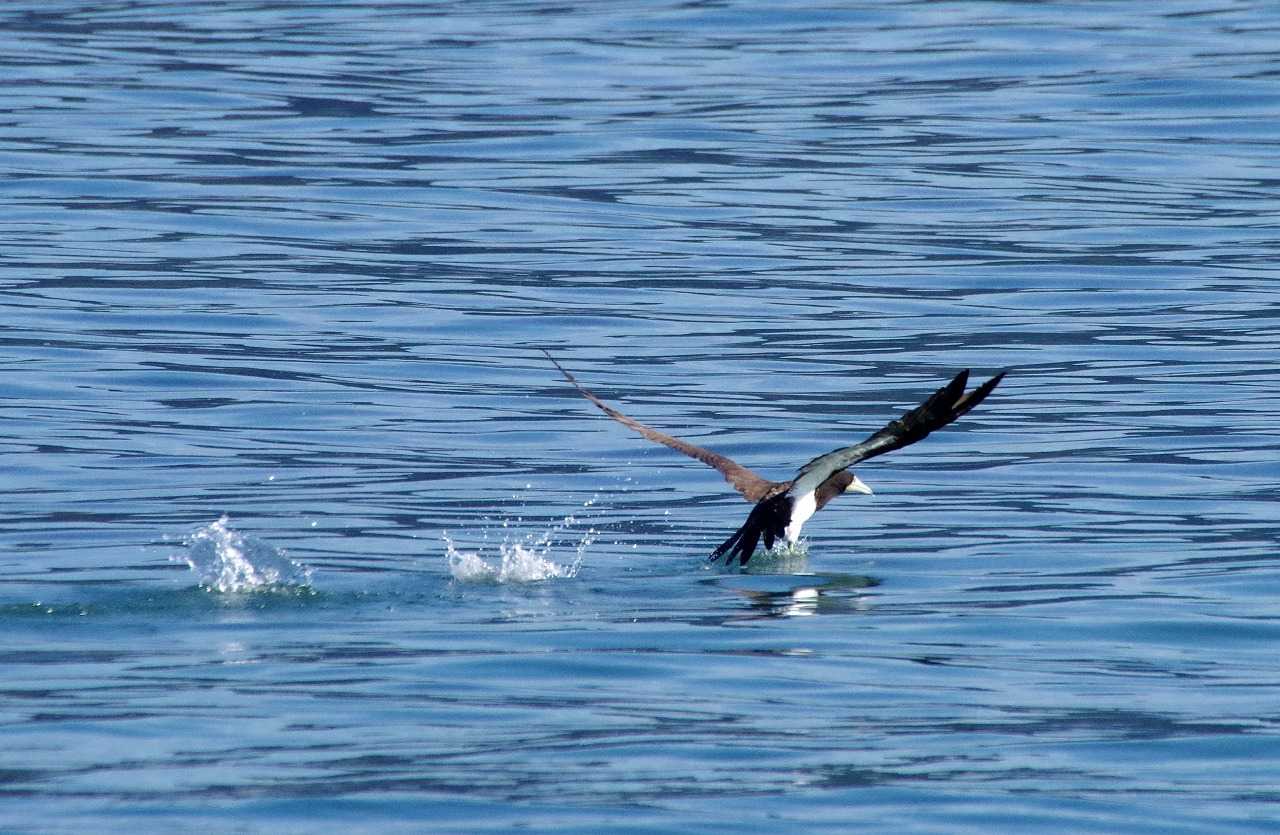 カツオドリの飛び立ちは両足で水を蹴る。ウも同じで、ハクチョウやガンは片足づつ水面を走るように飛び立つ。