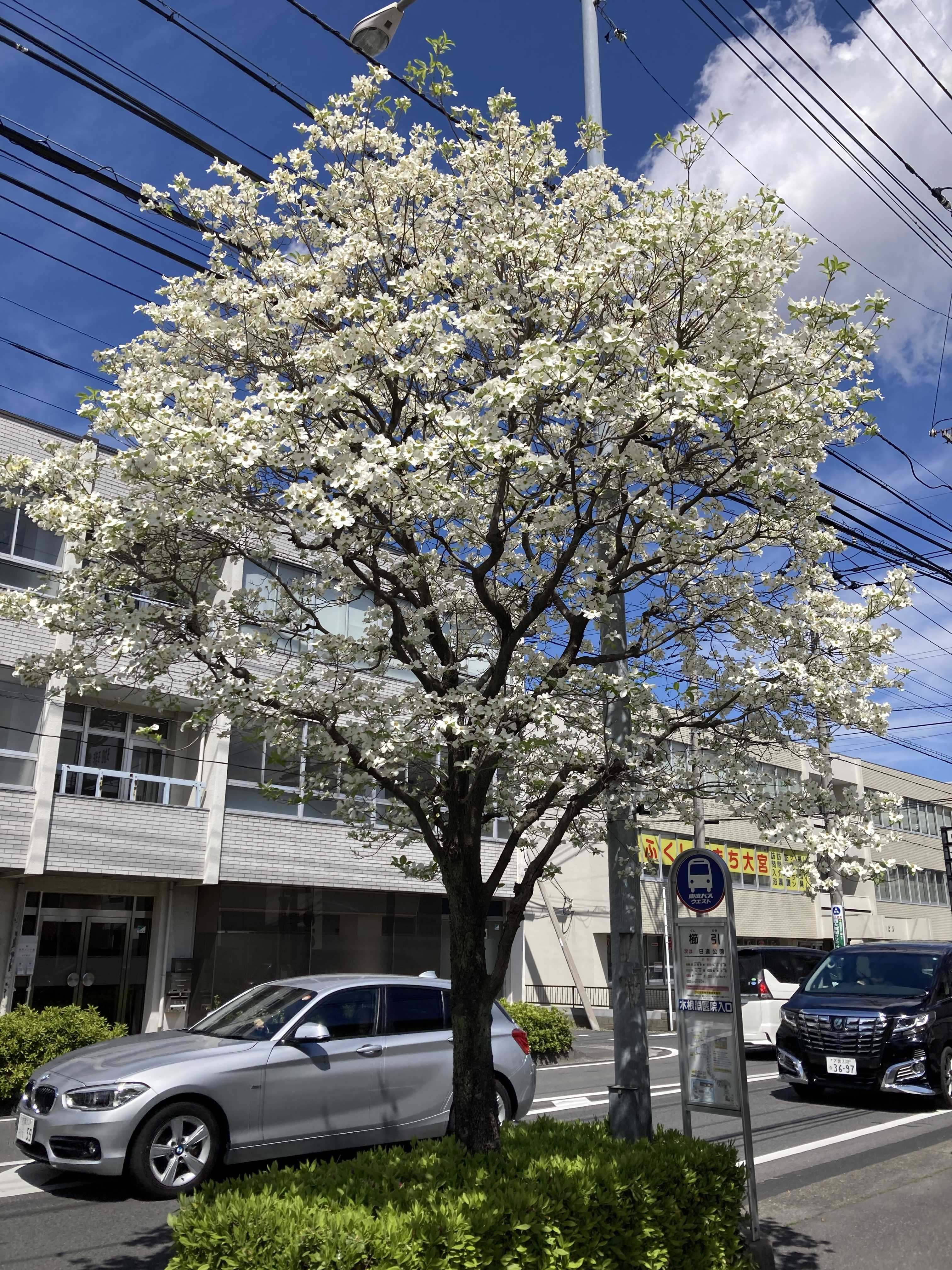 御近所の街路樹にハナミズキが咲き誇ってます、やっとこさ青空出たよ