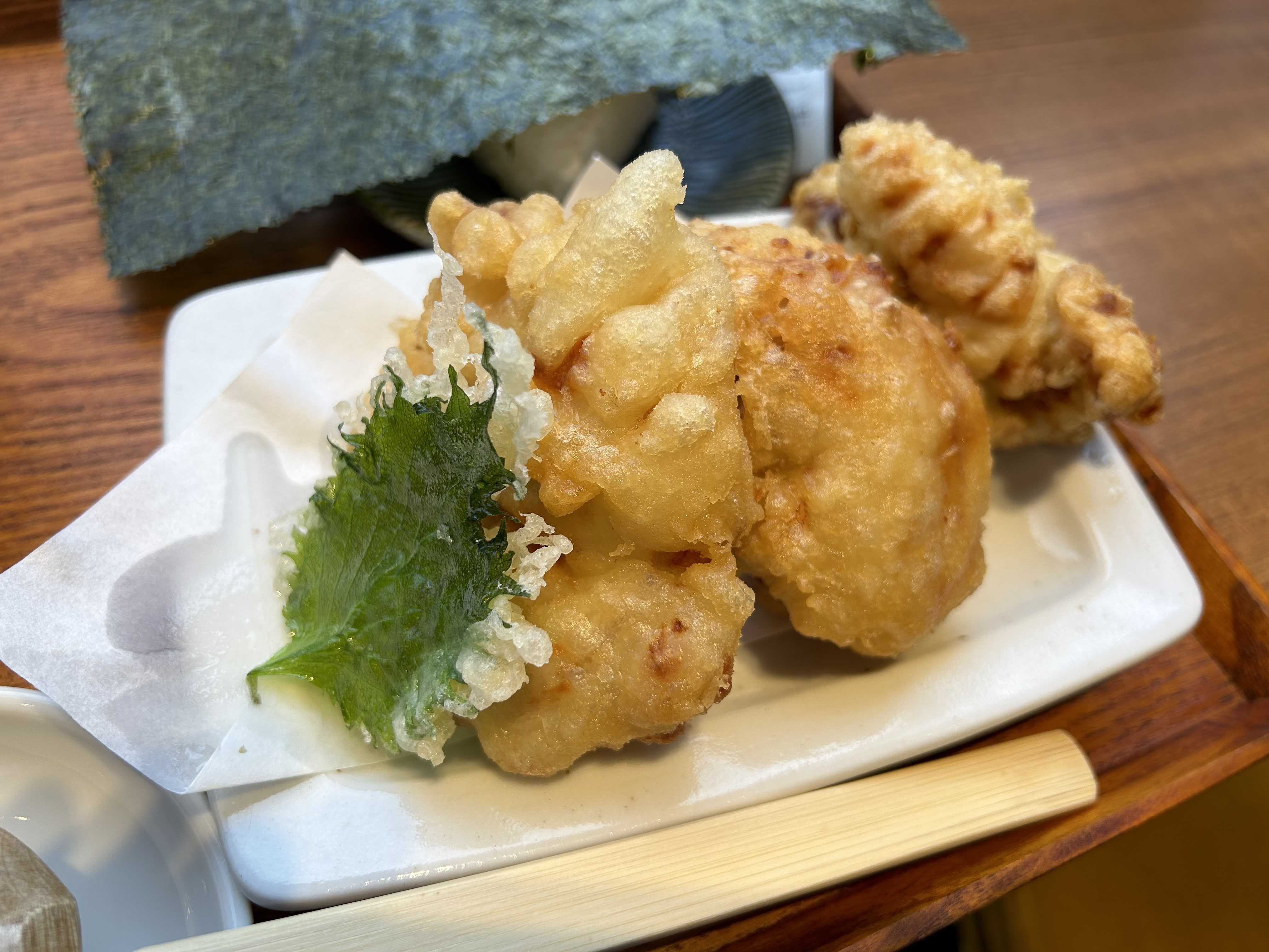 鶏天の衣が個性的でジューシーで大きくてうまー----!