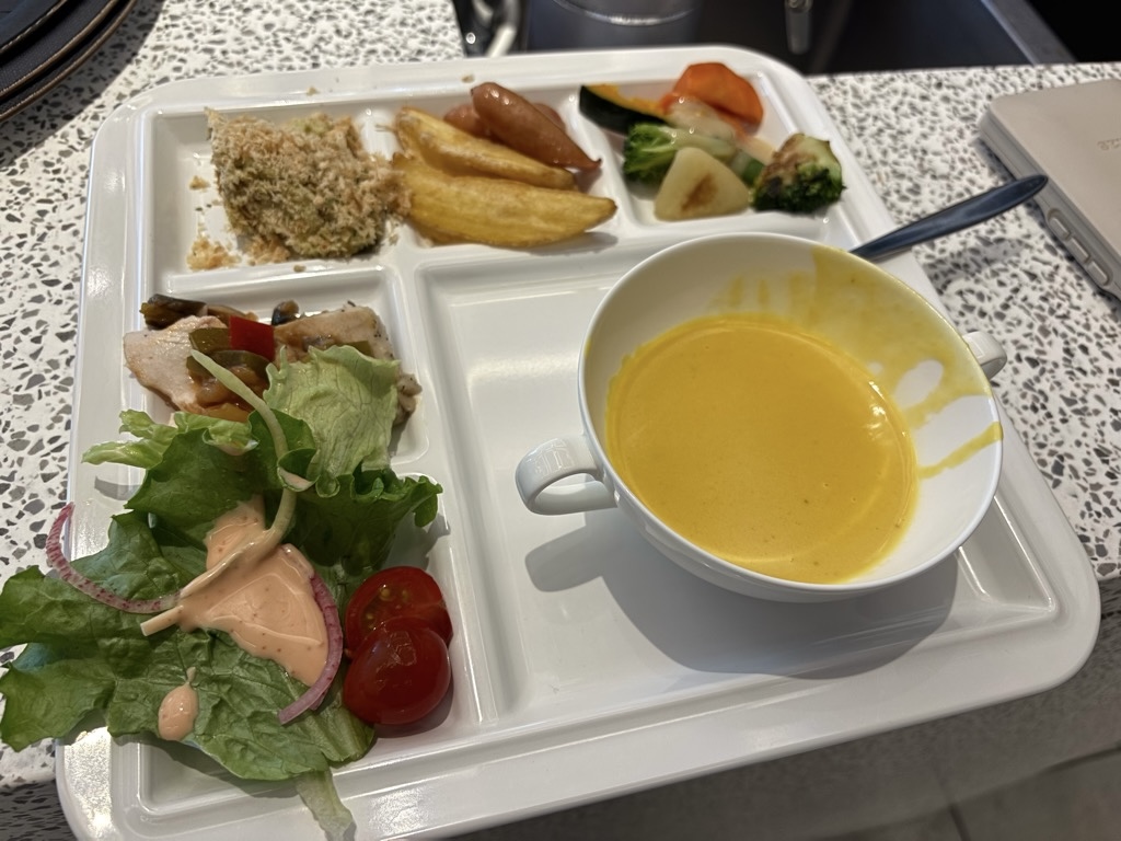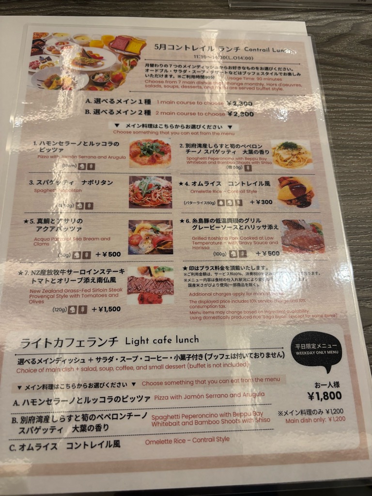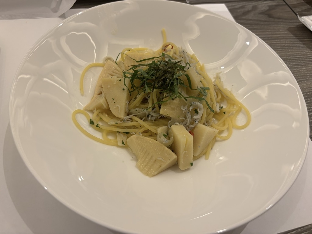 ビュッフェ付きでメイン一品選べるシステムです。メインは別府湾産しらすと筍のペペロンチーノスパゲッティ大葉の香りにしましたぜ!