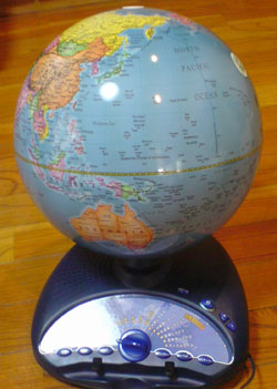 久々に楽しいものが当たったよo(^o^)oしゃべる地球儀、オデッセイグローブ♪見た目は普通の地球儀だけど、付属のペンで触るとおしゃべりします(^^)触れたところの国の国名、地名、首都、面積、人口、時間と曜日などなど~~おもしろいのはその国にまつわる音楽も奏でること♪国歌だったり、代表的な歌だったり~モードを替えるとクイズもできます♪言われた国をペンで触れるとピンポーン♪♪レベルを変えたり、メンバーを増やしたり~いい点が取れると「すごい!」「信じられない~!」とアナウンスしてくれます(;^_^Aこりゃしばらく遊べそうですぞよψ('ー'*) フフフフフこのオデッセイグローブ、おもちゃ屋さんで結構展示されているらしく、子どもたちはすでに知っていました(/_・)/