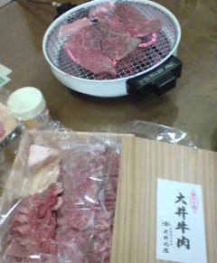 食べ物自慢が続いて申し訳ない。。。(;^_^A実家の母がお肉を送ってくれました\(^^@)/しかも、滅多にお目にかかれないような上等のお肉です。。。もったいない!m(__)mとろける風味がすばらしい!!大きさがすばらしい!!大井牛肉っていうのね?神戸牛の一種??焼き肉の網に3枚乗せたらもう乗りません。。。4枚食べたらもう入りません。満腹になりました。。( ̄~ ̄) 一家団欒、ごちそうさまでした((^へ^)vありがとう!