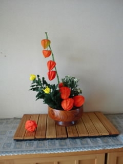 今日はがんばってもういっちょ!!お婆ちゃんに頼まれて、花を買いに行って、お盆なもんだから、菊とほおずきばっかり!んで、自己流に生けてみました~~~o(^o^)oまぁ、何でもアリよ!