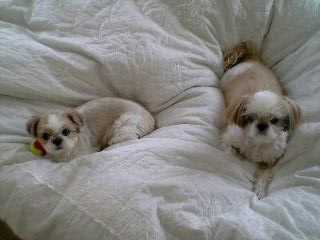 木曜日はトリミング。。。そろそろビーナも予約しなきゃ。。ふたりは違う美容院。。理由は。メルの顔をカットできるのは病院の付属のトリミングだけだから。。普段看護婦さんをやってるお姉さんがカットを。。。顔を触らせるのはその人のところだけ???いったいどうやってるのか?正直、あのあばれっこの顔を触るなんて???恐怖・・・普段はとてもいい子なんだけど小さいとき別のトリーマーさんにたたかれてけがをしてか。。なにせ顔を触ると気が狂ったようにかむんです。。でだれも彼女をかっとできなくて。 なぜか病院の先生だけの前ではおとなしくて、どこを触ってもなにもいわない。。それもある先生だけ。。。正直あまり心底動物を愛してるとは思えない先生なので本当はかわりたいんだけどしかたなくって。。(最近先生がまるくなったのかちょっと優しくなって少しほっとしてますが)そこでビーナはきたときからほかでお世話になってます。優しい、無駄な薬はできるだけやめましょという方針の先生。いつも、診察が終わると、がんばったねーーーいい子でしたねと頭をなぜてくれる。。それでトリミングも、メルが散歩のとき何があってもその店の前から動かない。。。店長さんに挨拶したいから、シャッターが閉まってるときも踏ん張って動かない。。その店でビーナはトリミング。。本当はメルモここが良いんだけど・・・店長さんはシーズーを飼っていて、二人ともよくしてもらってます。。。。さて、昨日暴れ料金500円追加でとられたメル。今回は目のまわりがひどかったのでつんつんにしておいてと頼んだばかりに、、ちょっと貧相になってしまった。疲れ果てて昨日は写真もとらせてくれませんでした。ビーはというとお留守番イヤーーーーーってわけで会社に連れて行ってもらってたみたいです。。(自称パパさんが)同じく疲れ果ててぐっすり。。。ビーナは興奮して楽しかったようで、寝言でほえてました。。。さて、二人の様子です、。。。。