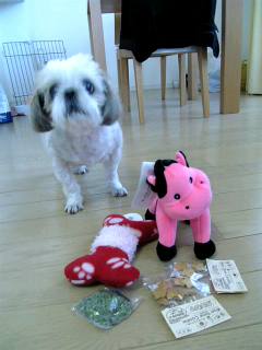 メルの13歳の誕生日。。。ぷーたんままメッセージとプレゼントありがとう!!残念ながらバンダナはメルハおでぶーーなのでビーに。。。。もう大興奮で。。。今から仕事なのにあけろーーーって。。散歩パスして。。。また書き込みますねーー!ママさんありがと!メル バンダナもらっちゃった!おやつちょうだいよーーー。