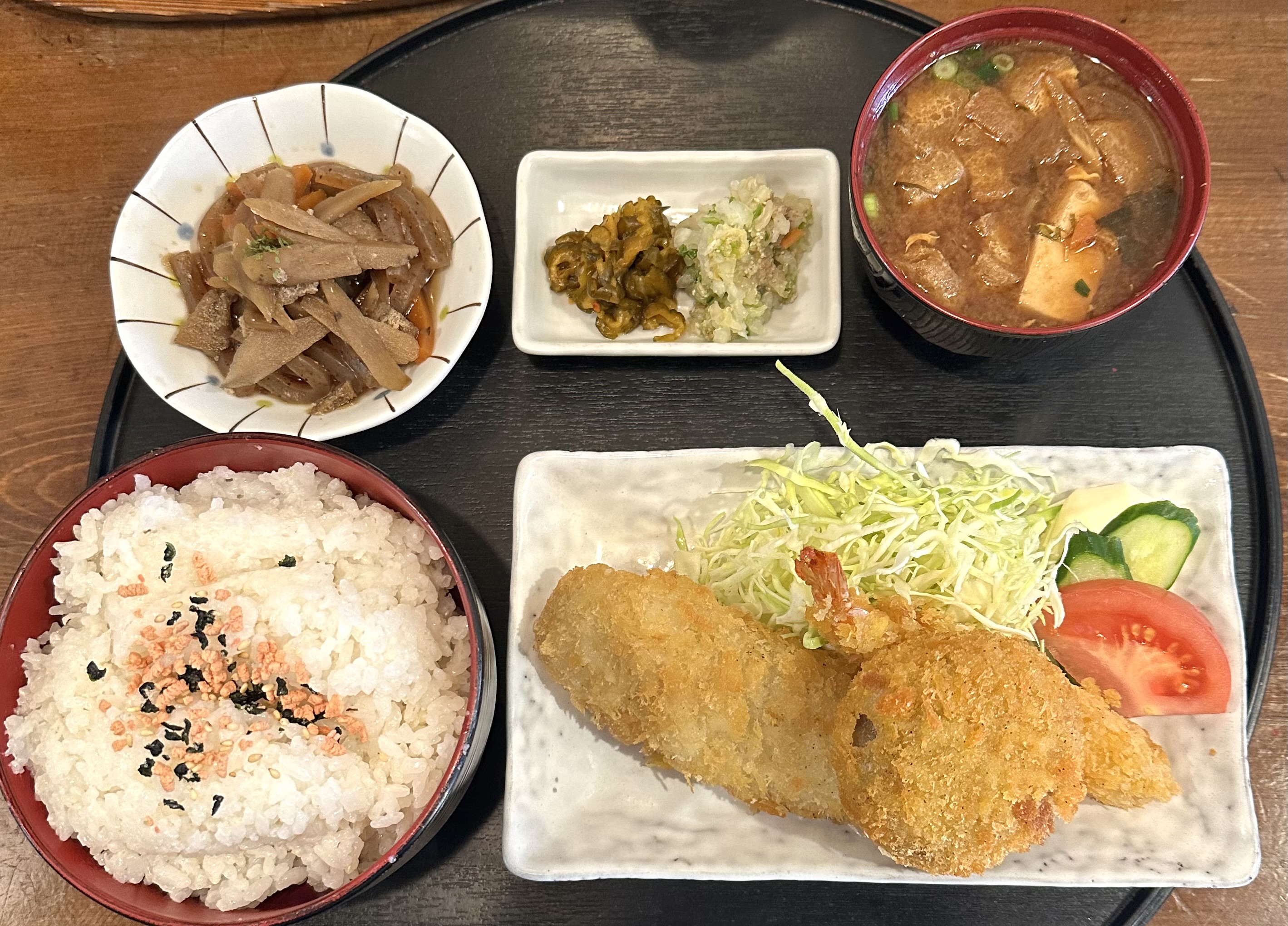 朝はフルグラ、昼はミックスフライ(えび、白身魚、メンチカツ)定食夜はパリパリ麺サラダ+焼き鳥