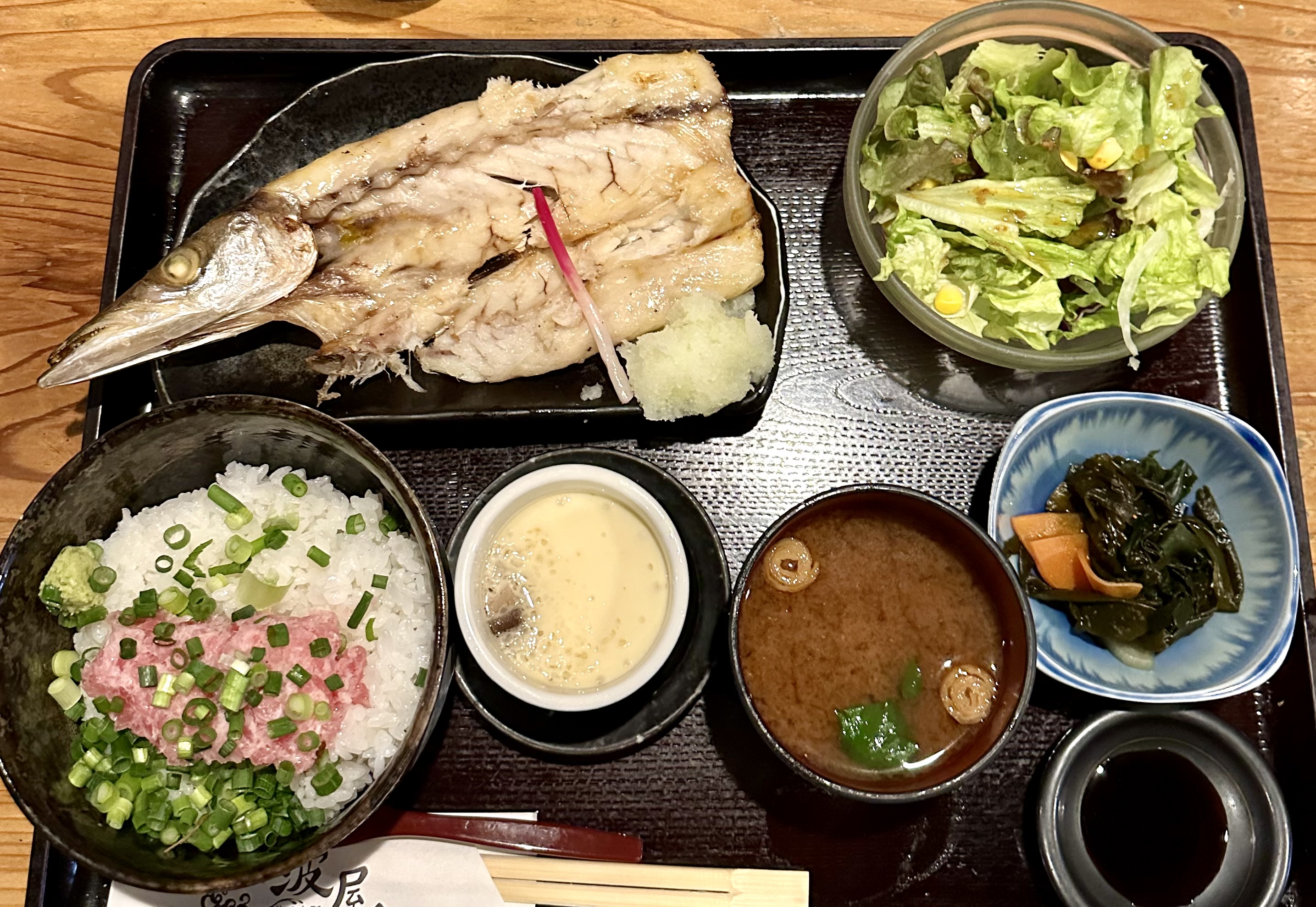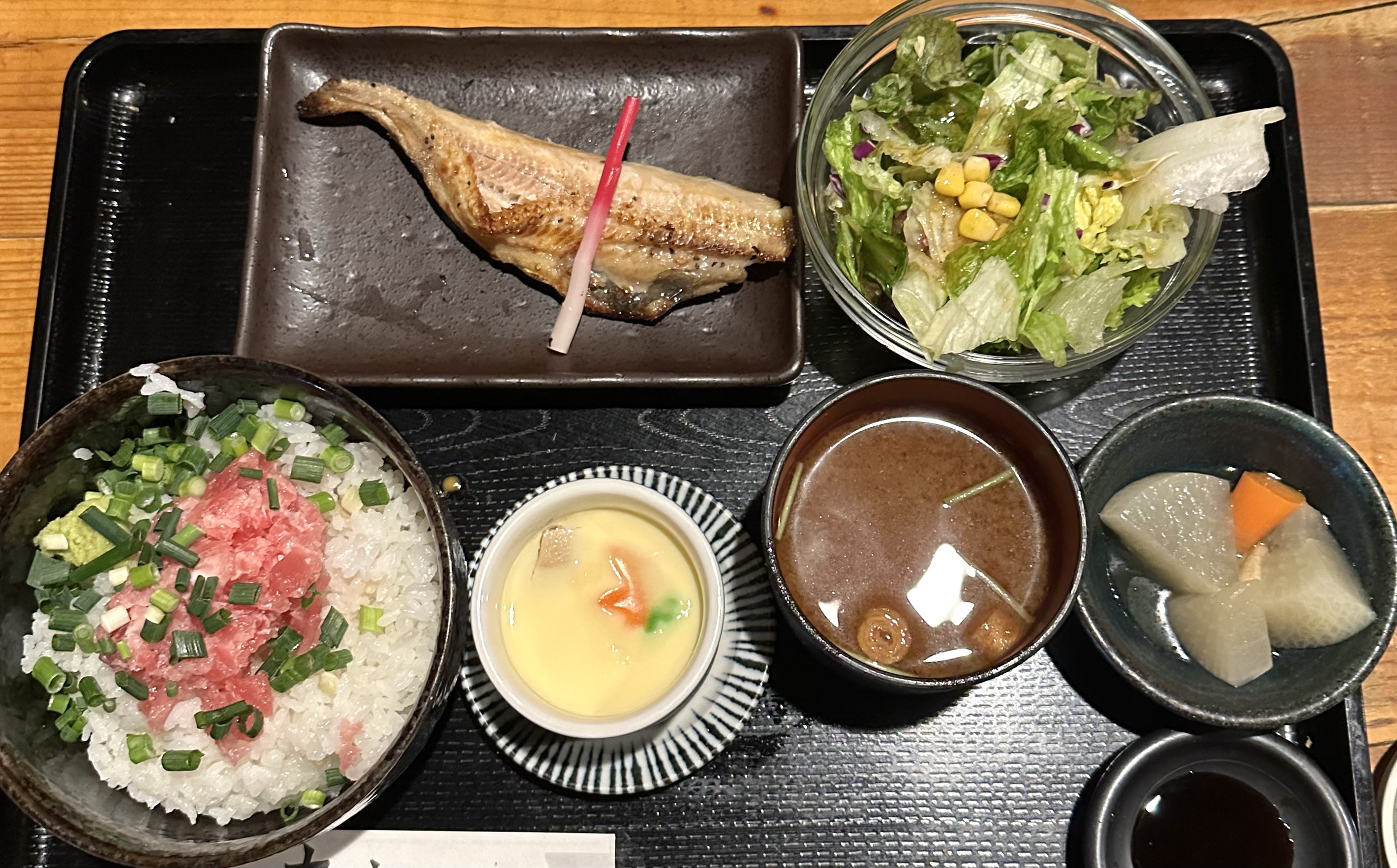 朝はフルグラ、昼はしまホッケのネギ塩焼き+ネギトロ丼定食夜はお弁当(十八穀ご飯と大豆ミートバーグの野菜ロコモコ)+納豆