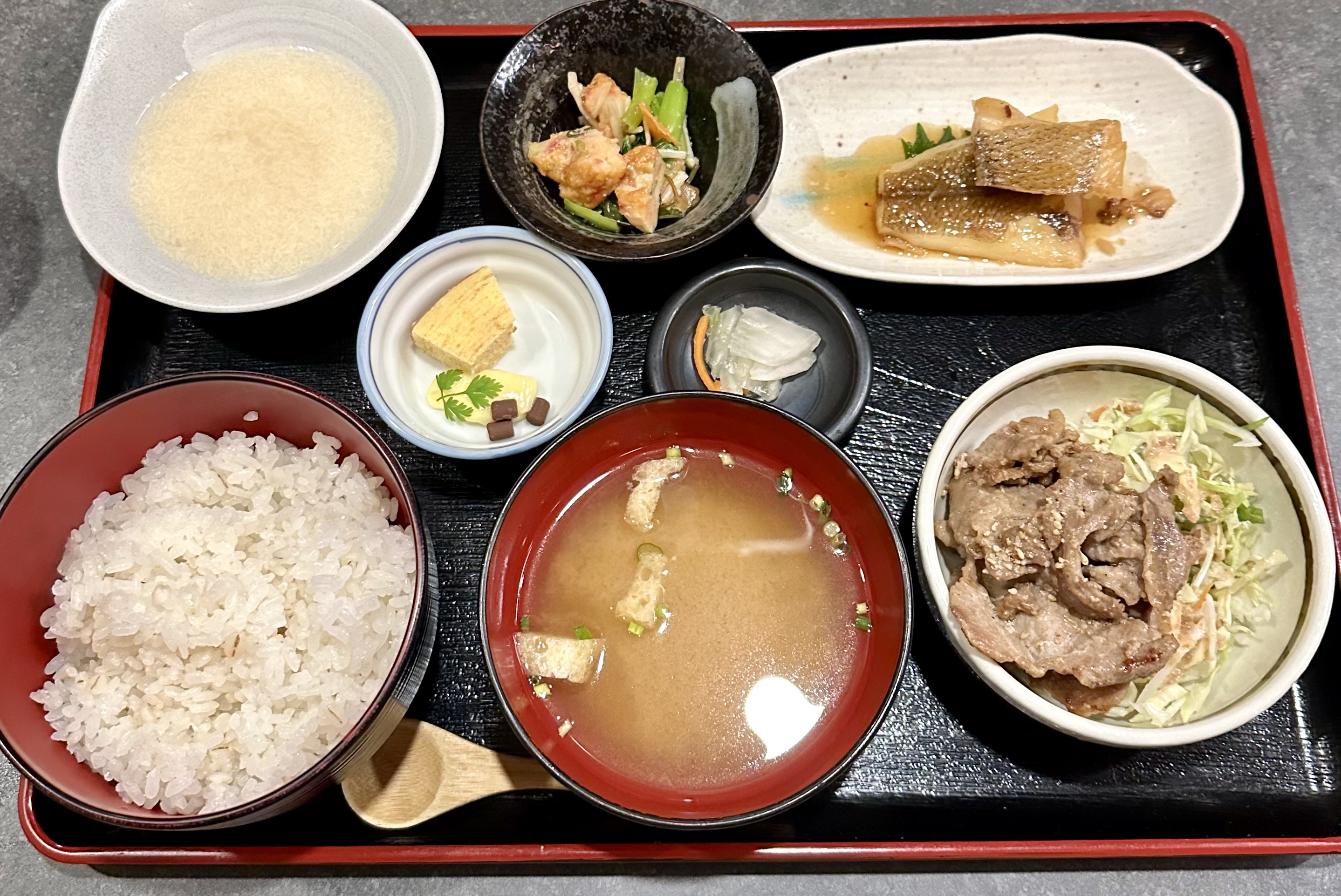 朝はフルグラ、昼は定食(もち豚の辛味噌炒め+白身魚の田舎煮付け+とろろ麦ご飯)夜は牛すき鍋膳