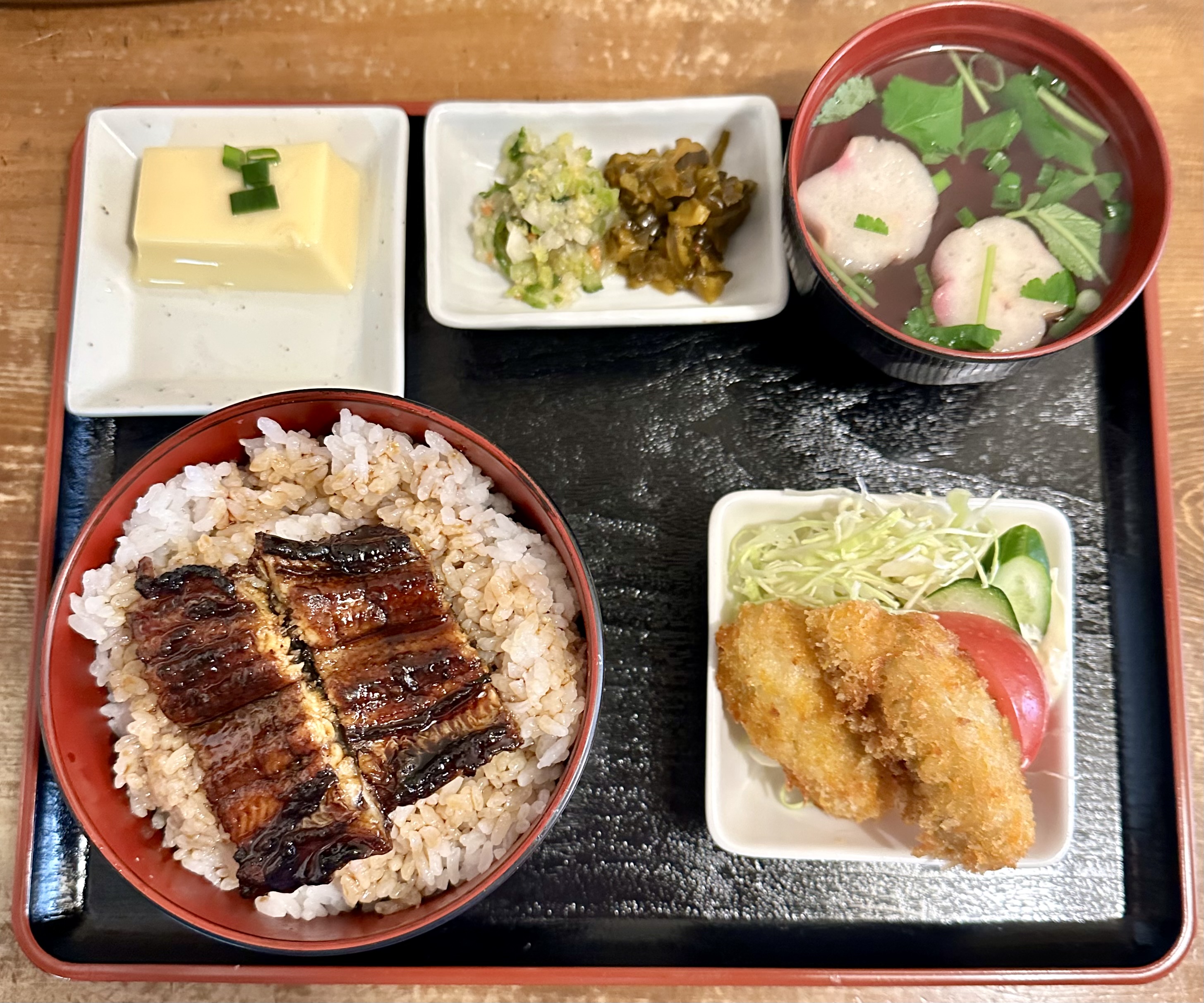 朝はフルグラ+ヨーグルト、昼はうなぎ+カキフライ定食夜はスパゲティ(ミートソース)+ガーリックトースト+サラダ